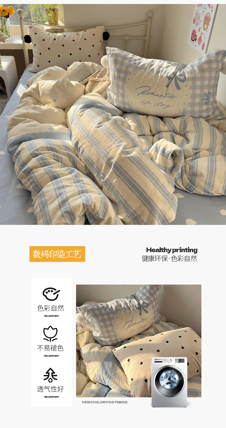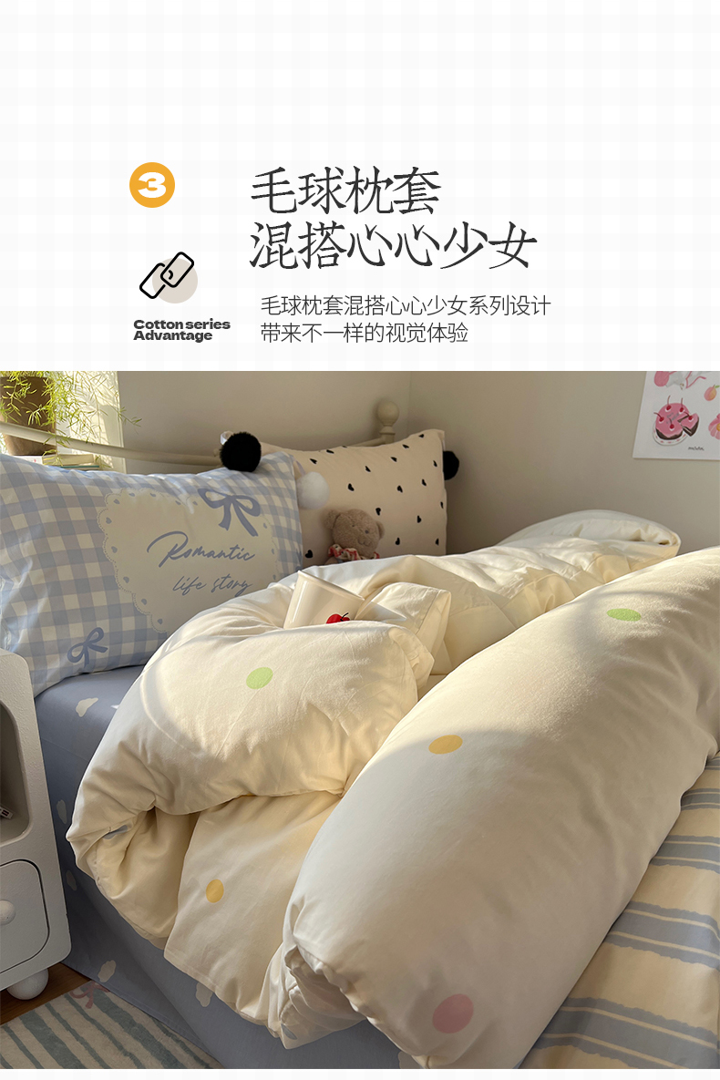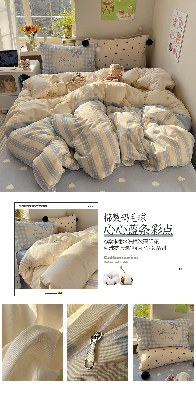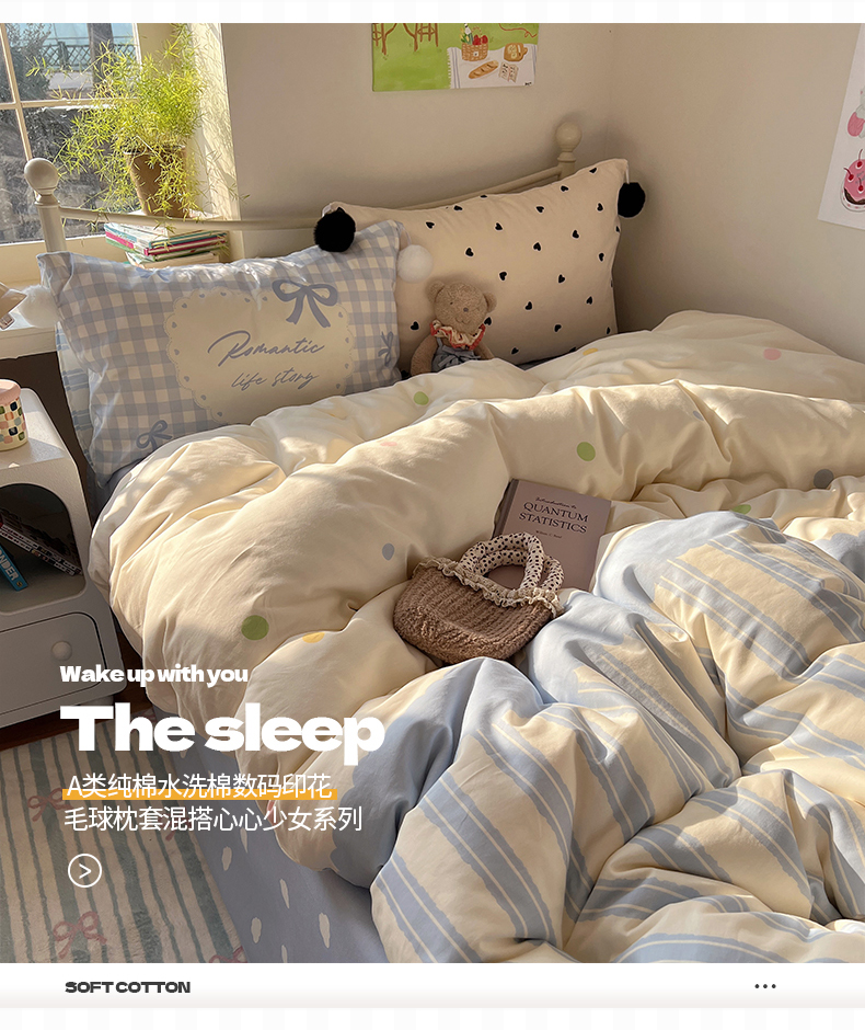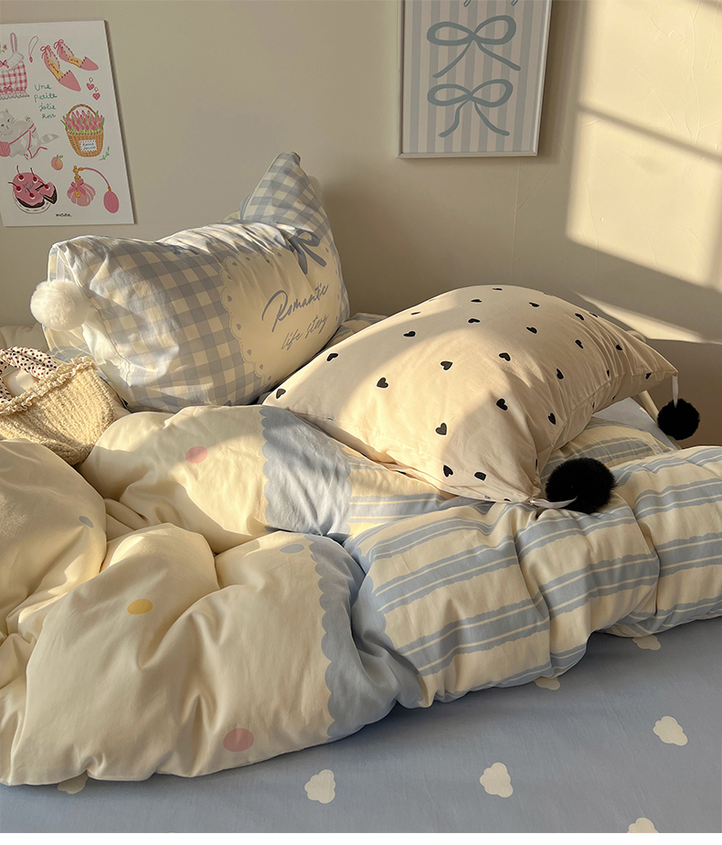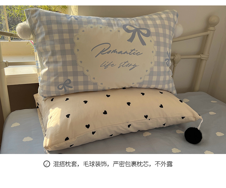 当前位置: 91家纺网 > 商品网购 > 床品套件 > 四件套 > 全棉普通四件套 > 2025新款A类水洗棉数码印花毛球枕套混搭心心少女纯棉水洗棉系列四件套 棉数码毛球-心心蓝条彩点