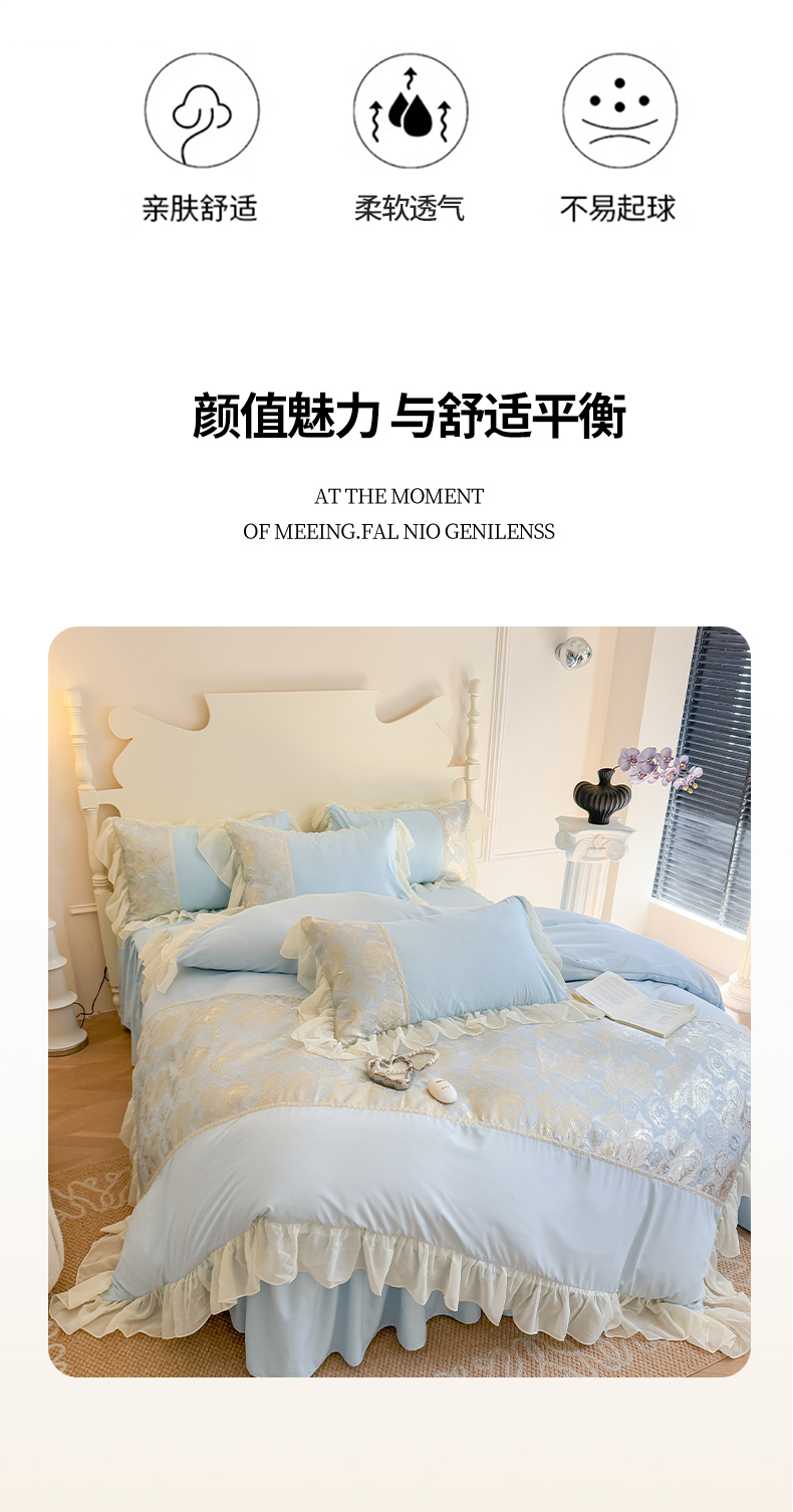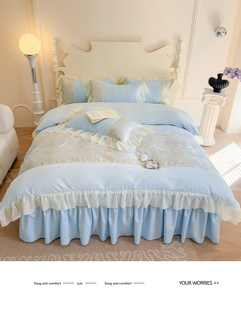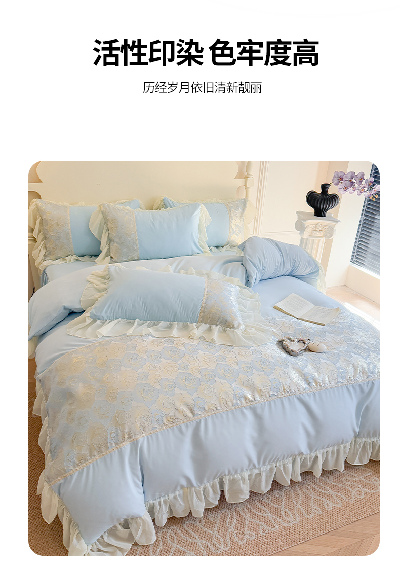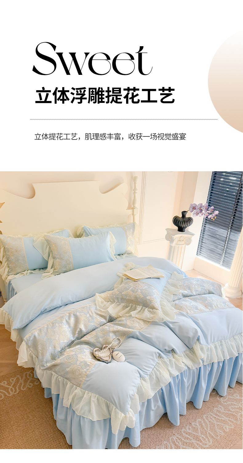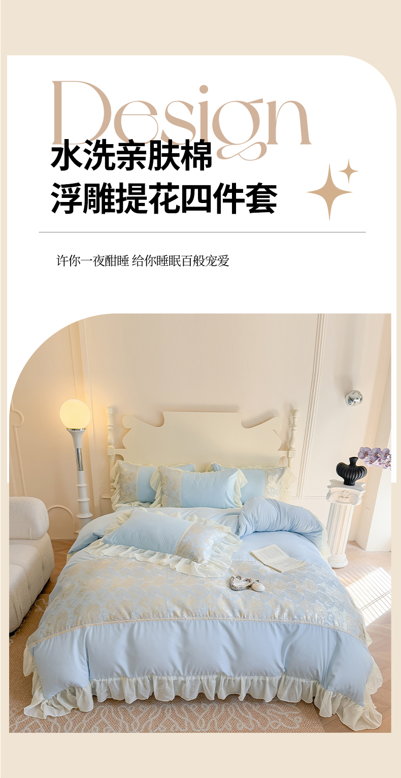 当前位置: 91家纺网 > 商品网购 > 床品套件 > 四件套 > 全棉普通四件套 > 富盛 2025新款水洗亲肤棉浮雕提花公主风四件套 月光恋人-蓝