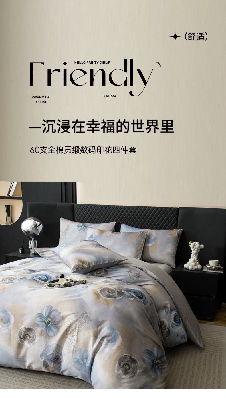 当前位置: 91家纺网 > 商品网购 > 床品套件 > 四件套 > 其它四件套 > 氧家 2025新款60s贡缎长绒棉数码印花四件套(礼盒装) 芙贝拉