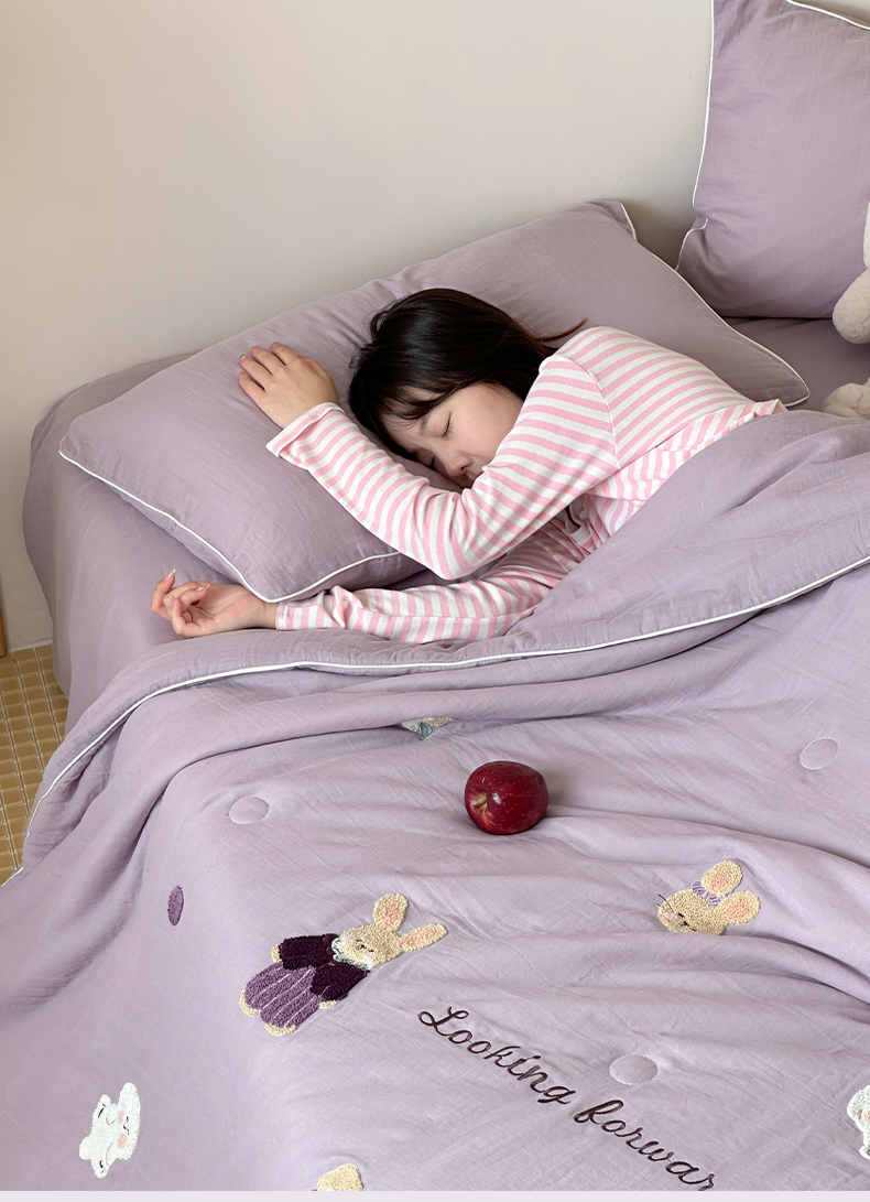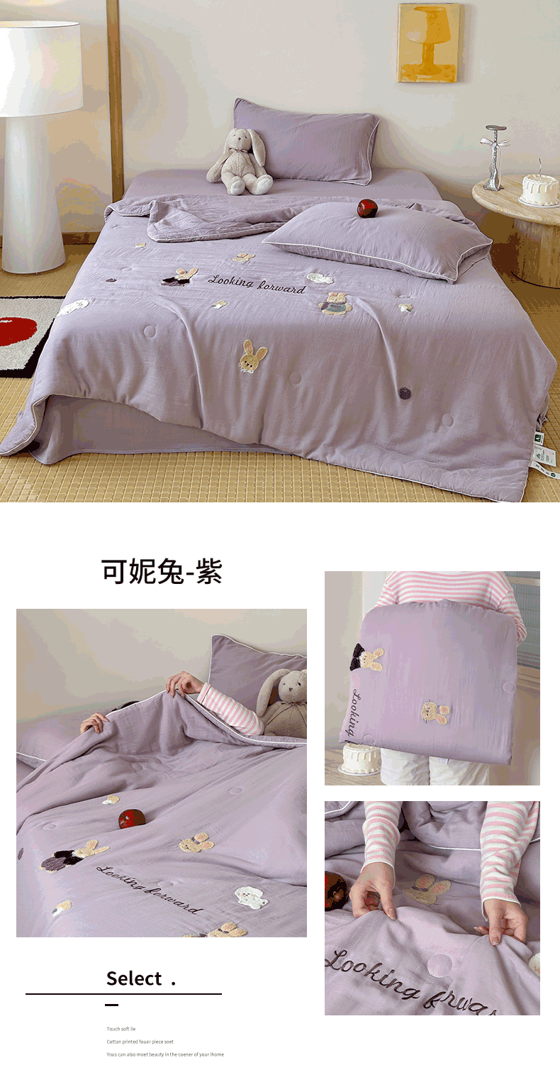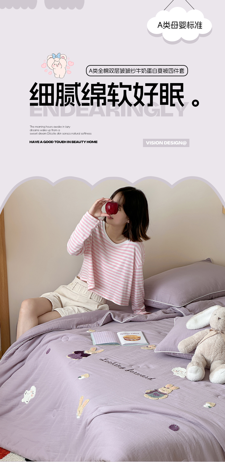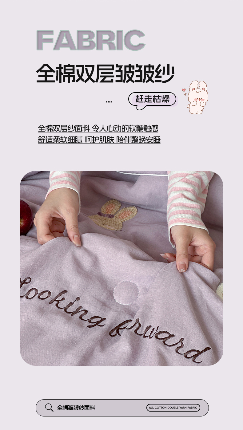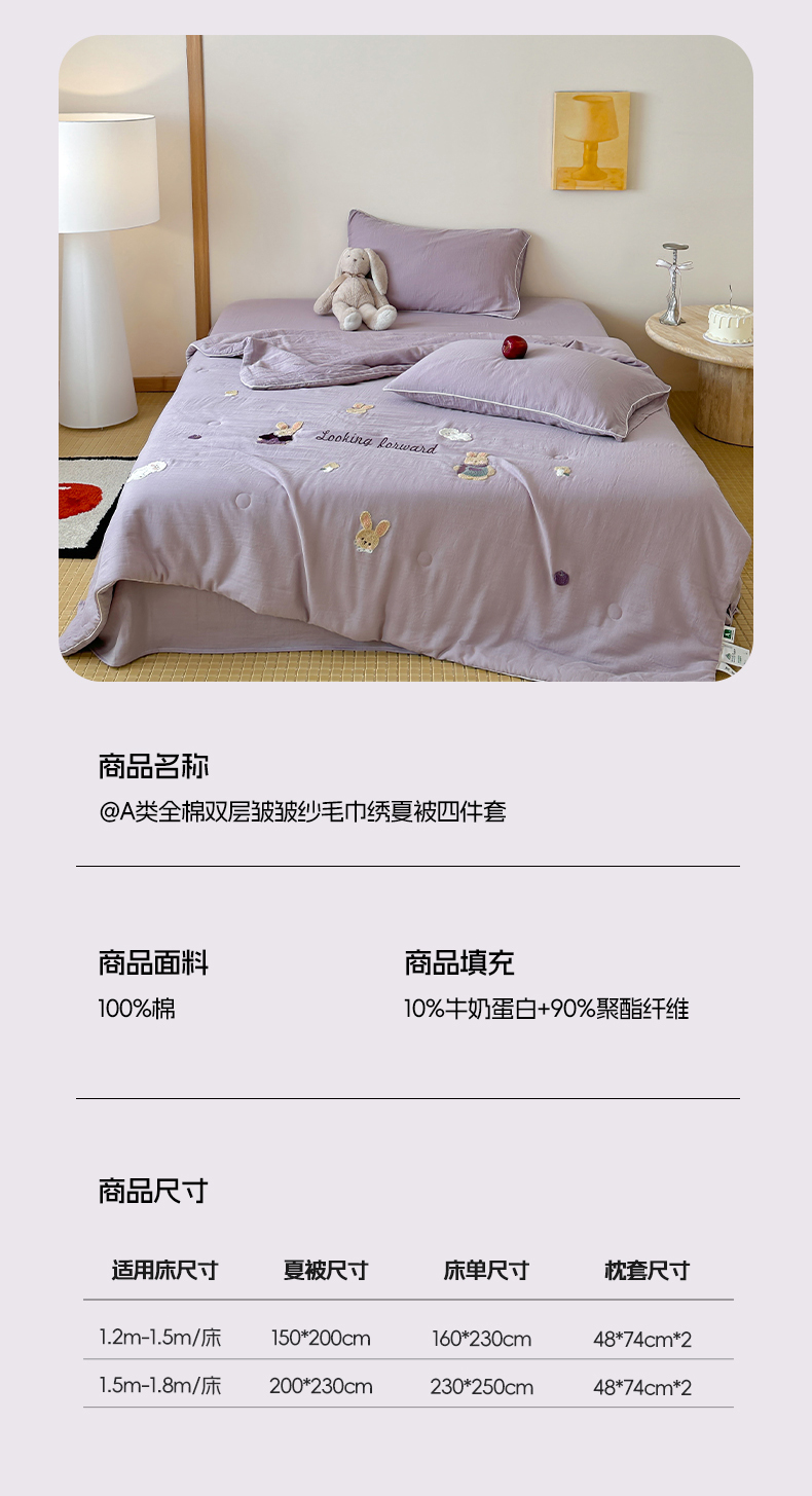当前位置: 91家纺网 > 商品网购 > 床品套件 > 四件套 > 夏被四件套 > 一加一 2025新款A类全棉双层纱皱皱纱毛巾绣夏被四件套(可妮兔系列) 可妮兔-紫