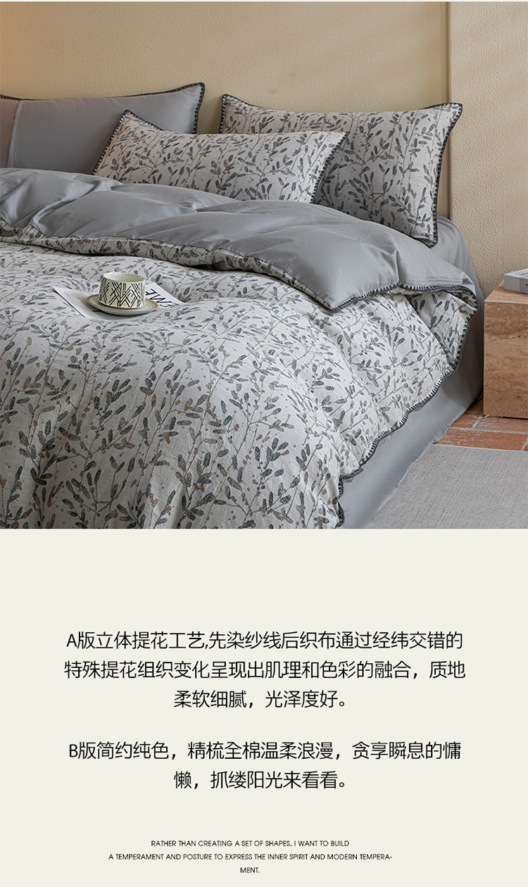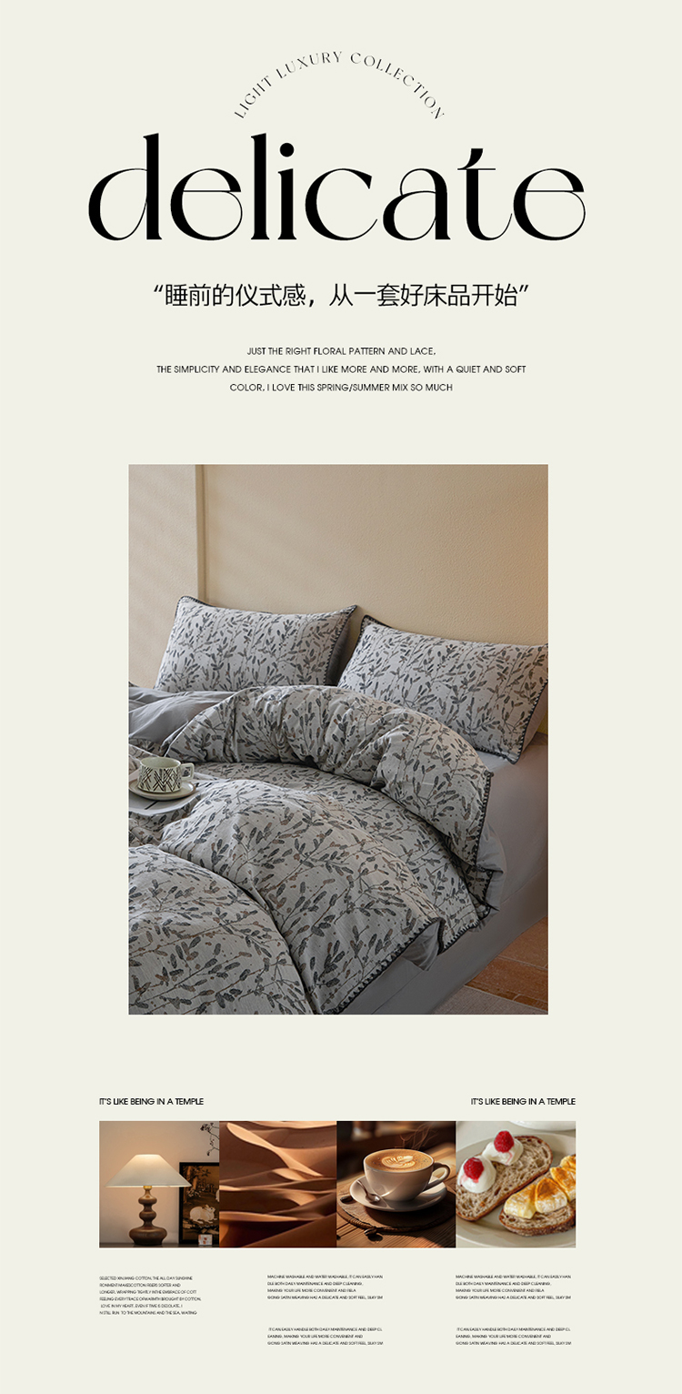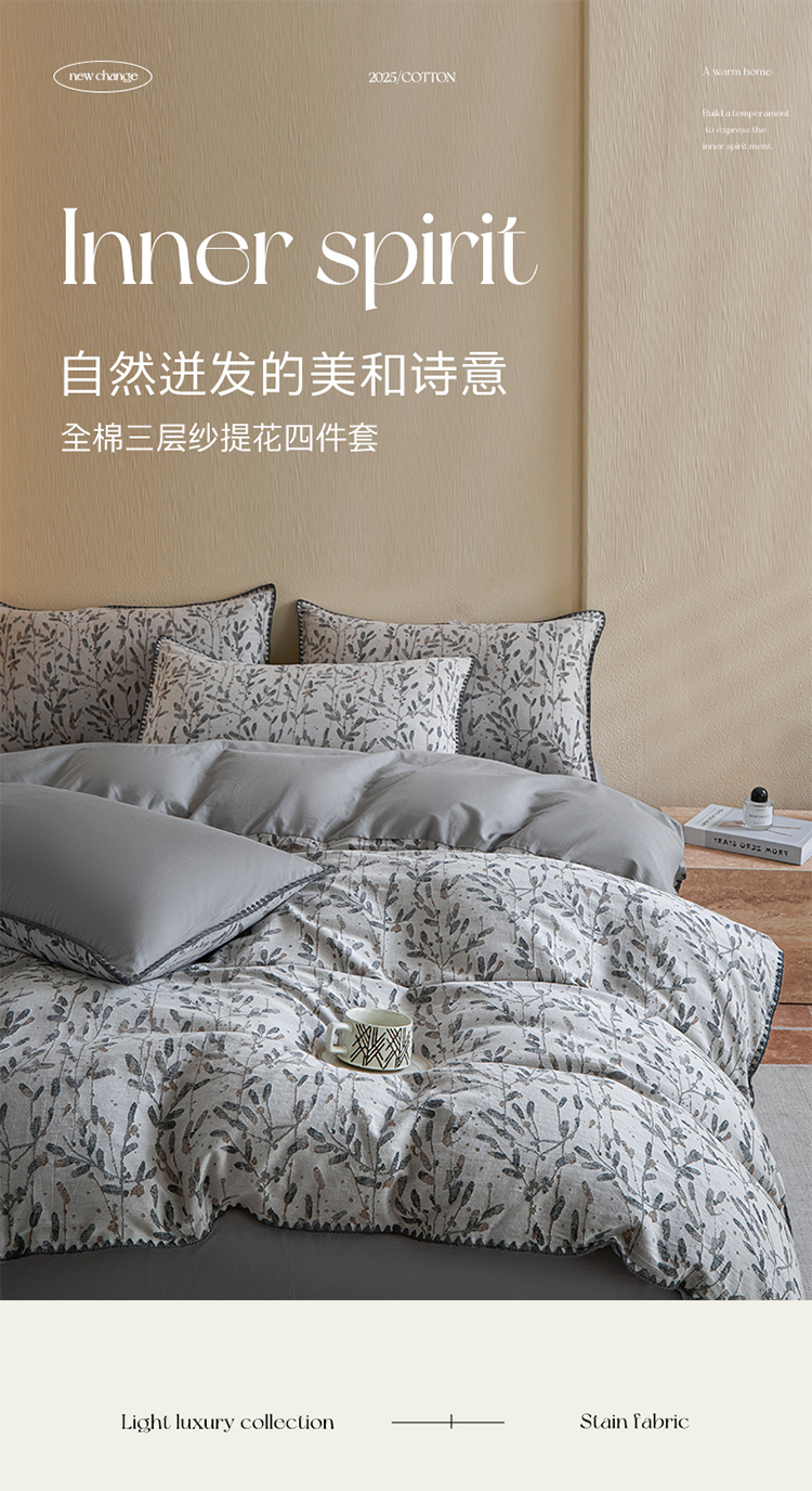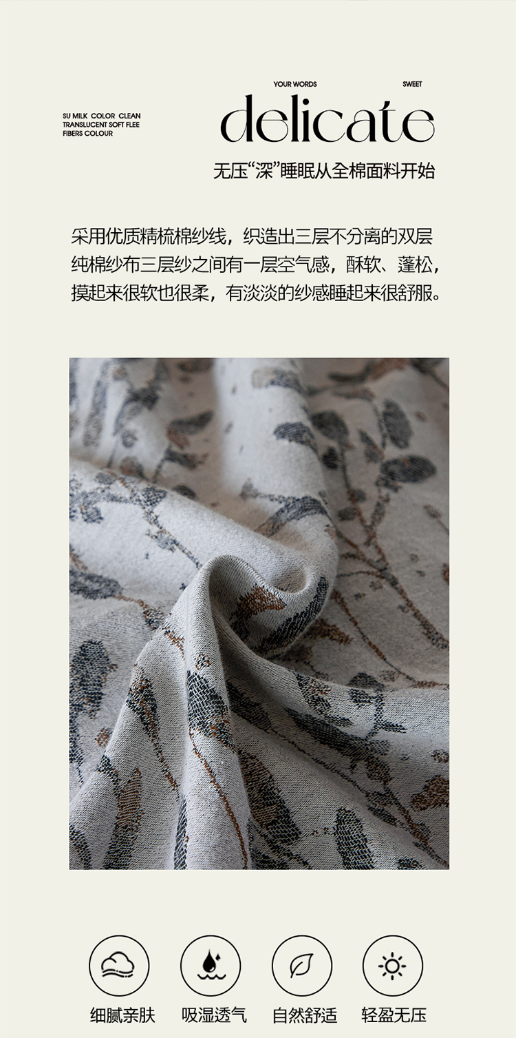 2025新款亲肤全棉三层纱提花四件套 叶语-嫩灰