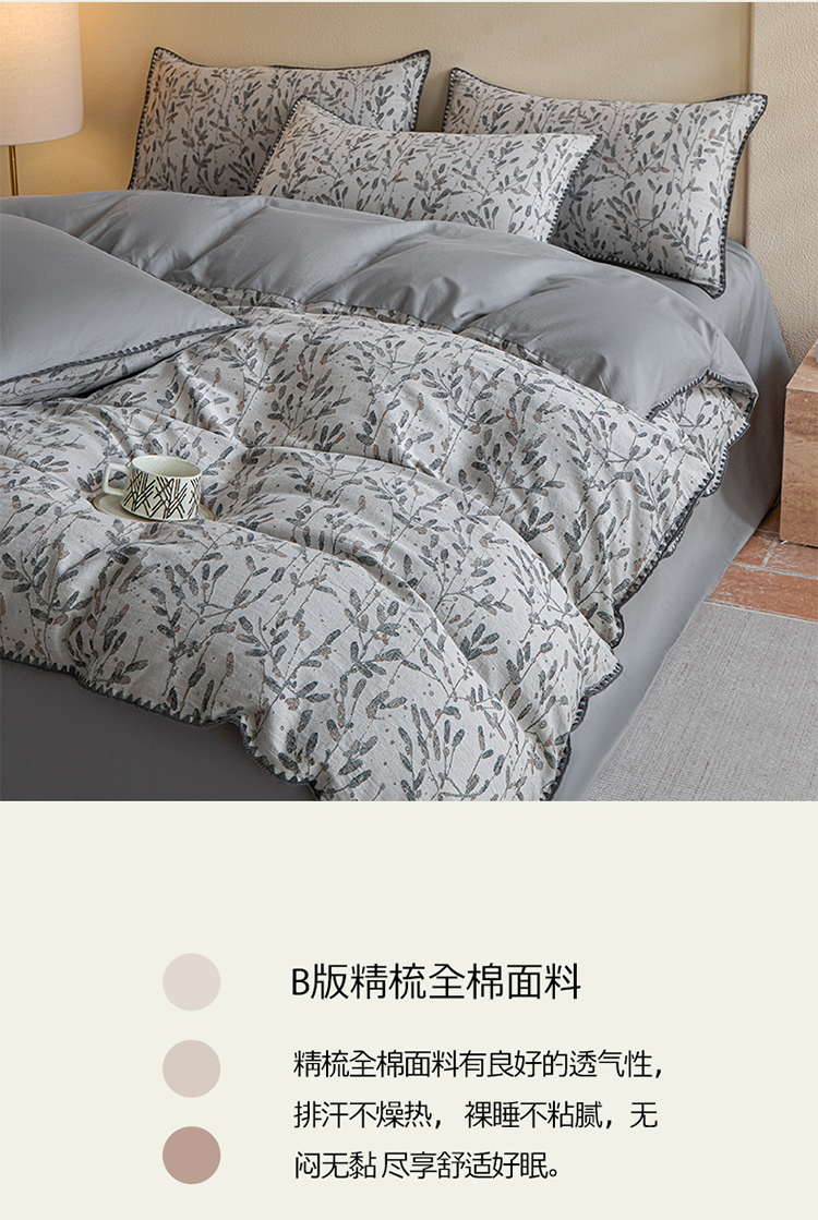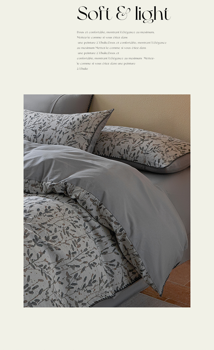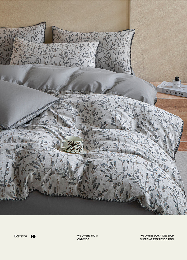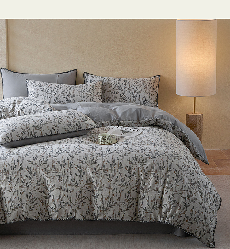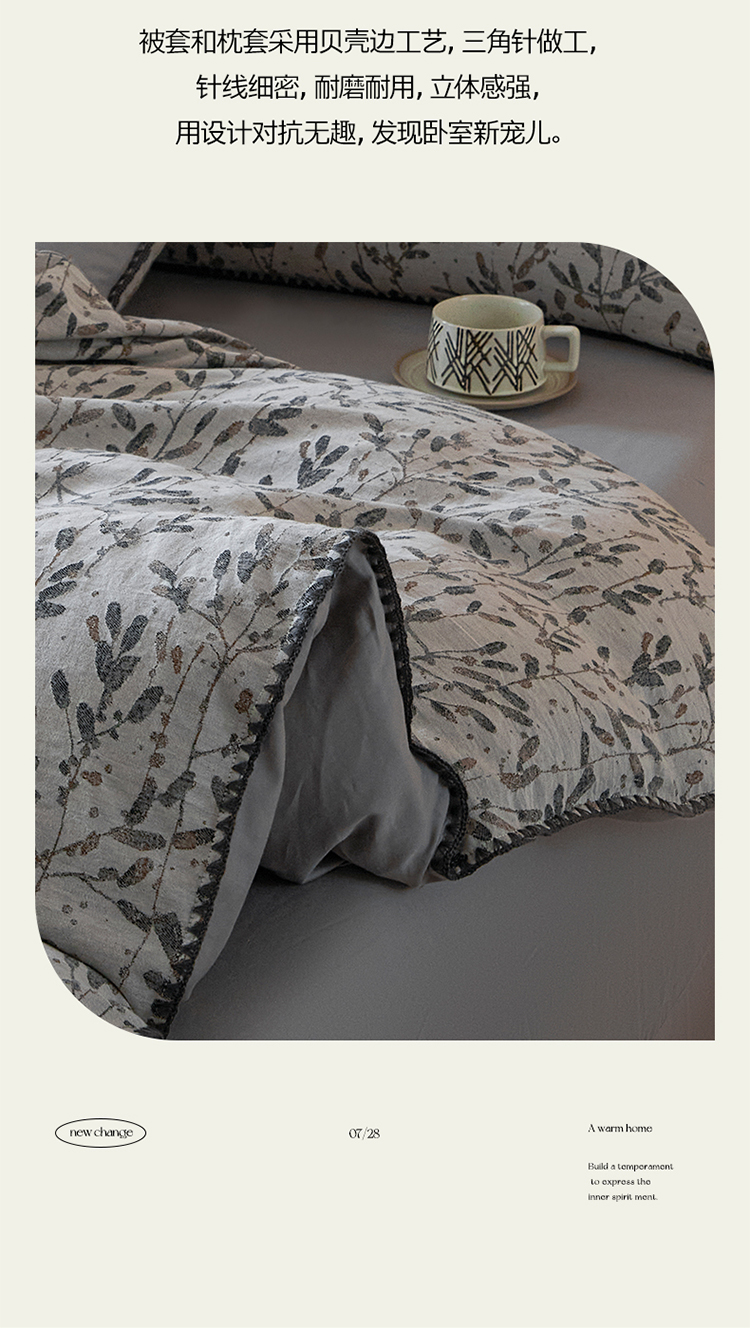 2025新款亲肤全棉三层纱提花四件套 叶语-嫩灰