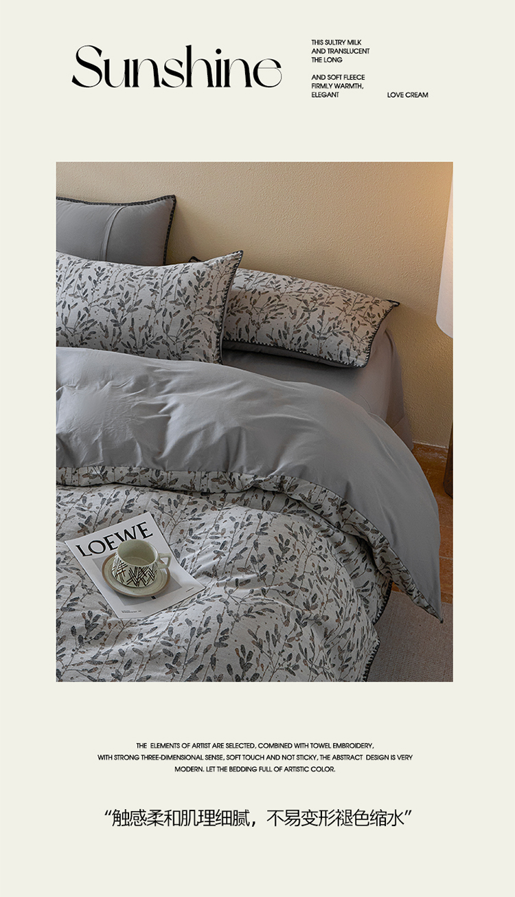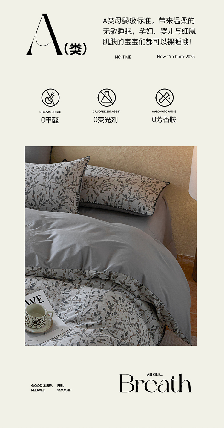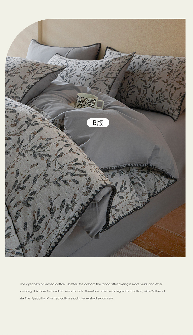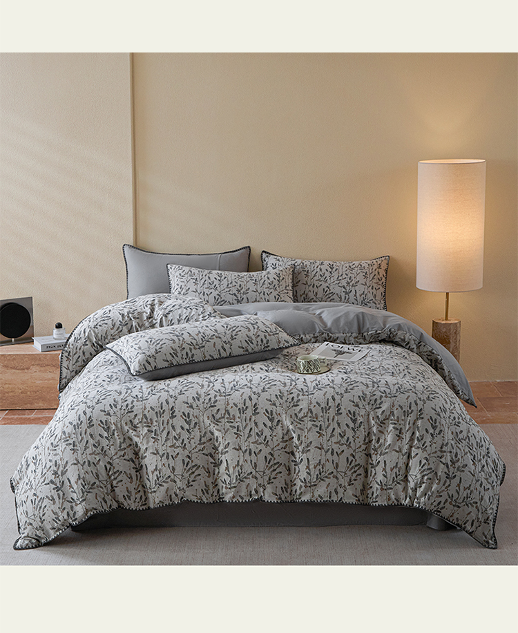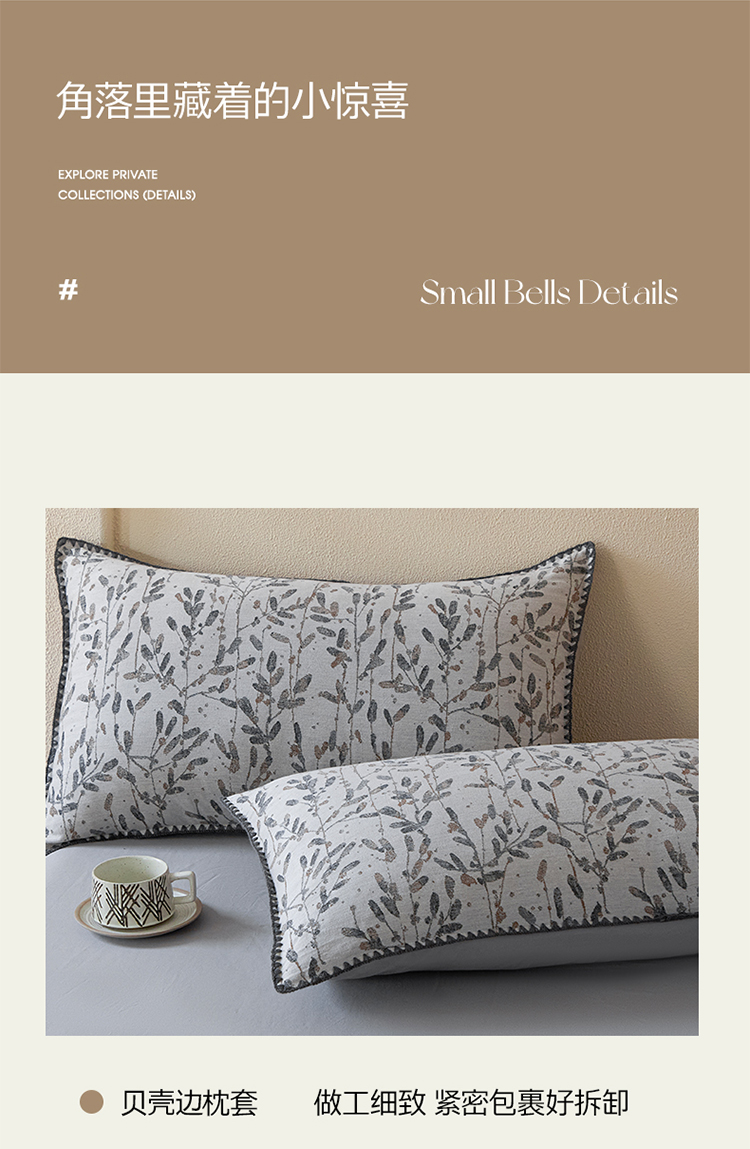 2025新款亲肤全棉三层纱提花四件套 叶语-嫩灰