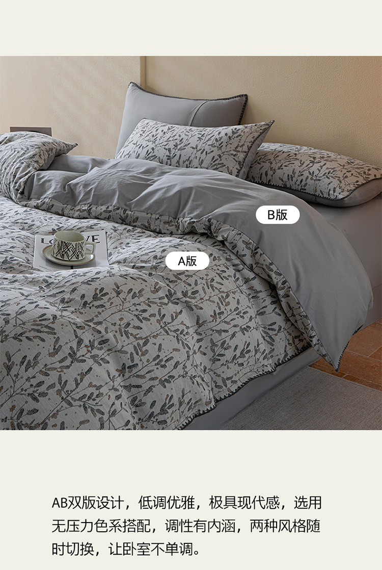 商品名称:2025新款亲肤全棉三层纱提花四件套 叶语-嫩灰