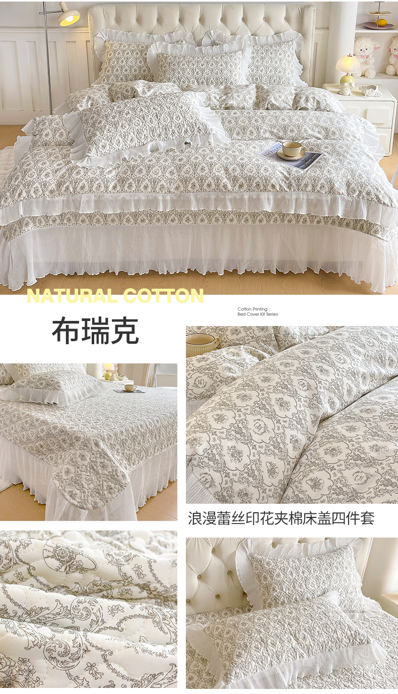 当前位置: 91家纺网 > 商品网购 > 床上用品 > 床盖 > 宜凡家纺2025新款雪纺花边印花夹棉床盖三件套四件套 布瑞克