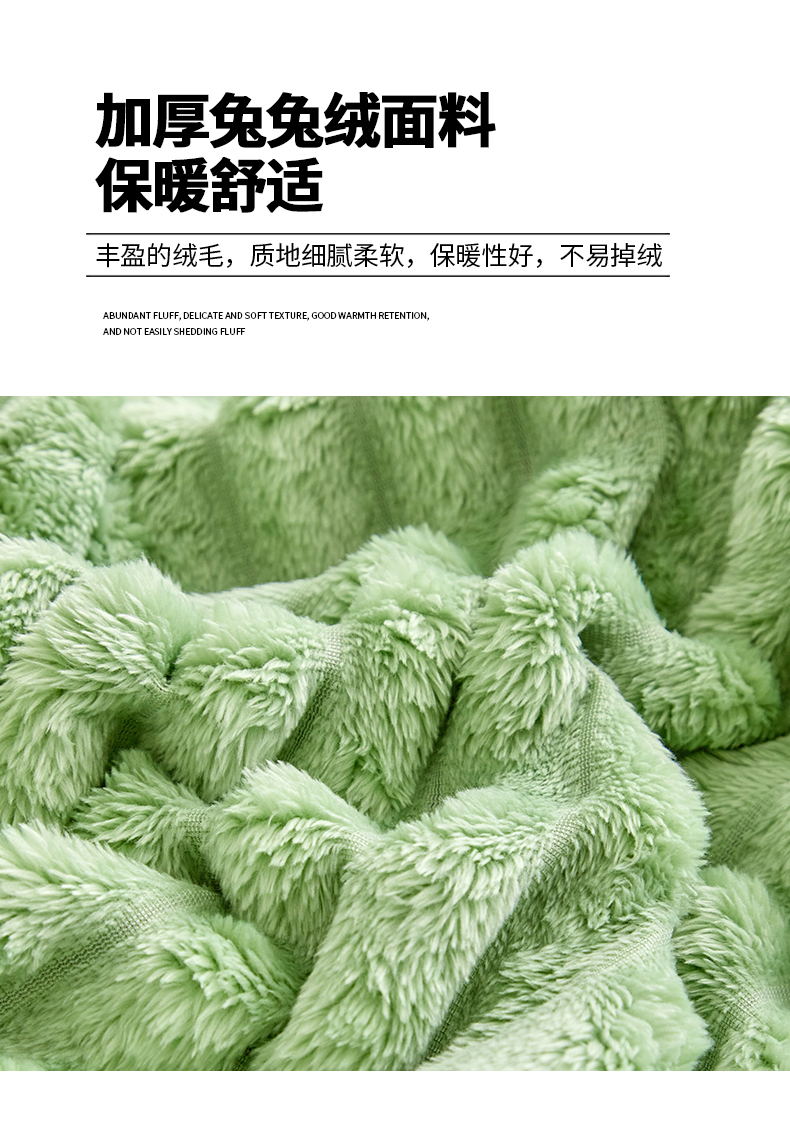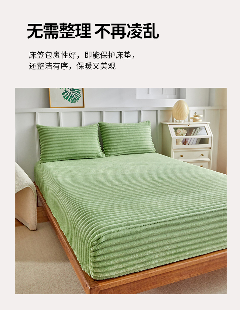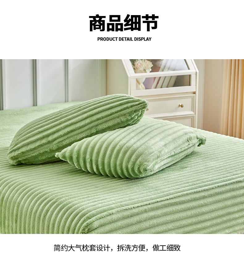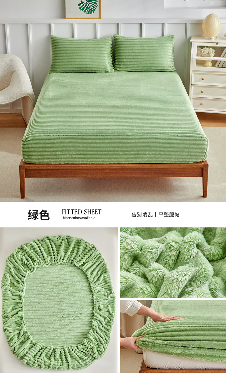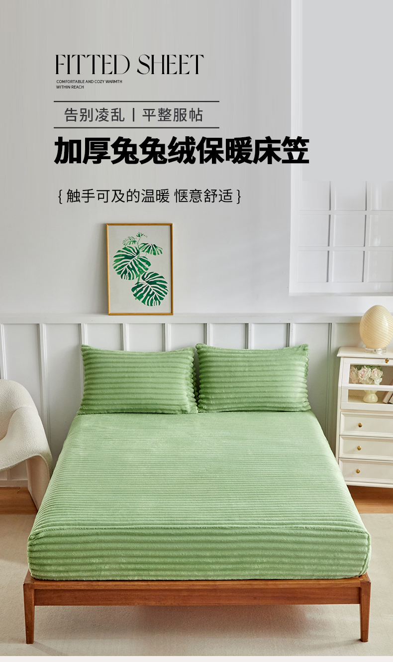 商品名称:枋梢家纺 2025新款爆款仿兔毛抽条床笠三件套跨境电商外贸欧美尺寸双面绒兔兔绒三件套 绿色