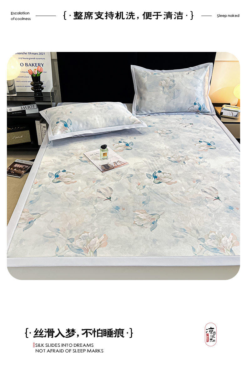 倾慕家纺 2025新款冰泉丝水墨风印花包边席子凉席 玉兰雅韵蓝