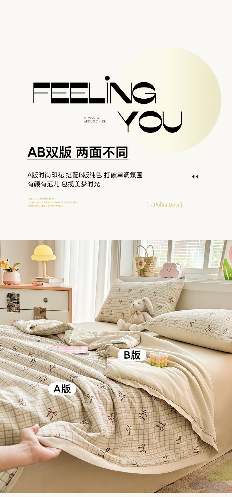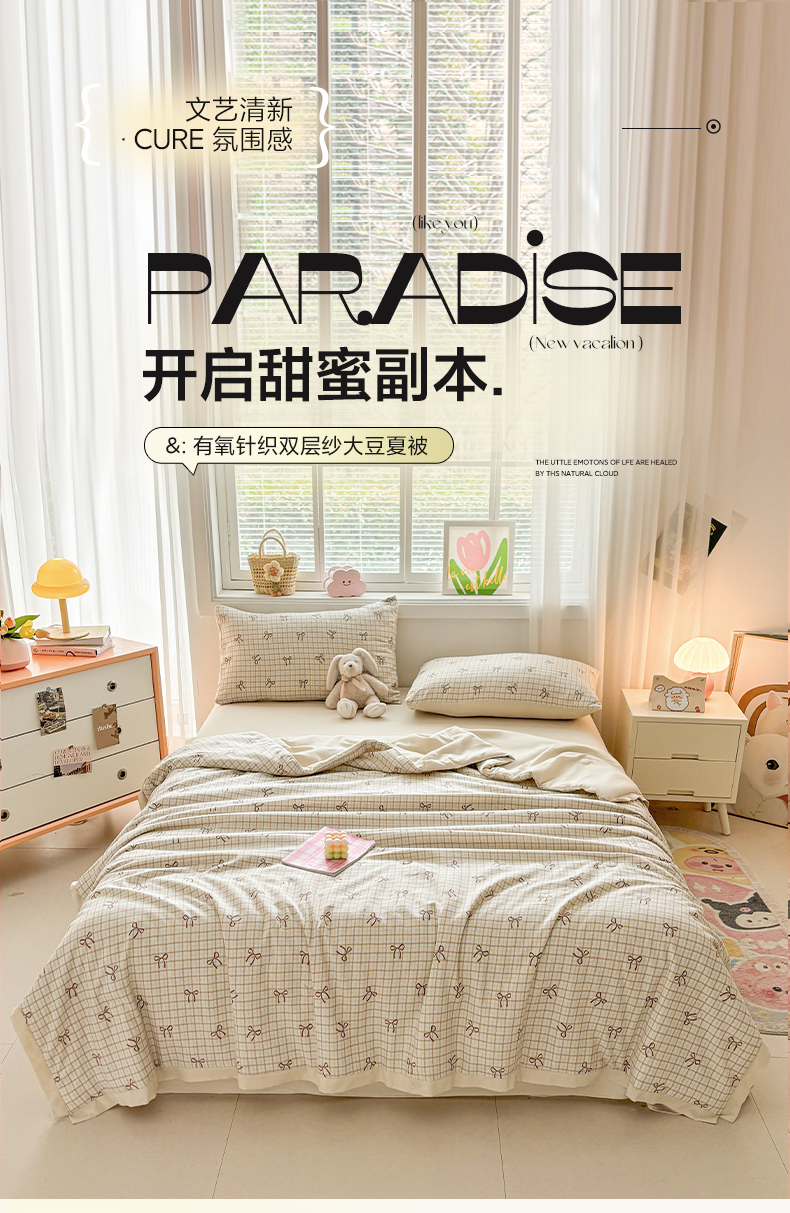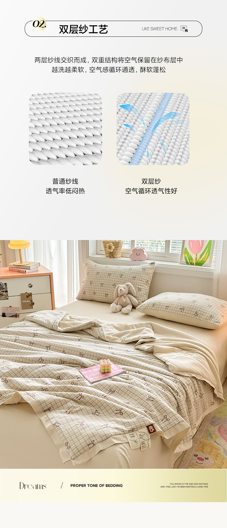 当前位置: 91家纺网 > 商品网购 > 床品套件 > 四件套 > 夏被四件套 > 金喜 2025新款小清新风格有氧针织双层纱大豆被夏被四件套 蝴蝶结