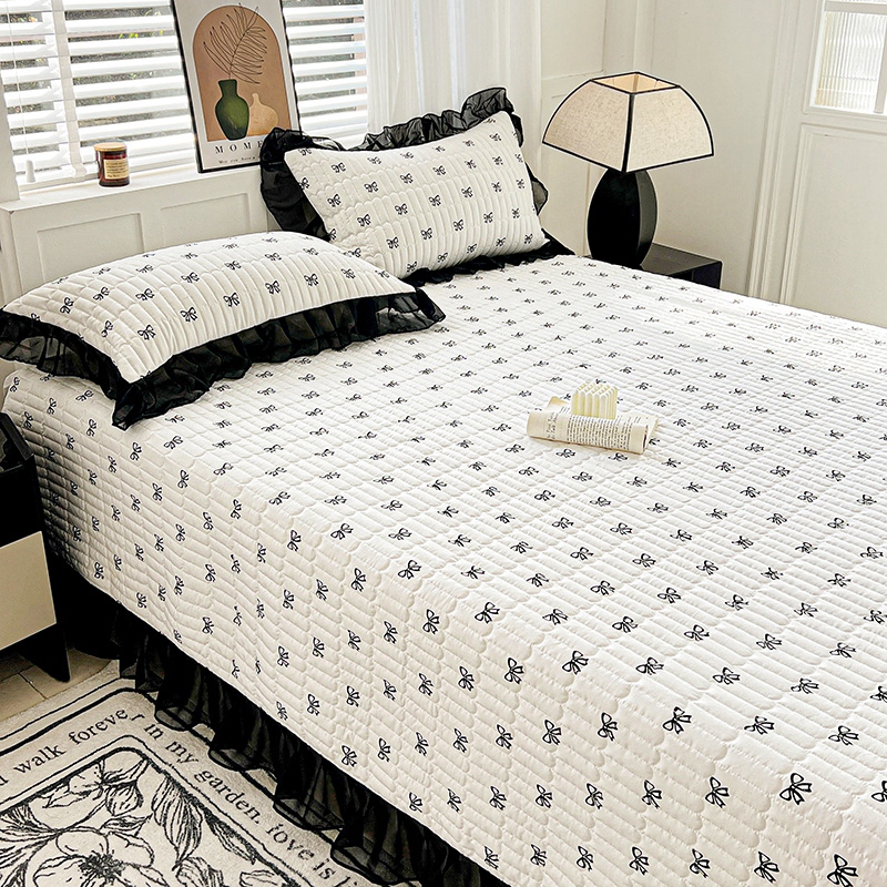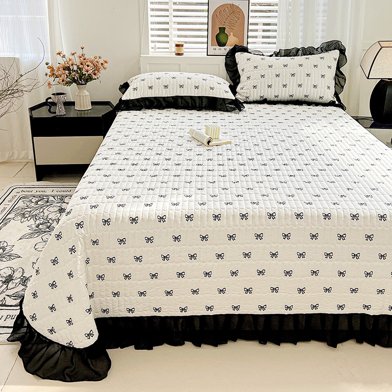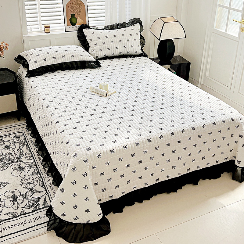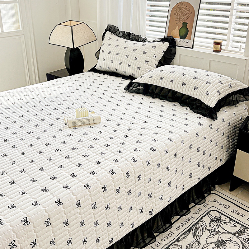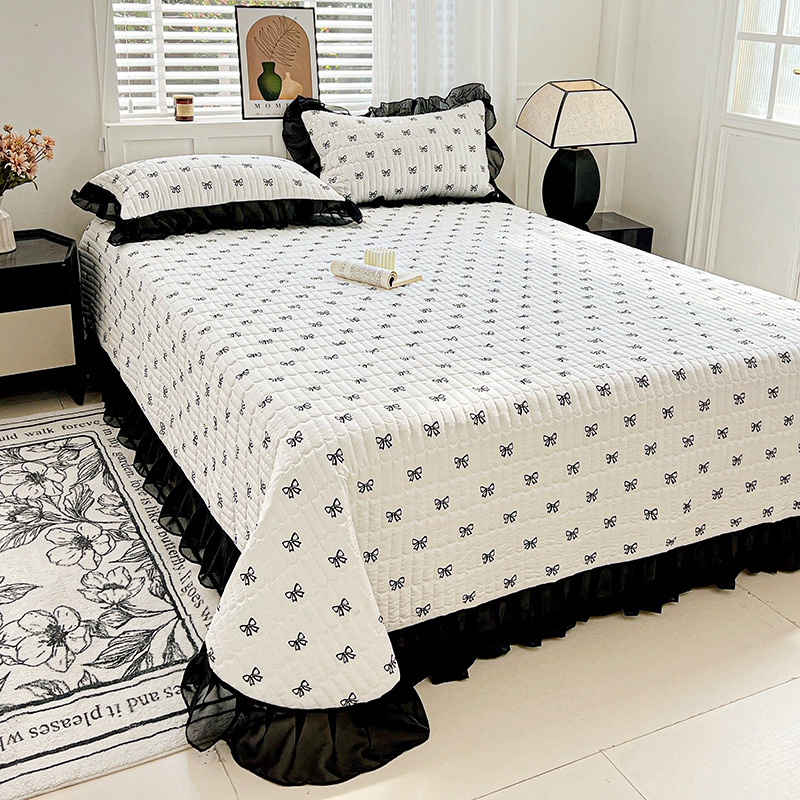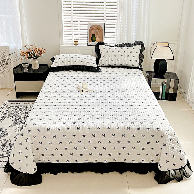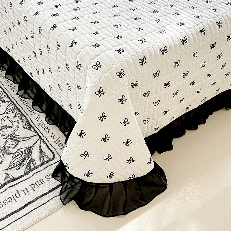 艾橙家纺2025新款法式赫本风水洗棉印花雪纺花边单床盖 黑色蝴蝶结