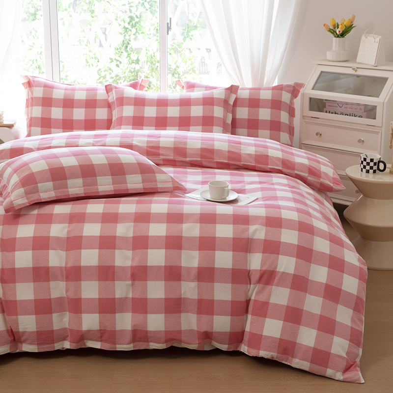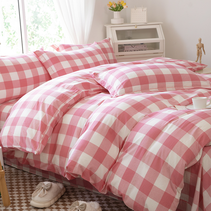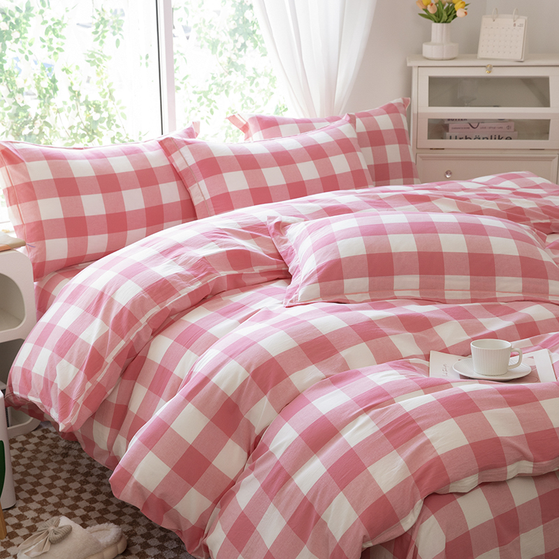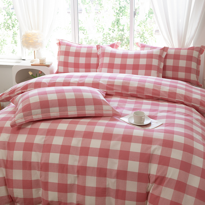 木易家居 2025新款全棉色织水洗棉四件套 桃红中格