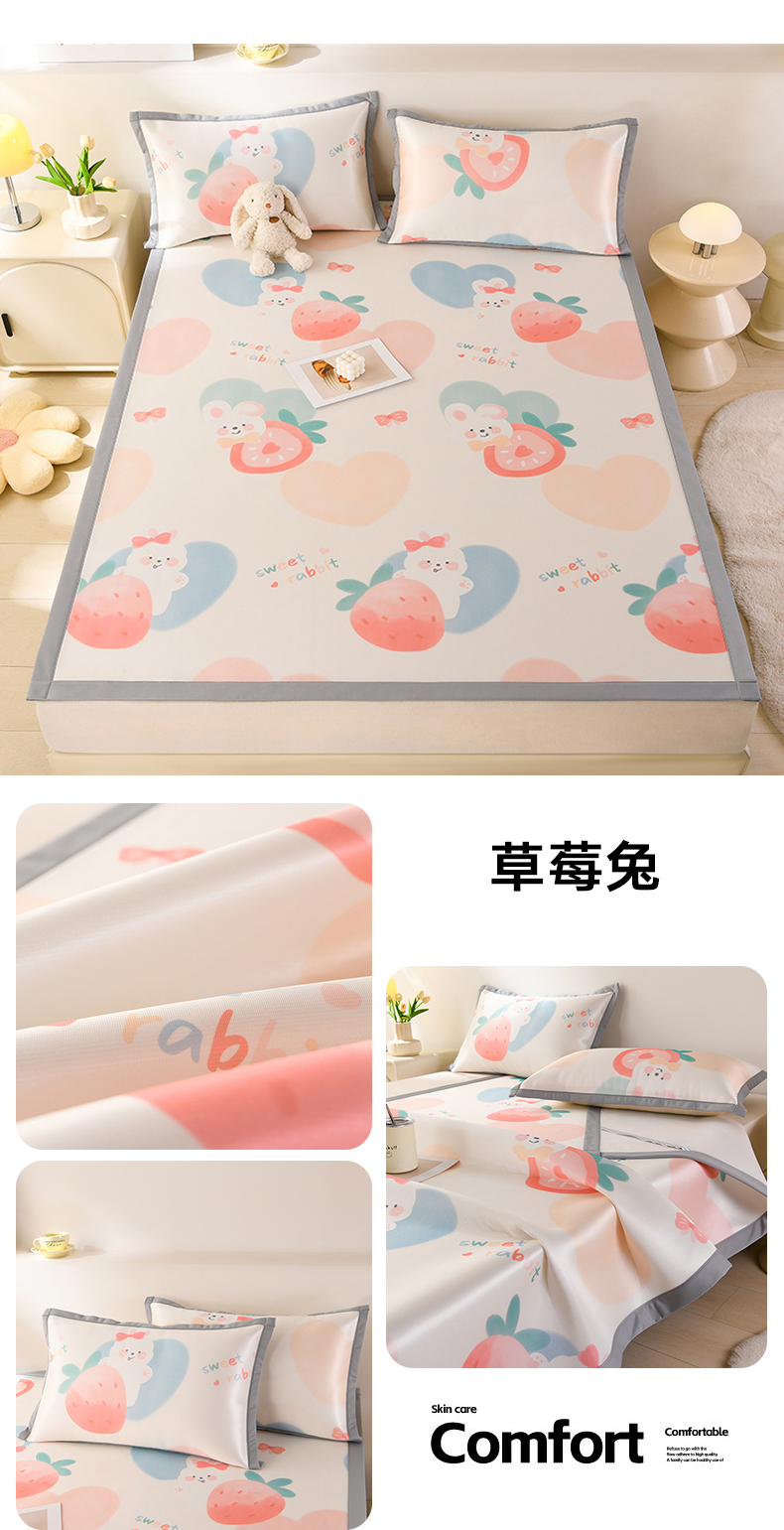 当前位置: 91家纺网 > 商品网购 > 床上用品 > 凉席 > 牵依 2025春夏新款A类碳光冰丝席凉感印花三明治凉席 草莓兔