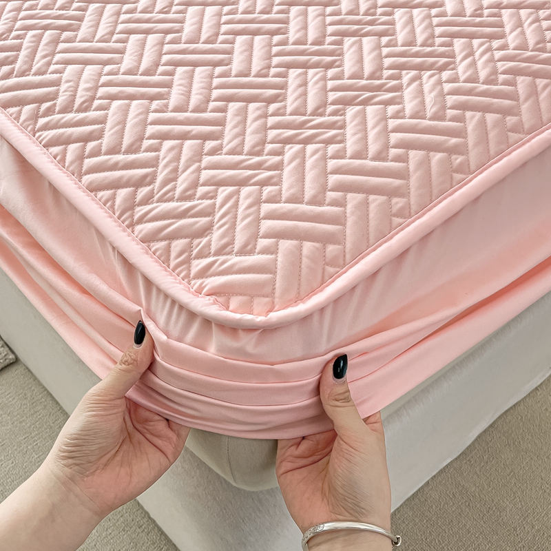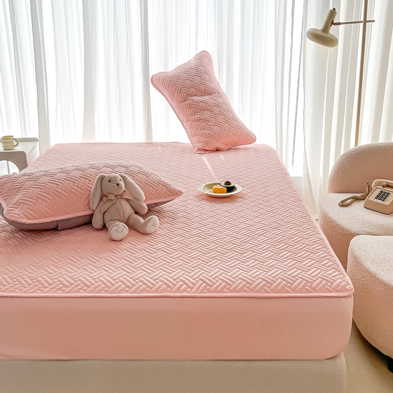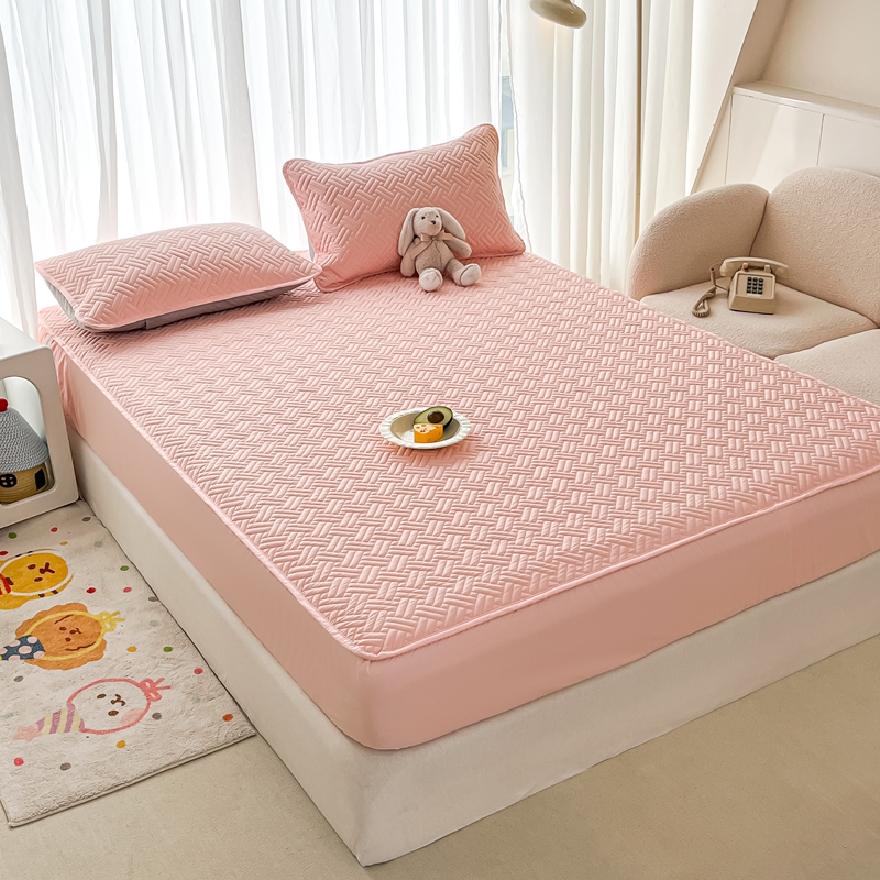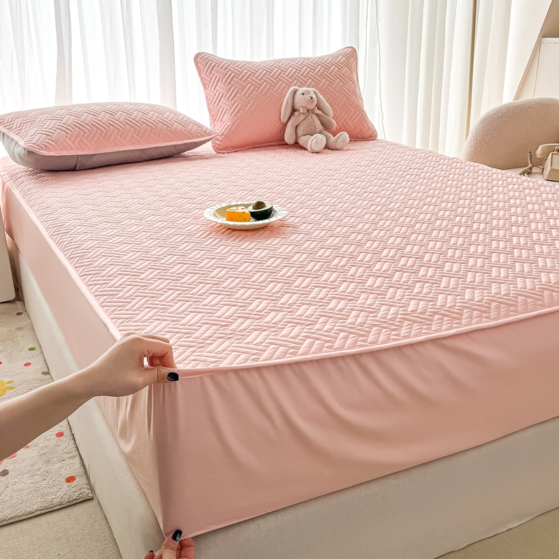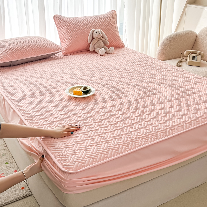 欧邦 2025新款四季款纯色水洗棉夹棉床笠床垫保护罩-场景一 条格-粉玉