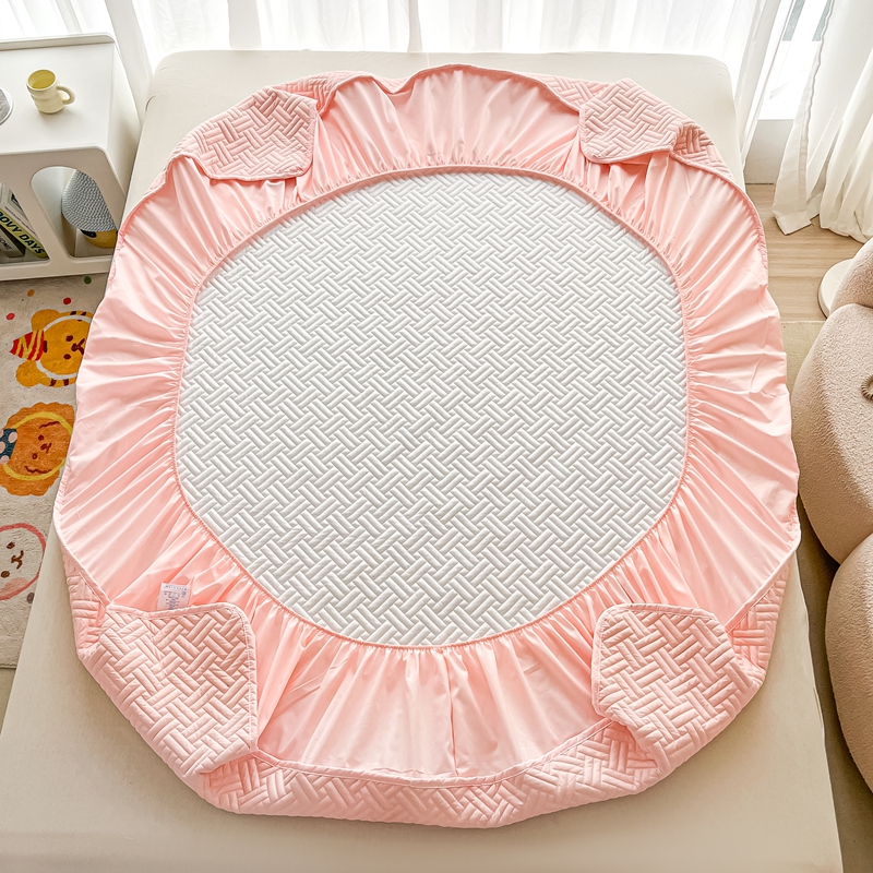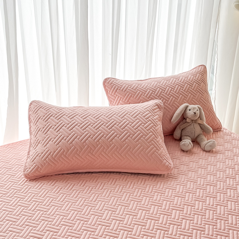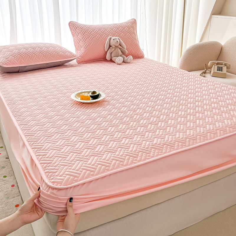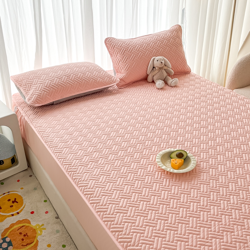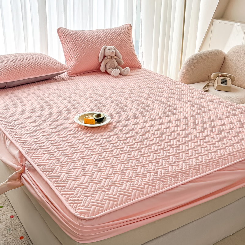 欧邦 2025新款四季款纯色水洗棉夹棉床笠床垫保护罩-场景一 条格-粉玉