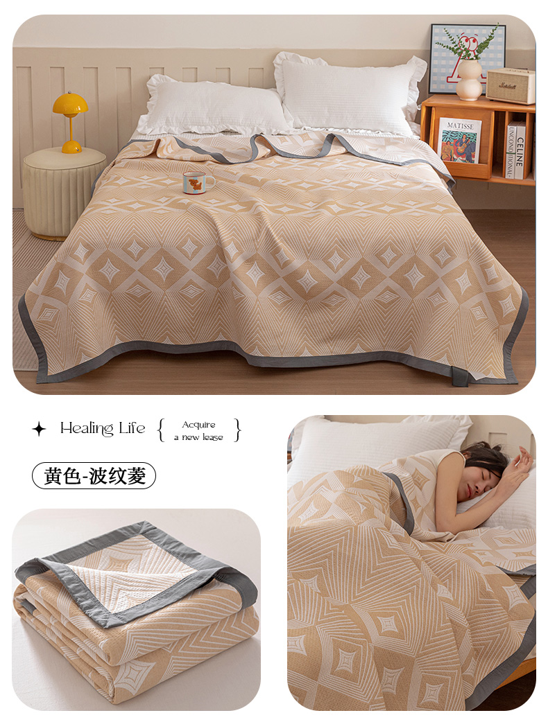 商品名称:2025新款A类纯棉针织三层纱提花多功能毯 黄色-波纹菱