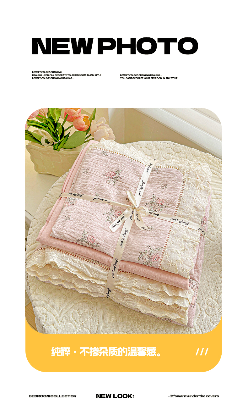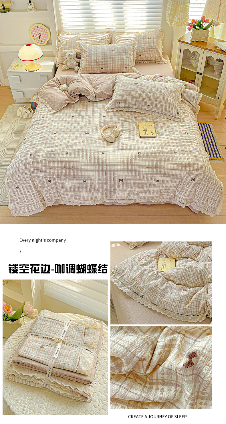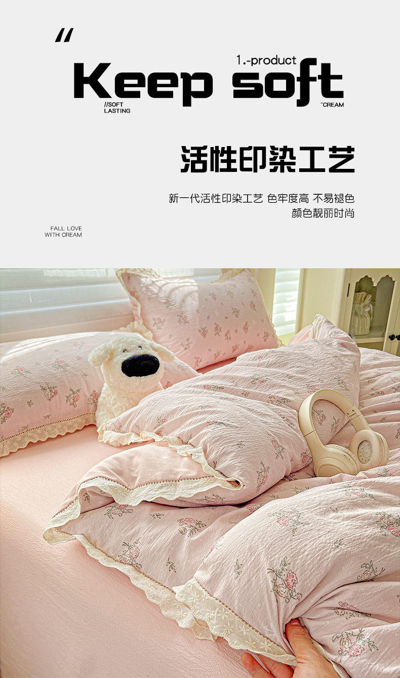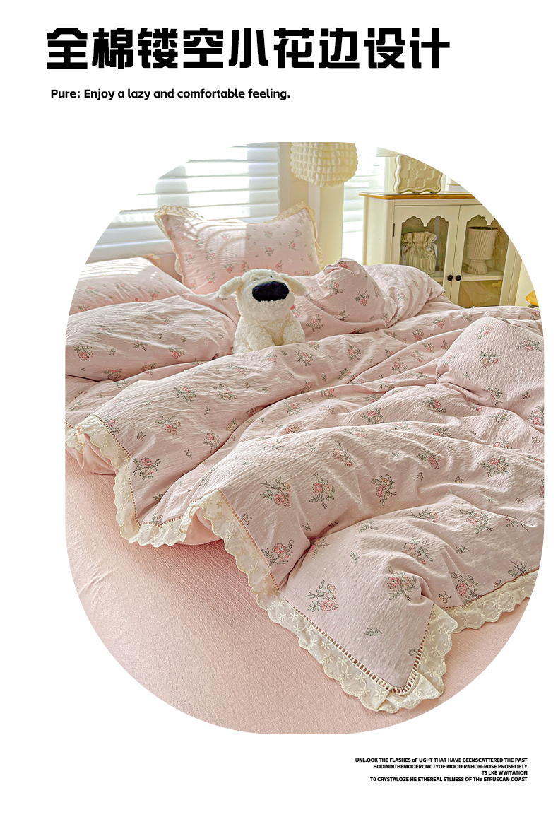 当前位置: 91家纺网 > 商品网购 > 床品套件 > 四件套 > 其它四件套 > 金梦拉家纺 2025新款提花纱布皱皱纱四件套(全棉镂空花边款) 镂空花边-花颜
