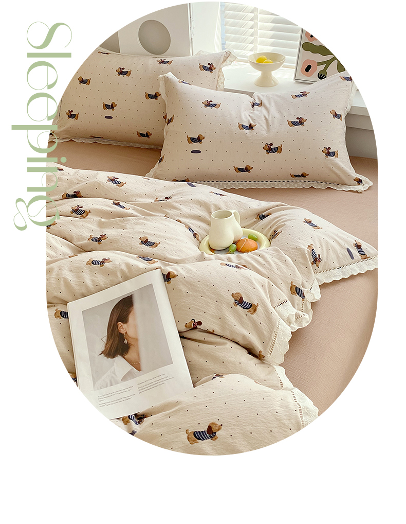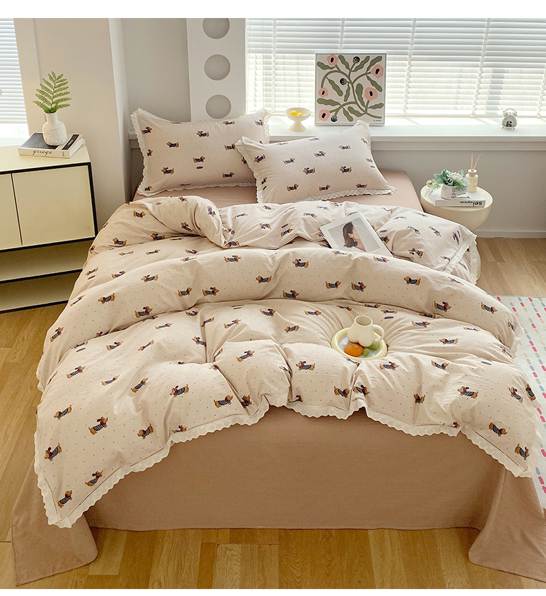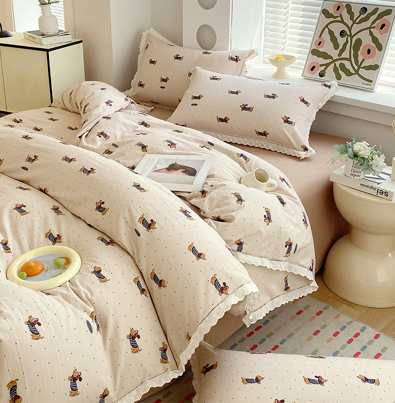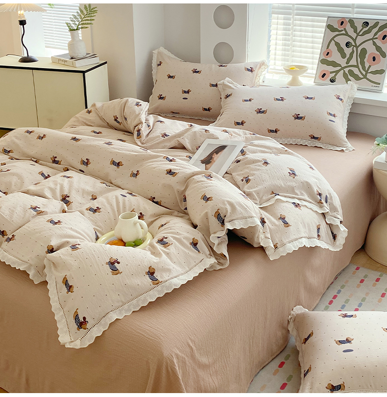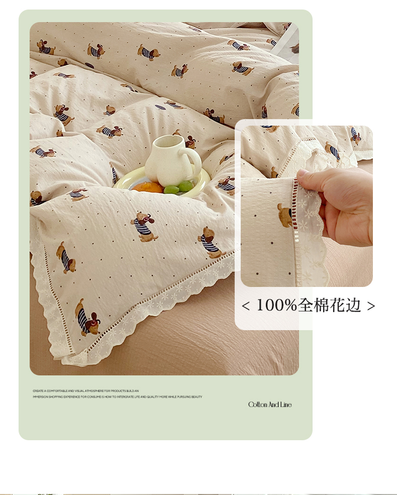商品名称:雨彤家纺 2025新款A类高克重云感皱皱双层纱全棉镂空花边款法式四件套-叠拍图 腊肠狗