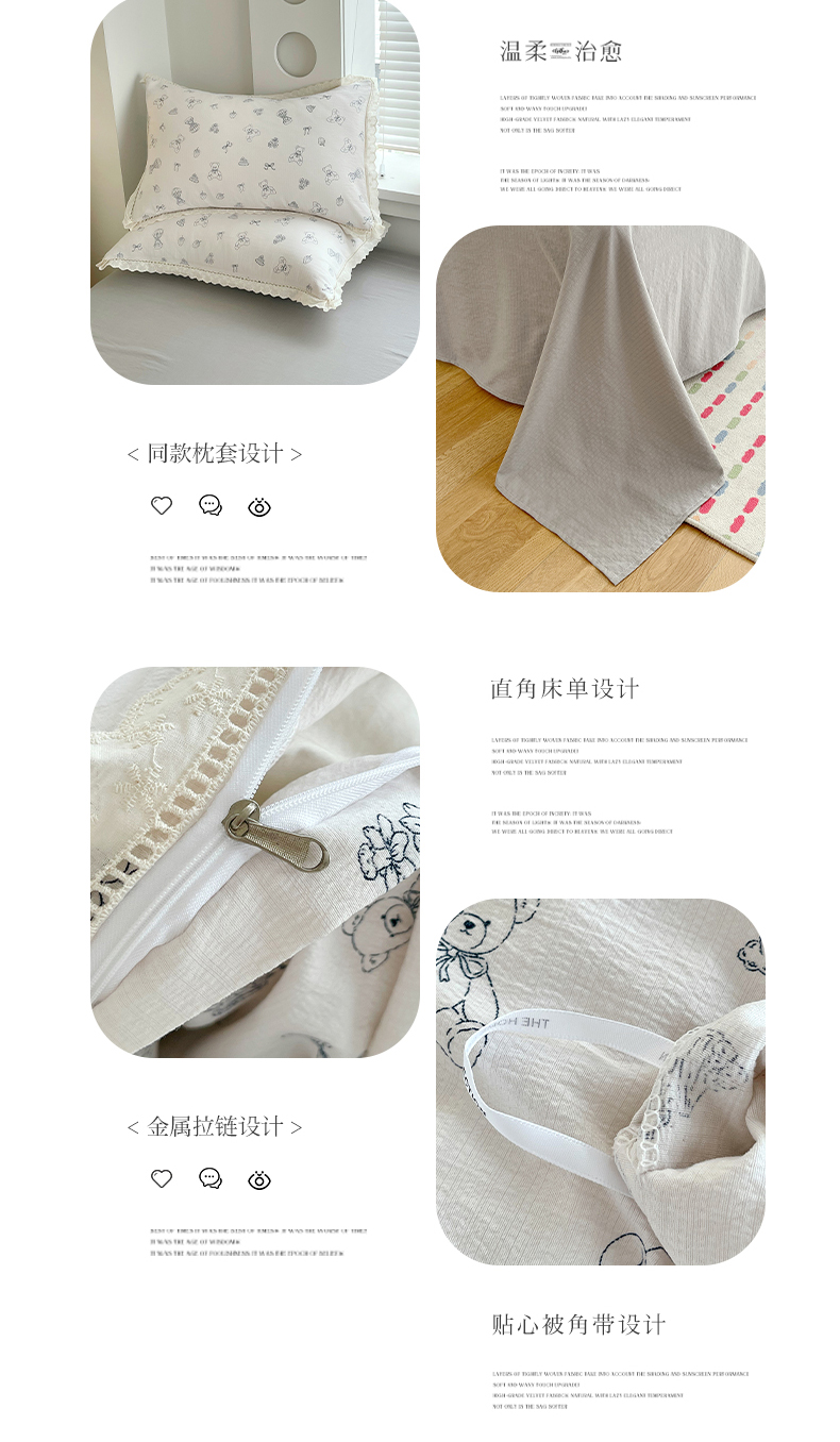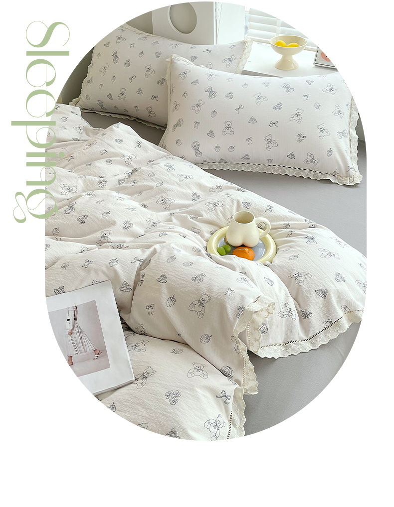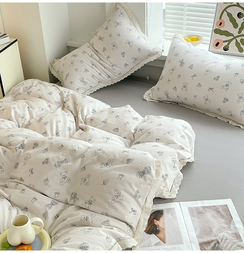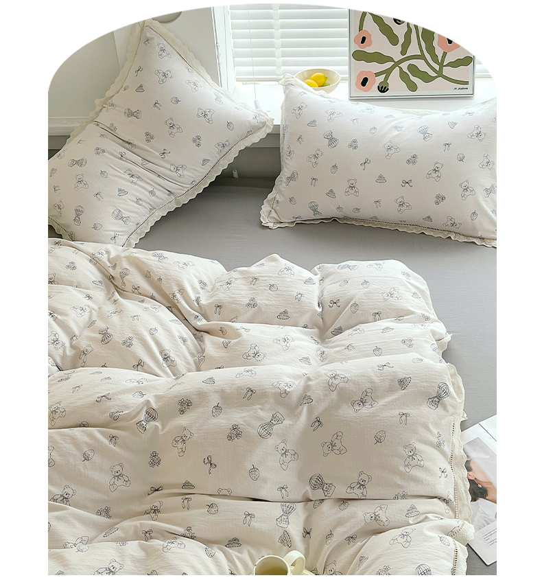 商品名称:雨彤家纺 2025新款A类高克重云感皱皱双层纱全棉镂空花边款法式四件套-床拍图 蛋糕熊