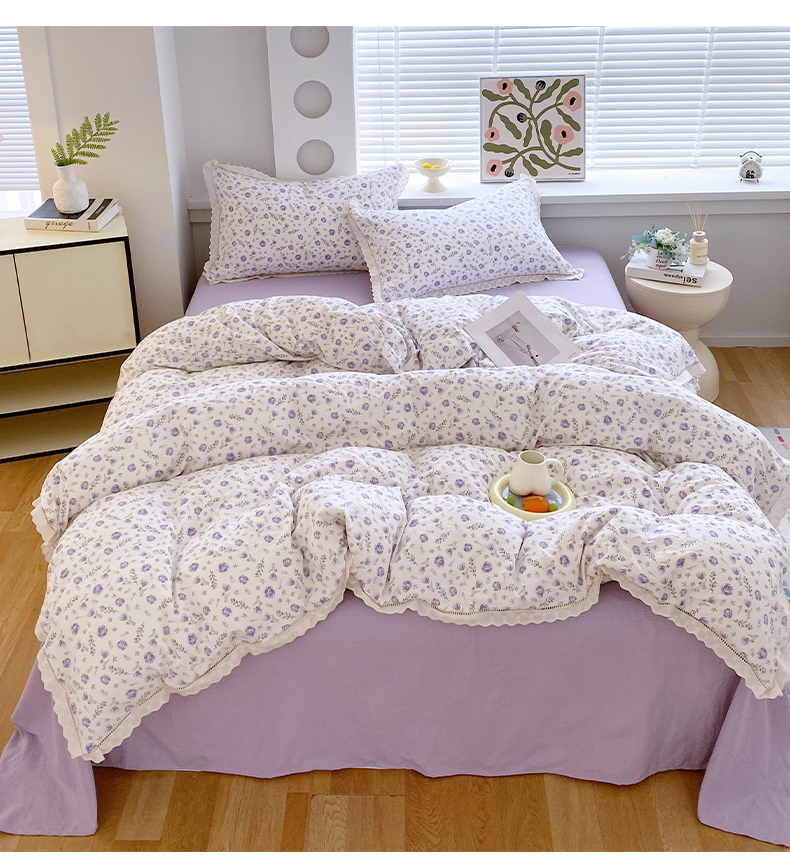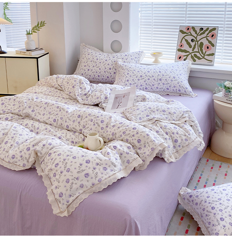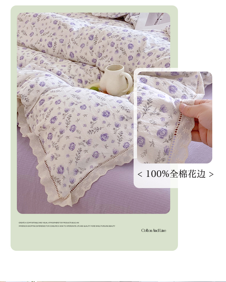 商品名称:雨彤家纺 2025新款A类高克重云感皱皱双层纱全棉镂空花边款法式四件套-床拍图 惜花芷