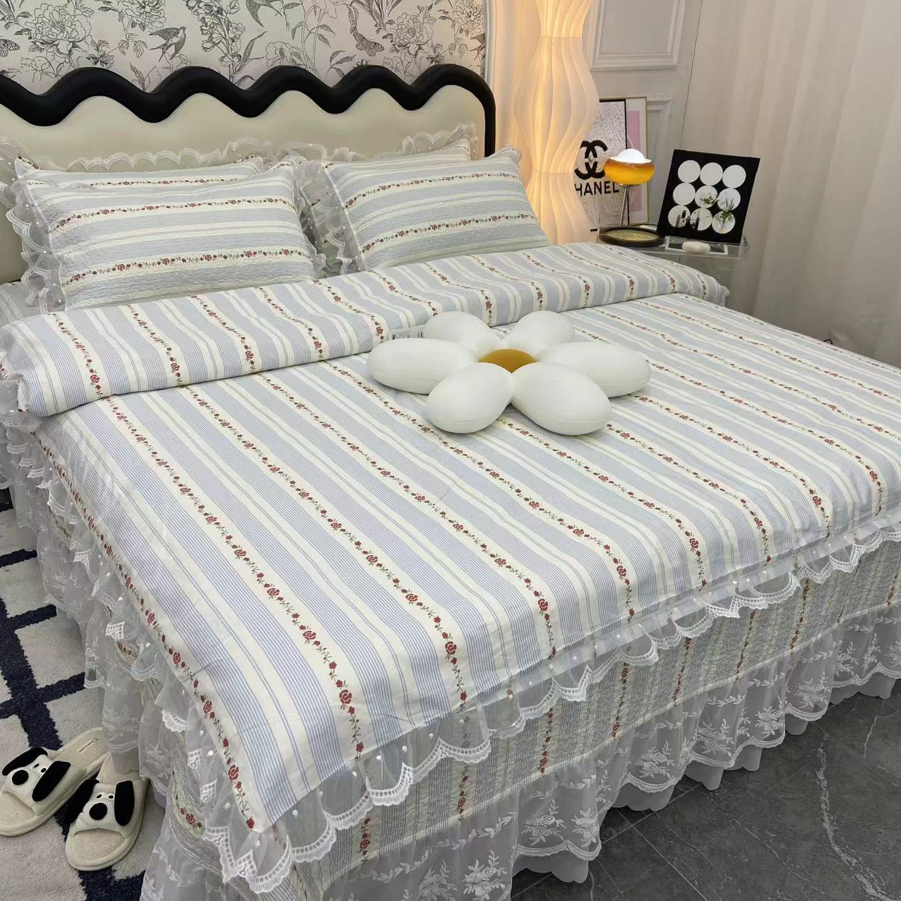 禧瑞谷 2025新款双层花边纯棉床盖雪纺蕾丝款纯棉床盖四件套 彩条熊,彩条熊