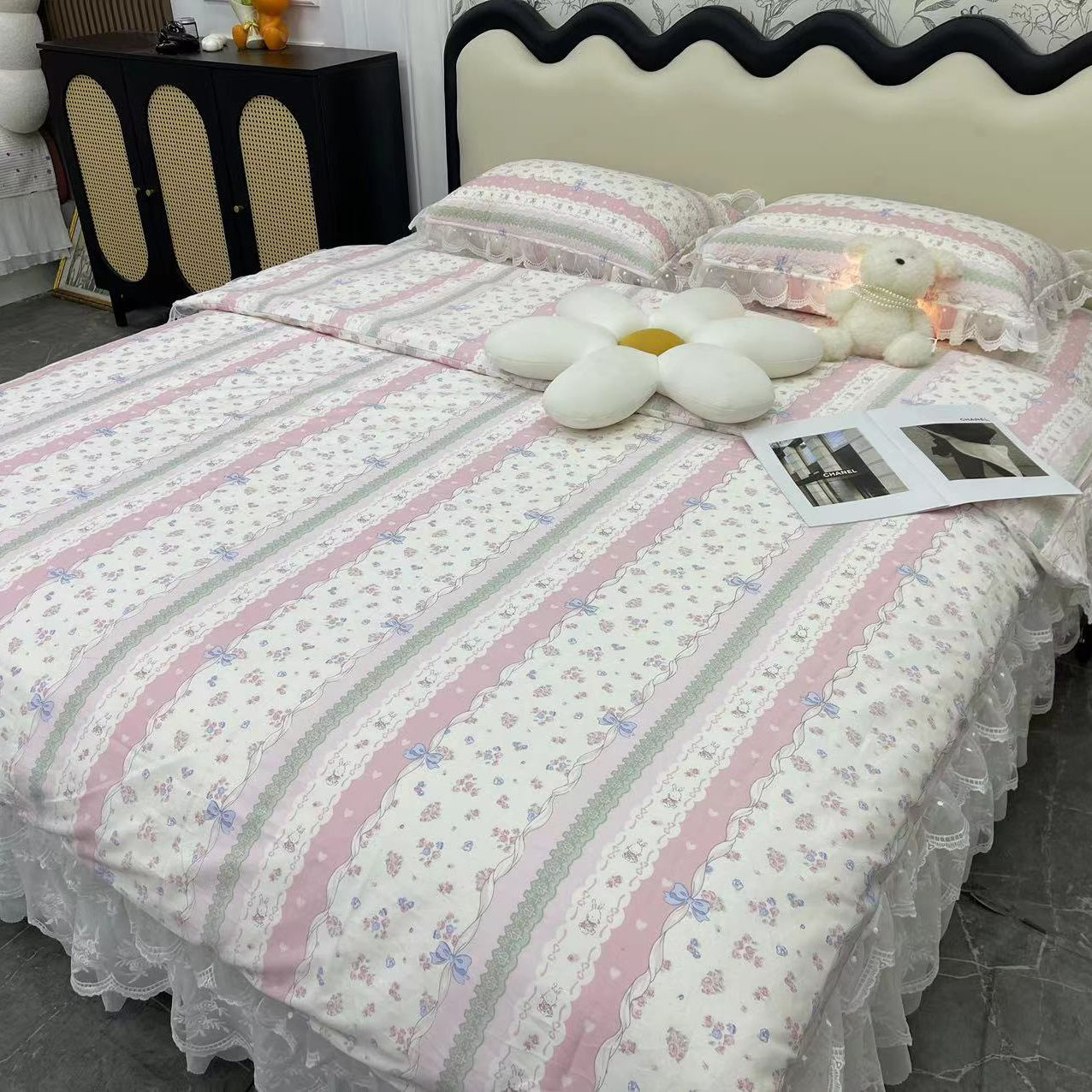 (总)禧瑞谷 2025新款双层花边纯棉床盖雪纺蕾丝款纯棉床盖四件套,白波点蝴蝶结,白底波点,白兰地,彩条熊,草莓熊,粉底草莓,格子郁金香,花仙兔,蓝色猫咪,洛丽塔粉,缪格子紫蝴蝶结,奶油草莓,顽皮象,香香格子,笑脸,新条纹蝴蝶结,紫色花海,莓格甜梦,梦境,奶油小狗,心想柿成