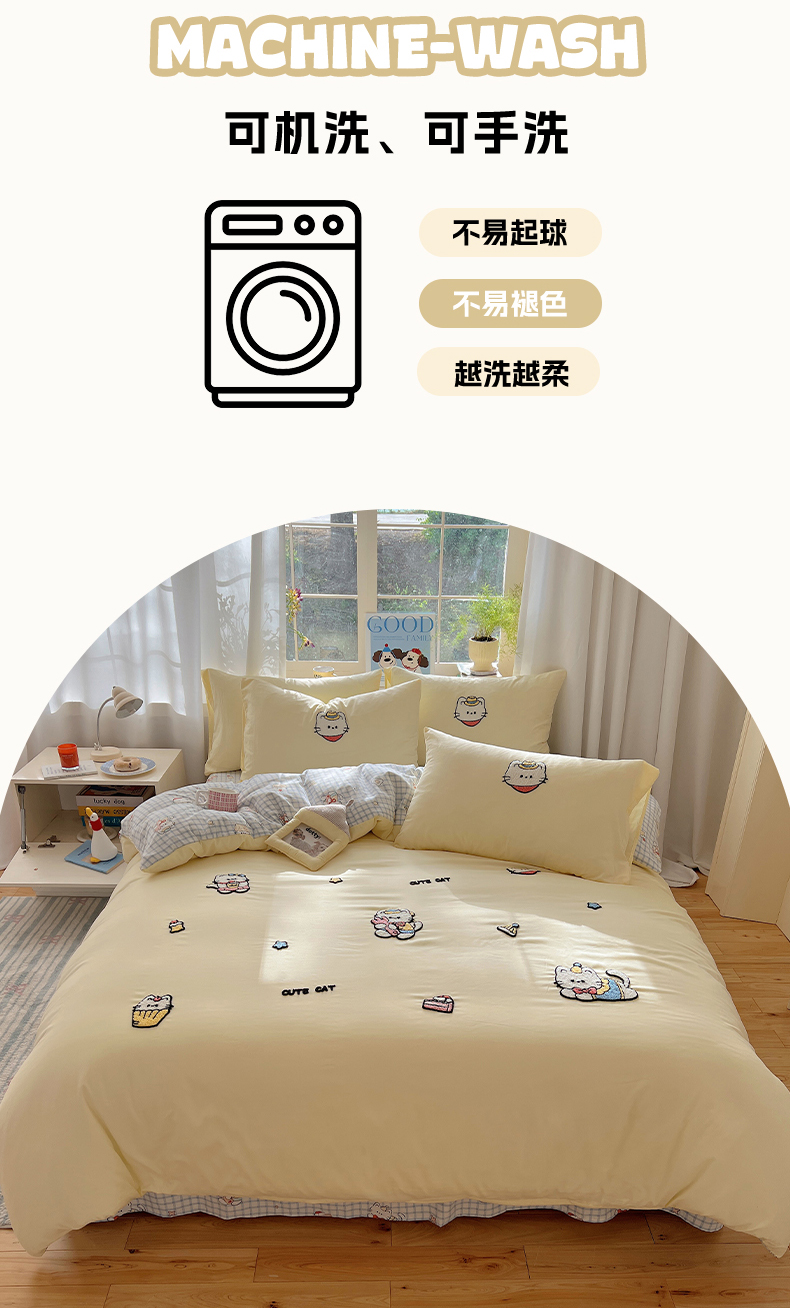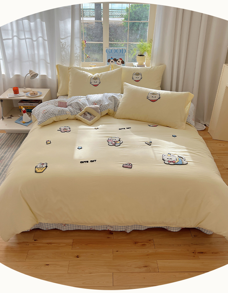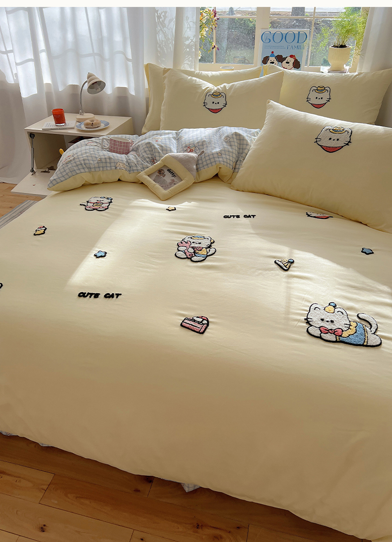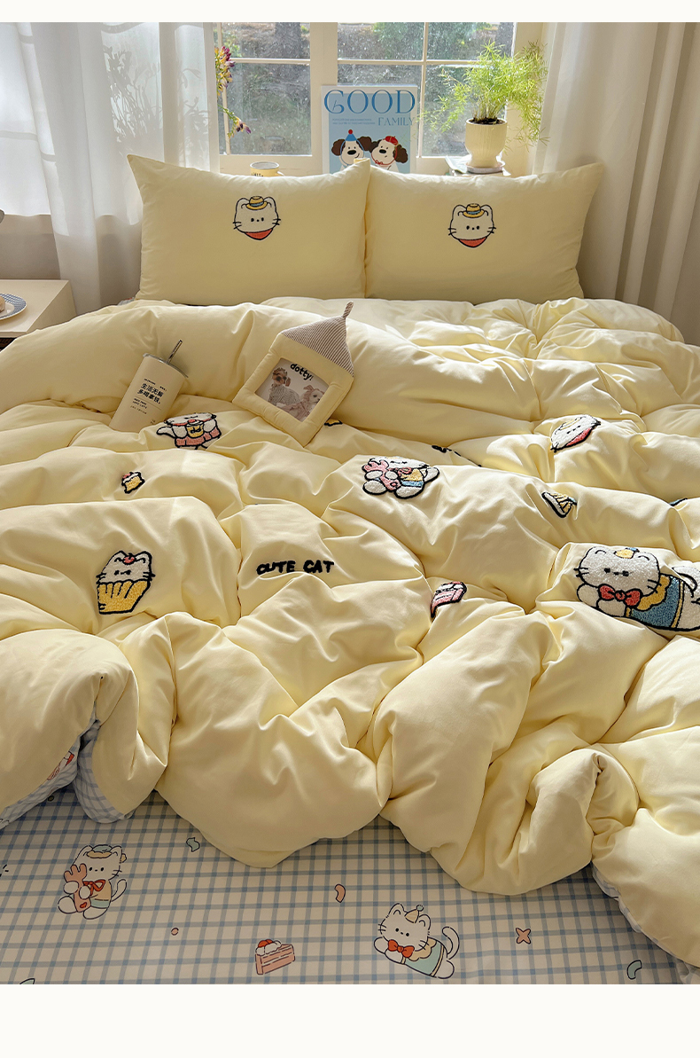 (总)韩都家居 2025新款ins毛巾绣猫咪系列加厚牛奶绒四件套,哈喽猫咪,猫咪茶会,三只小猫,贪吃的猫,淘气猫咪