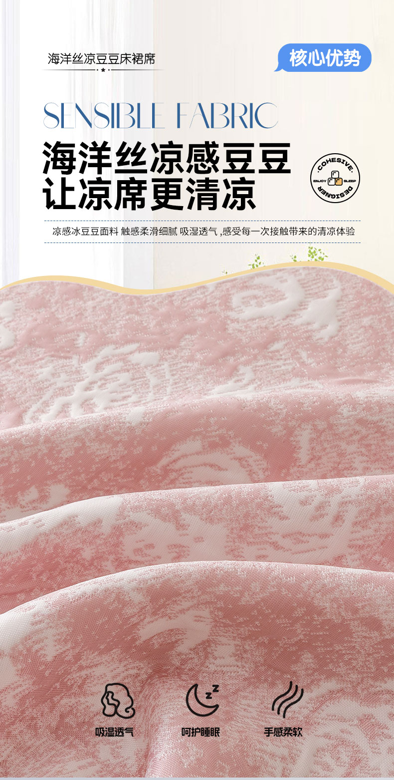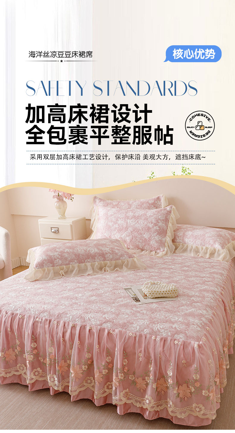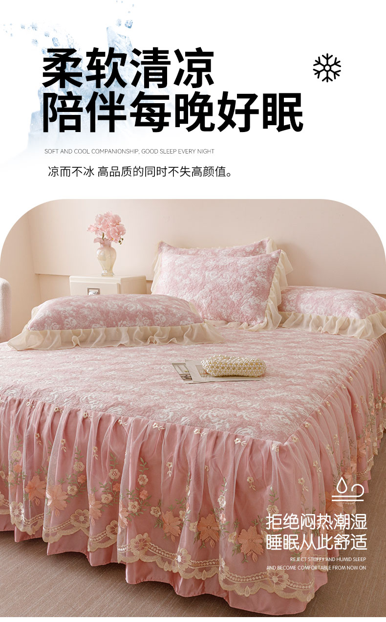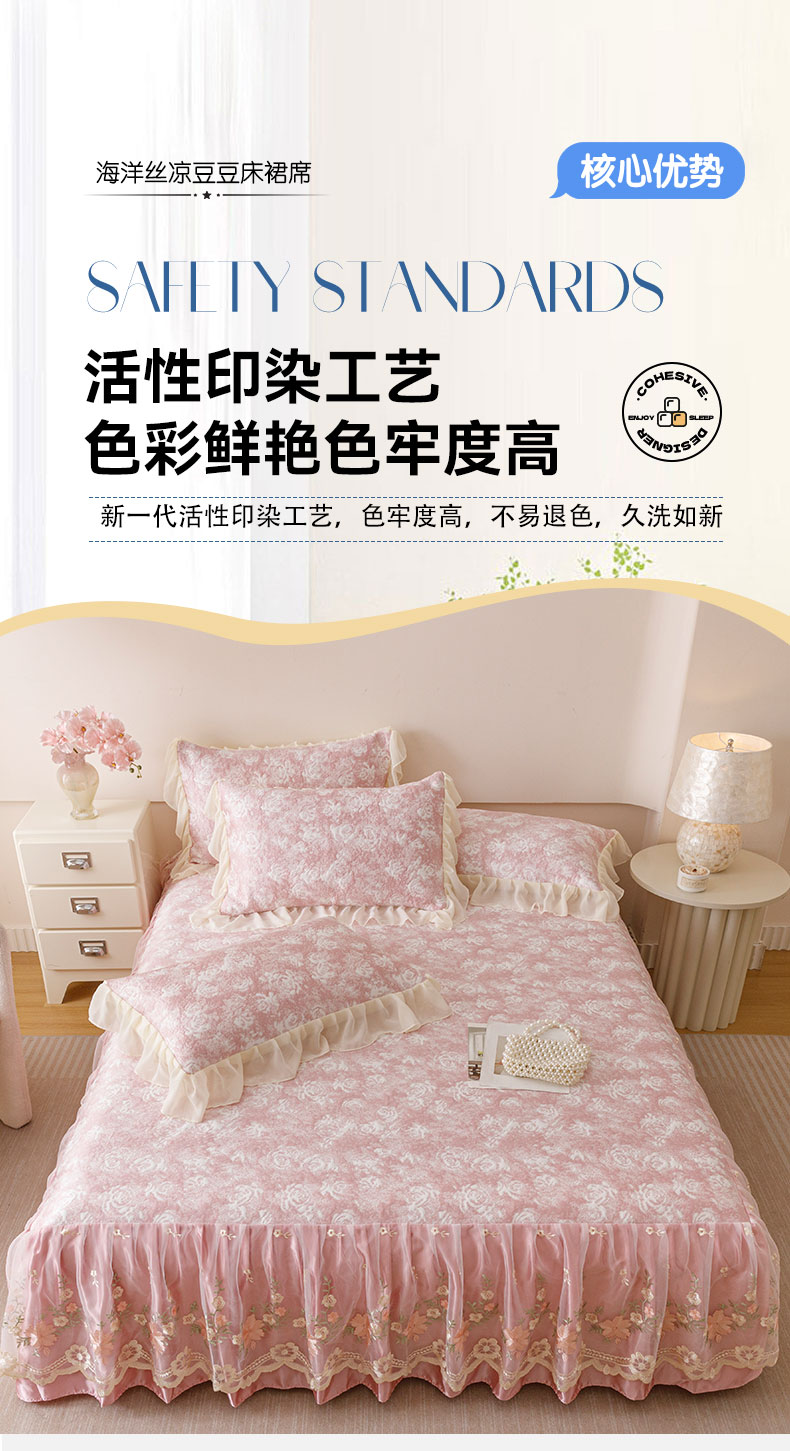 商品名称:(总)好儿喜家纺 2025新款海洋丝凉感豆豆床裙凉席-巴黎玫瑰