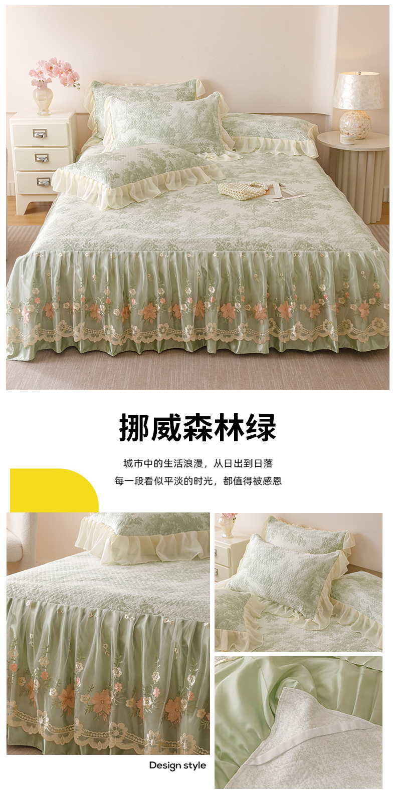 (总)好儿喜家纺 2024新款伊芙琳凉席床裙三件套,浅绿,橄榄绿,奶白,浅粉,浅蓝