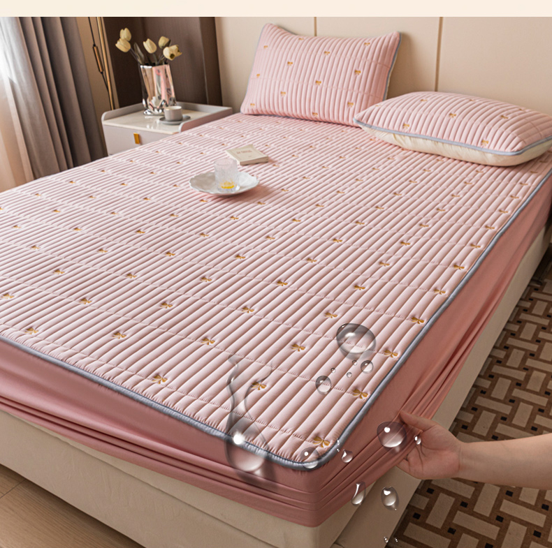 暖季家纺 2025新款A类亲肤面料夹棉绣花床笠-不防水款 小蝴蝶结-粉-普通款