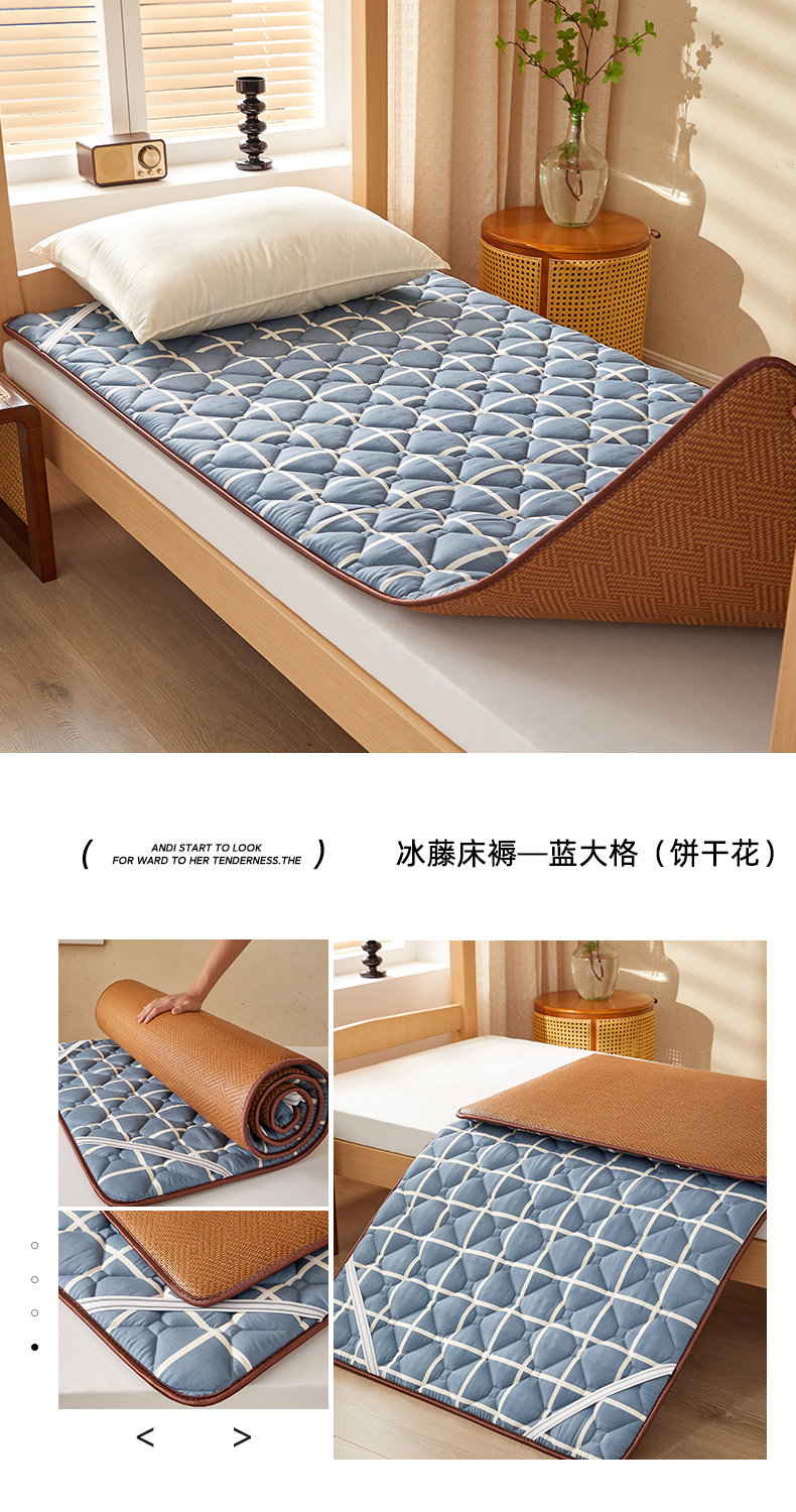 花言狐语 2025新款双面可用冰藤夹棉床褥系列-小床款 冰藤床褥-蓝大格(九宫格)