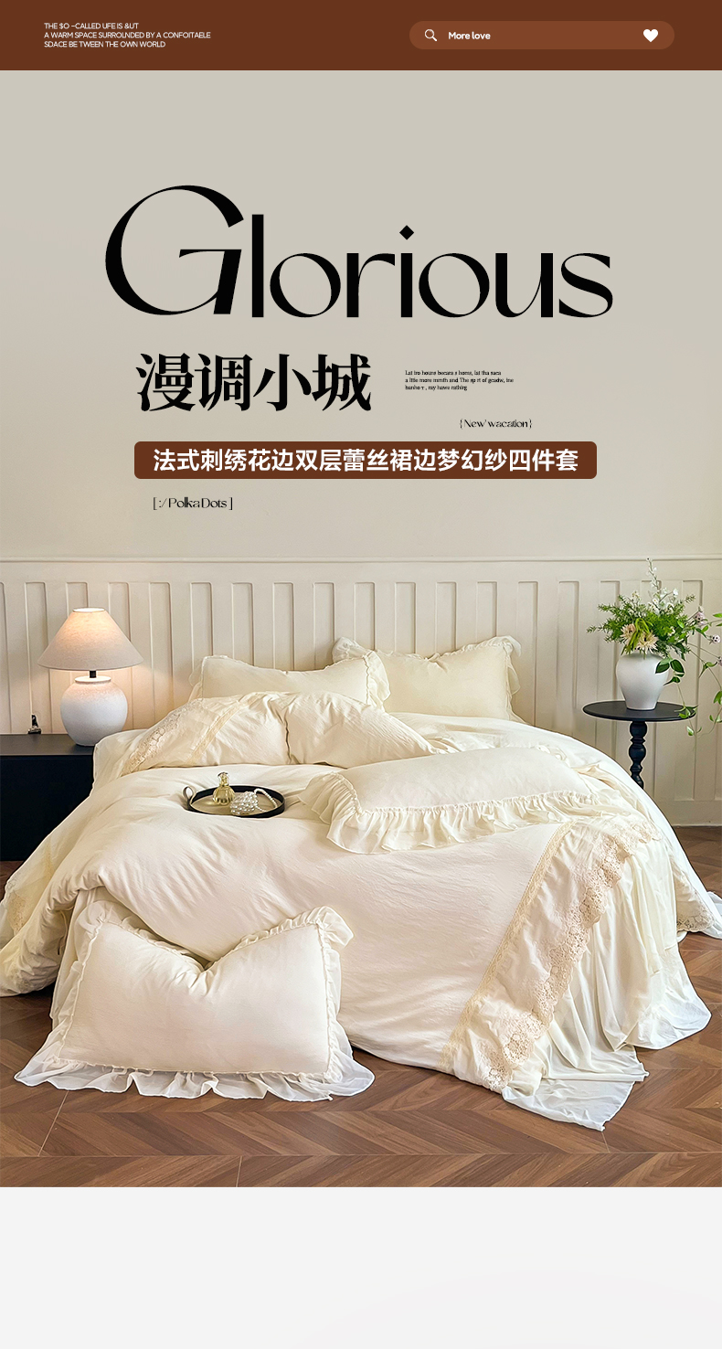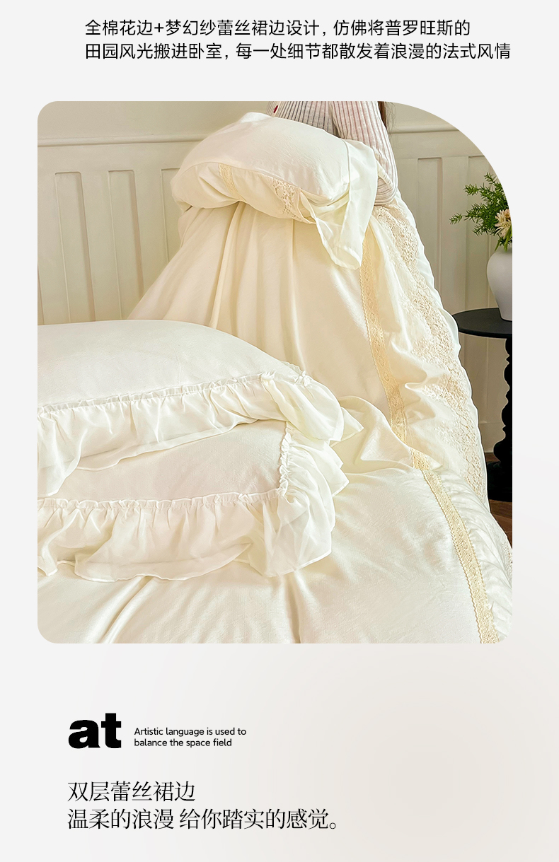 (总)庭笙 2025新款法式刺绣花边双层蕾丝裙边梦幻纱四件套-漫调小城,米白,浅粉