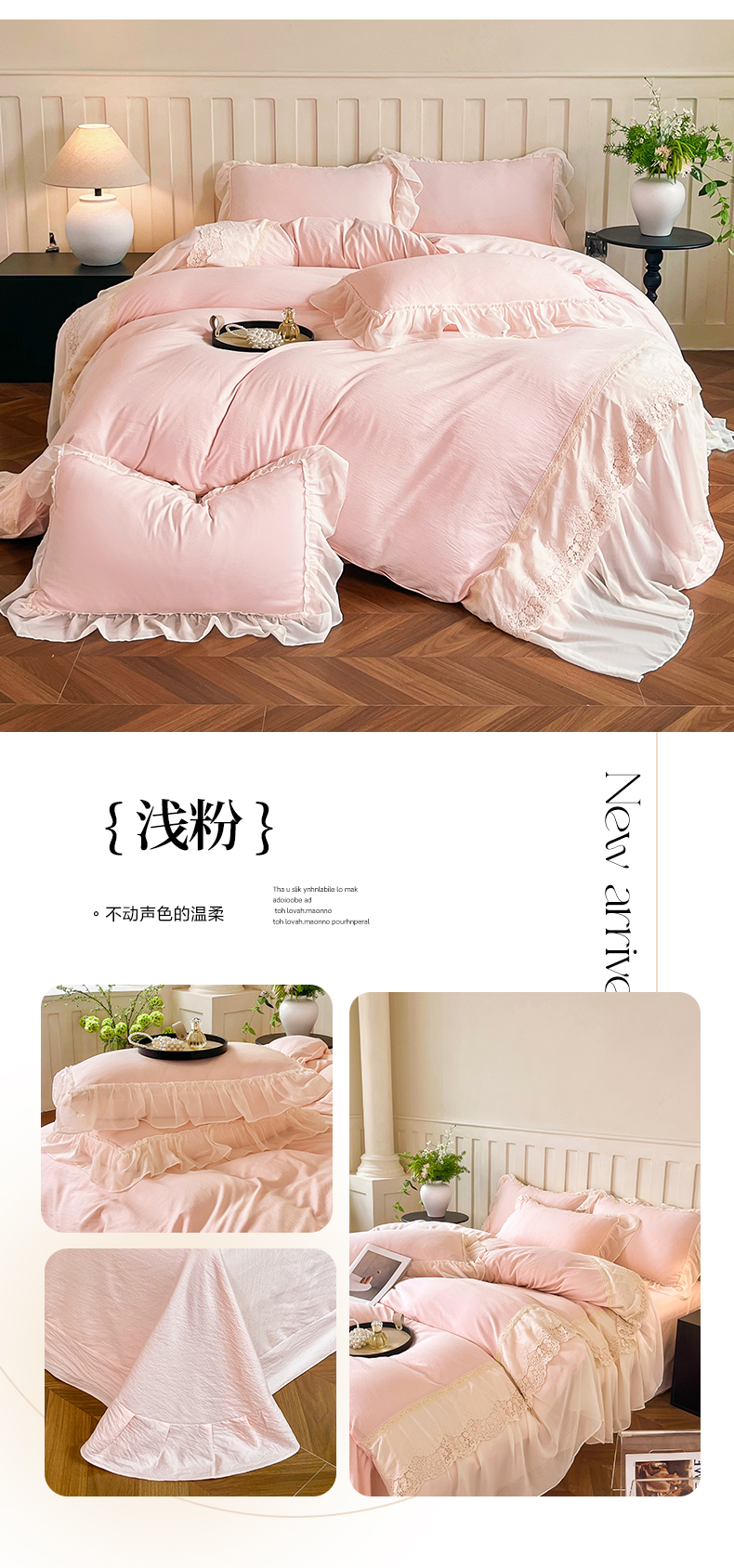商品名称:庭笙 2025新款法式刺绣花边双层蕾丝裙边梦幻纱四件套-漫调小城 浅粉