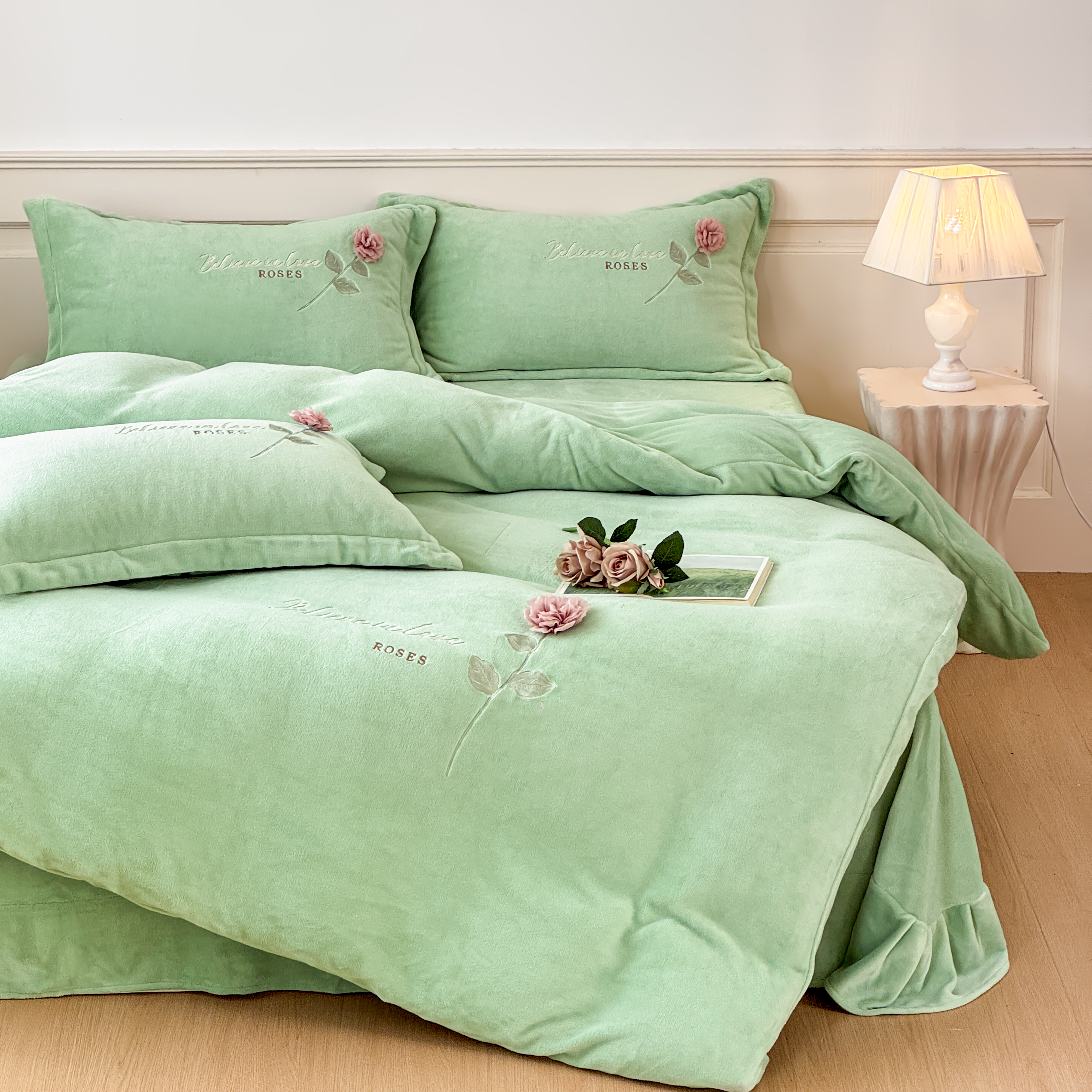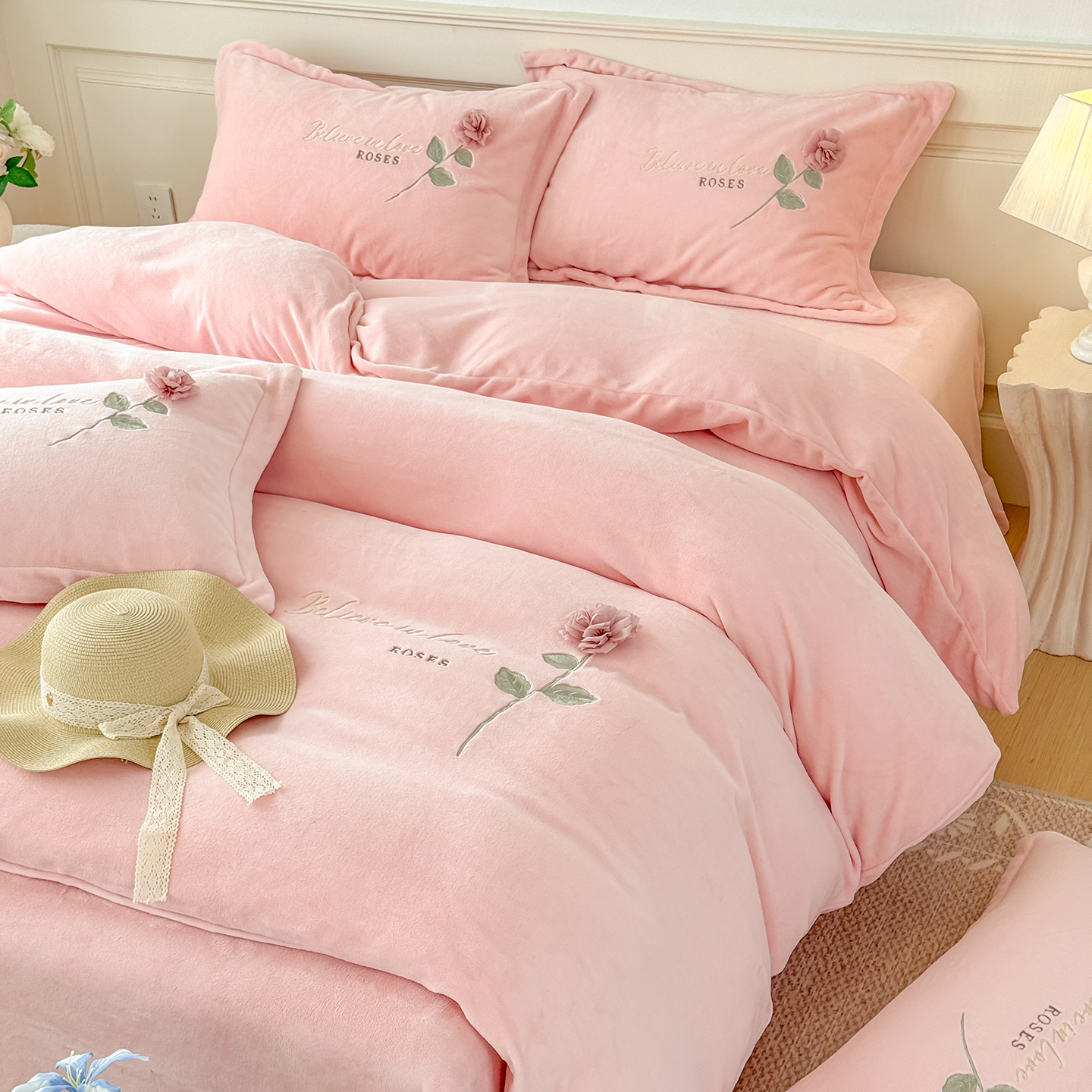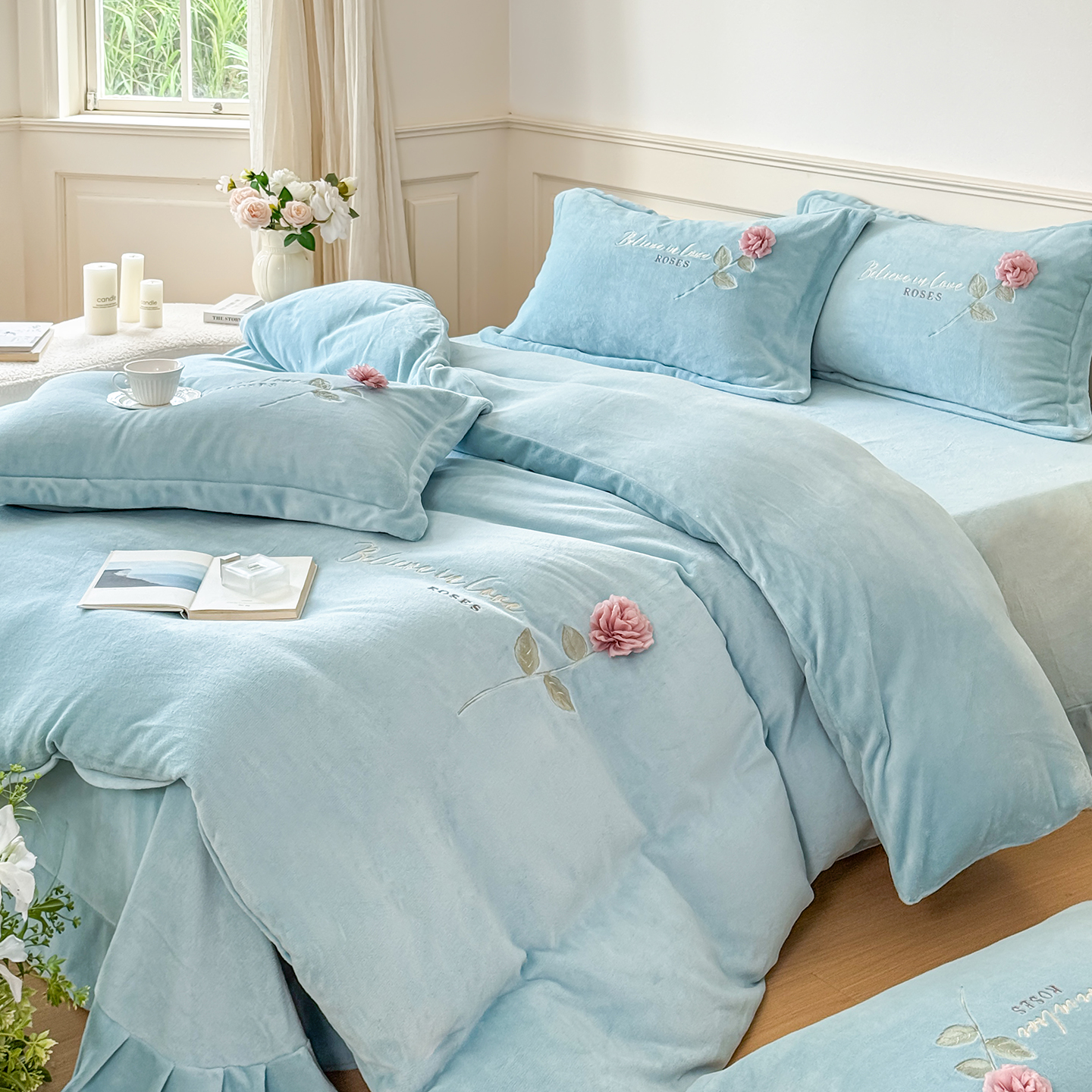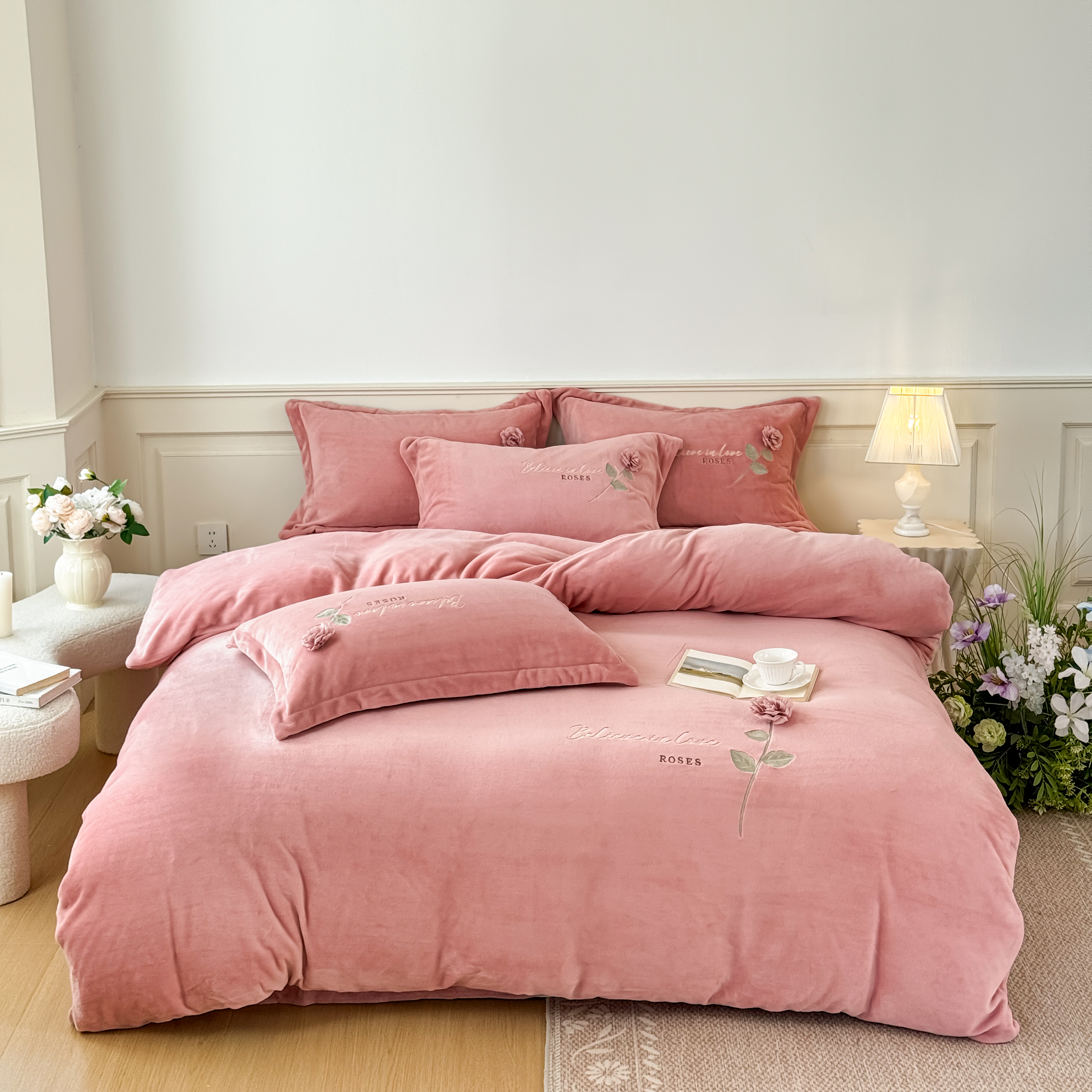 商品名称:恋尚羽家纺 2025新款加厚消光牛奶绒绣花四件套 手工花朵工艺款 宝宝绒 精包装 灰色