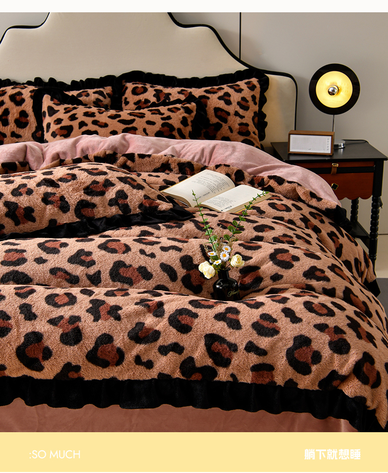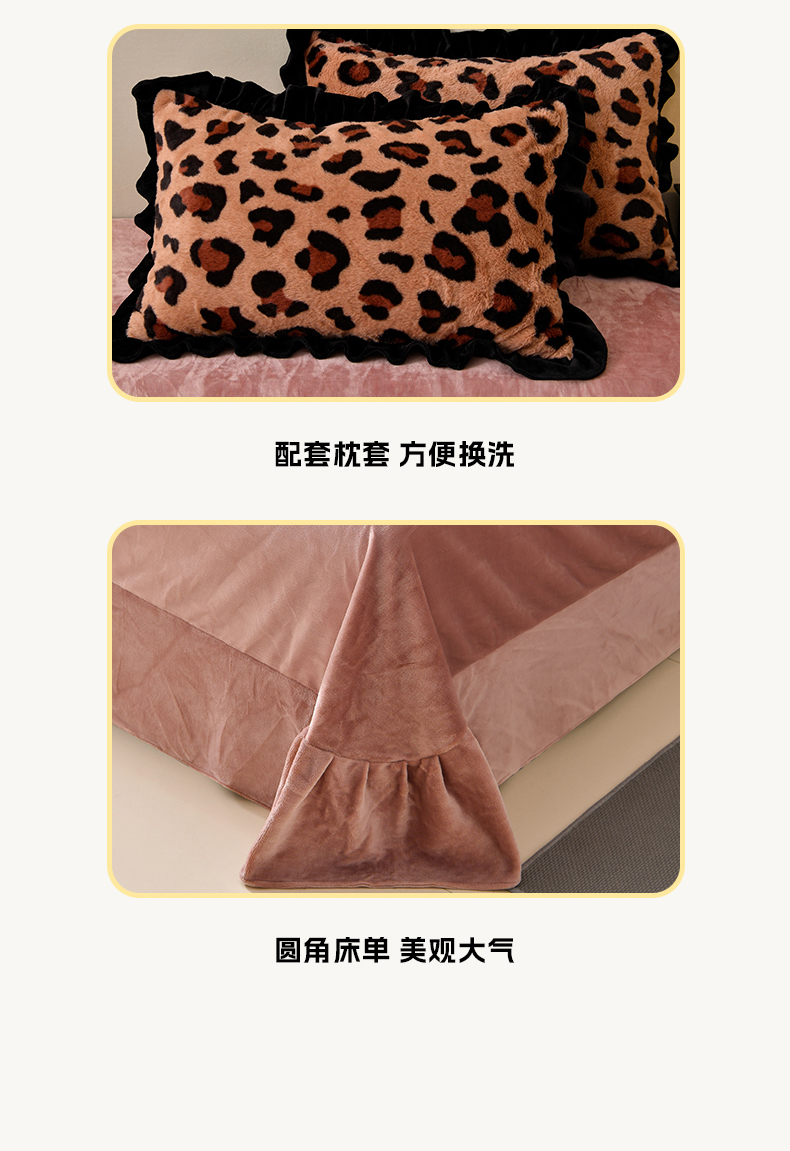 商品名称:梦之星 2025新款9斤重加厚皮草绒兔毛绒轻奢赫本风牛奶绒花边四件套 花边轻奢-小豹纹