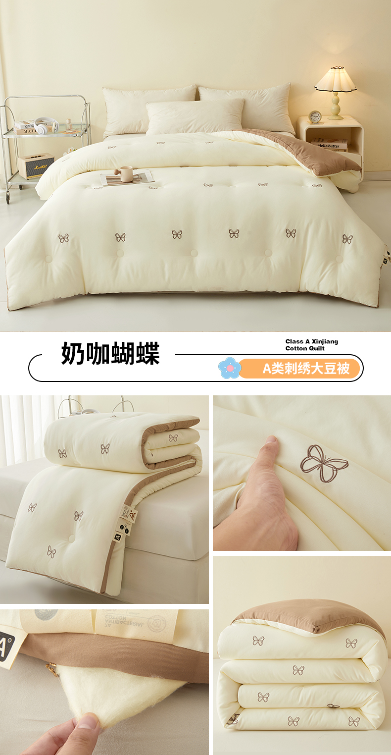 (总)维洋家纺 2025新款双层纱云感刺绣大豆被被子被芯,金棕蝴蝶结,奶咖蝴蝶,奶油蝴蝶结,奶油粉花朵,奶油绿花朵
