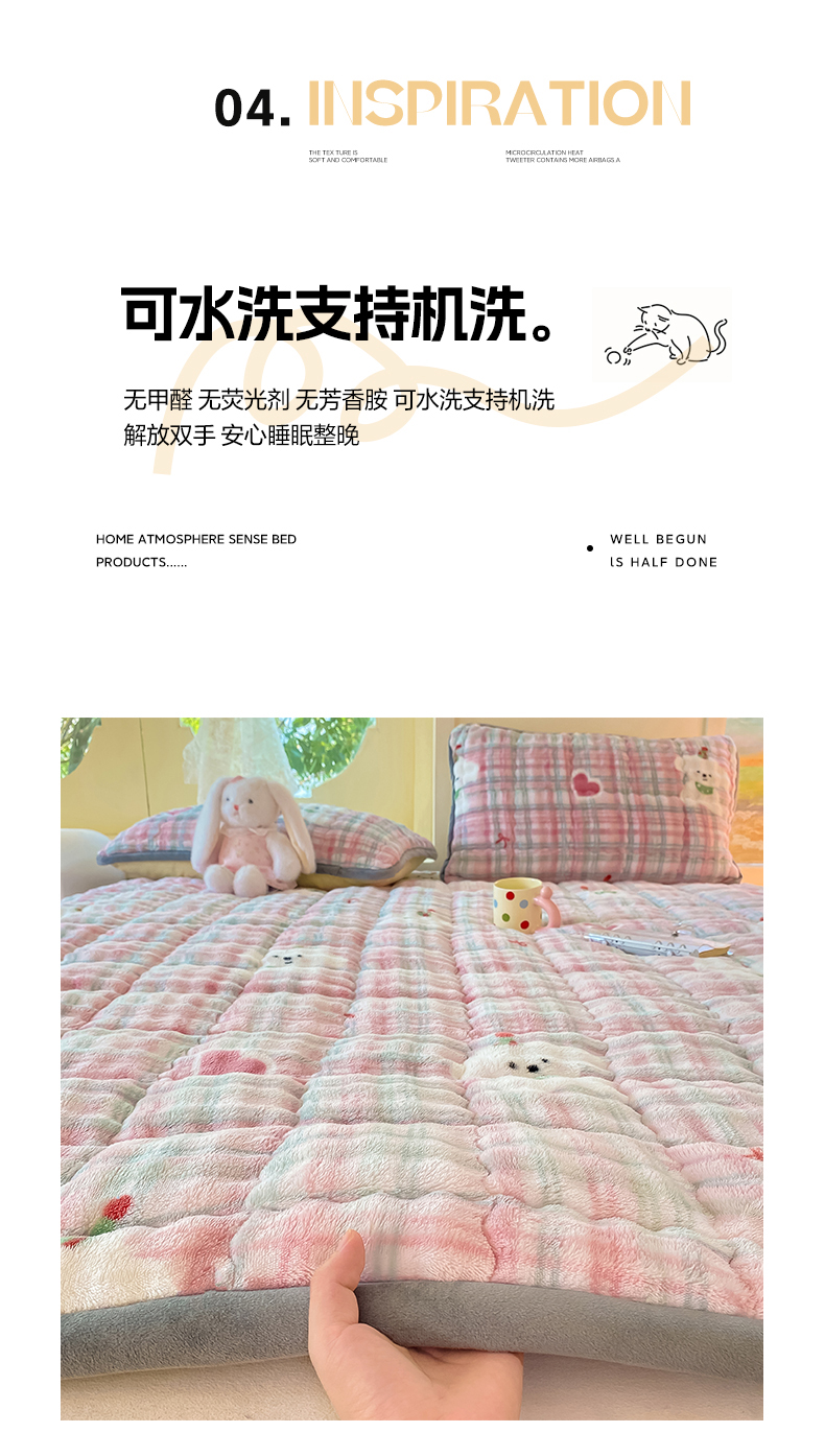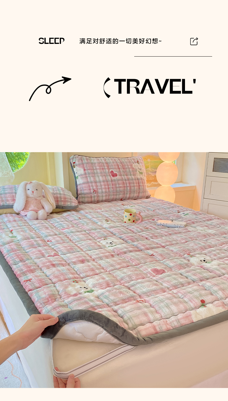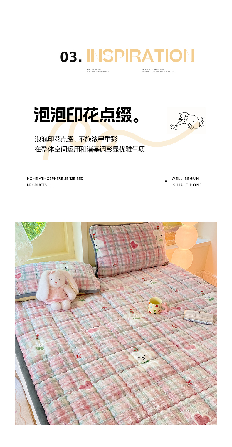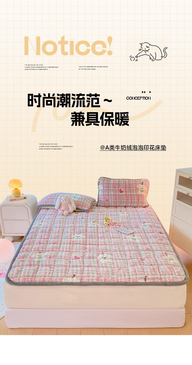 • 91家纺网 家纺一手货源 找家纺 眠势力 2025新款牛奶绒泡泡床垫加绒仿兔毛绒床褥子秋冬保暖珊瑚绒夹棉床护垫 格子小熊