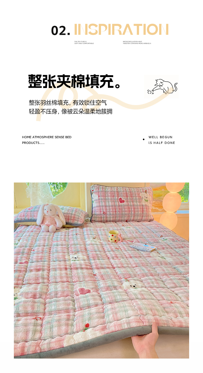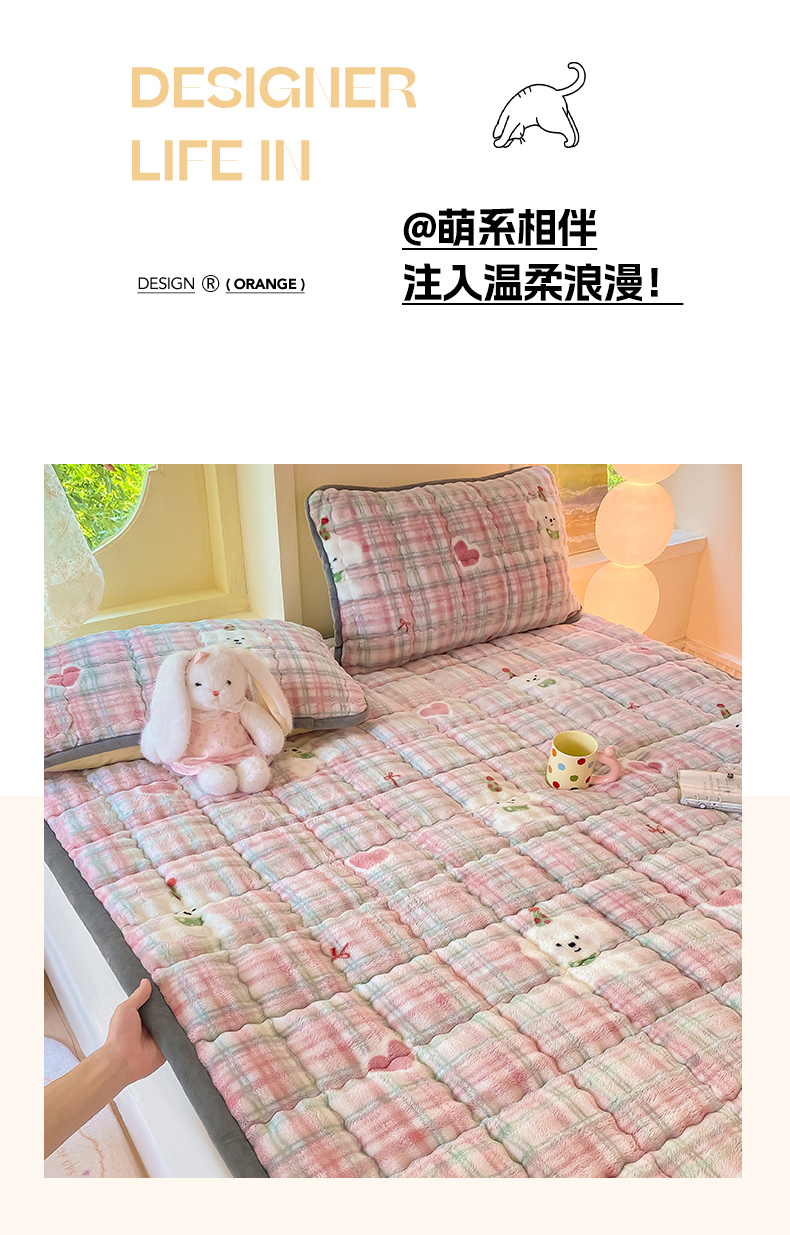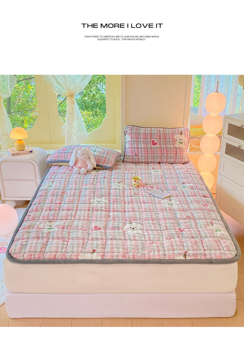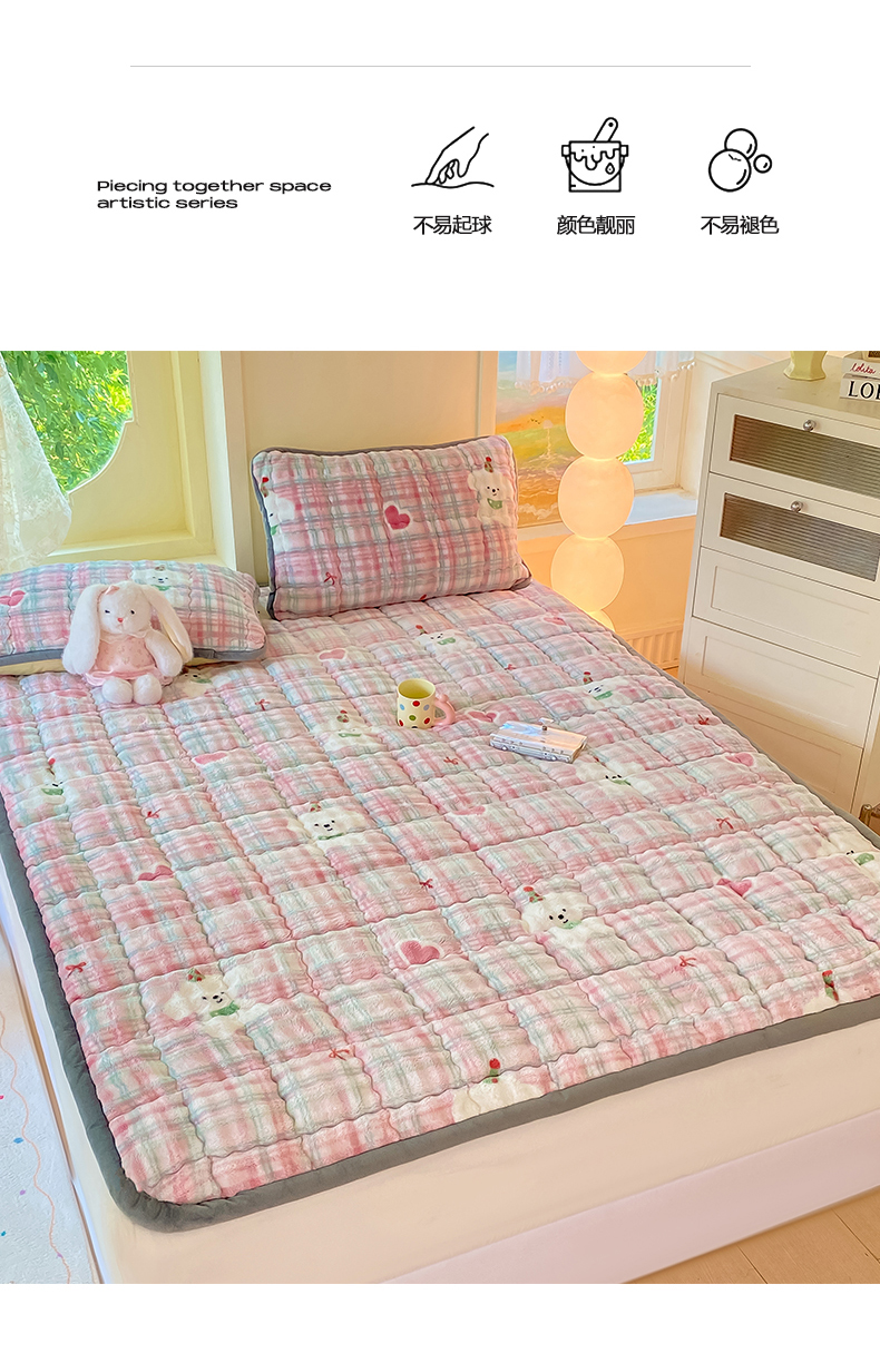 • 91家纺网 家纺一手货源 找家纺 眠势力 2025新款牛奶绒泡泡床垫加绒仿兔毛绒床褥子秋冬保暖珊瑚绒夹棉床护垫 格子小熊