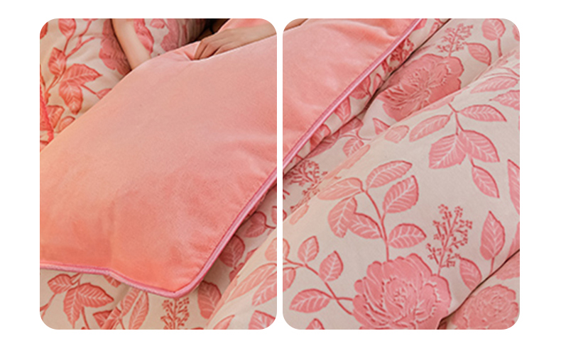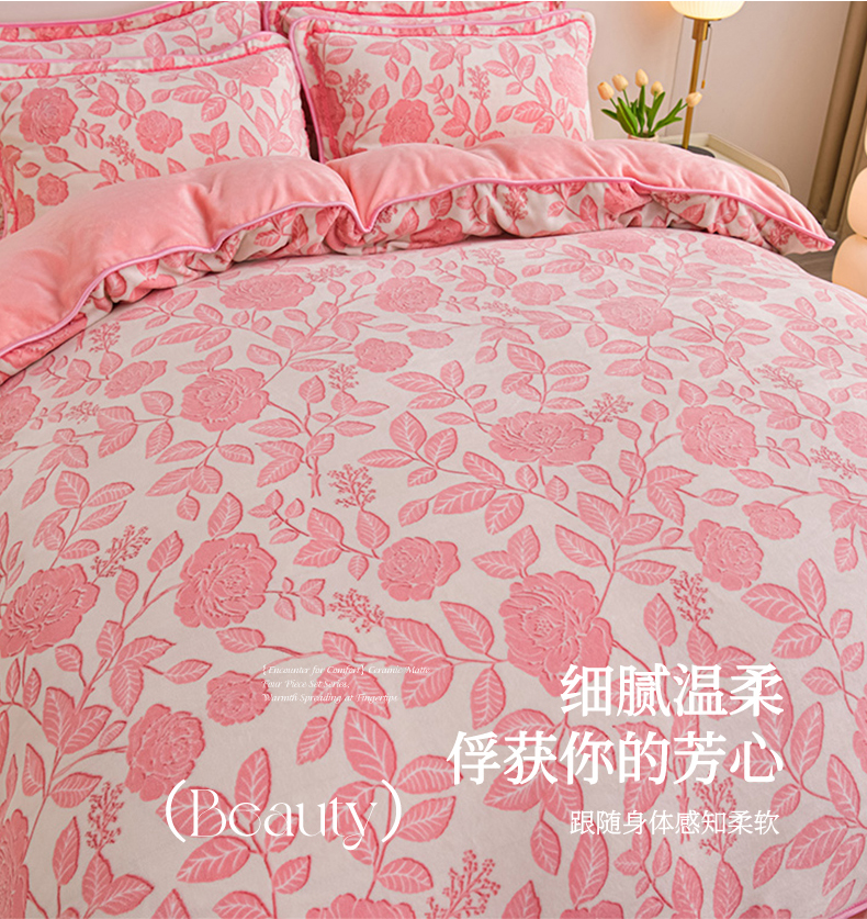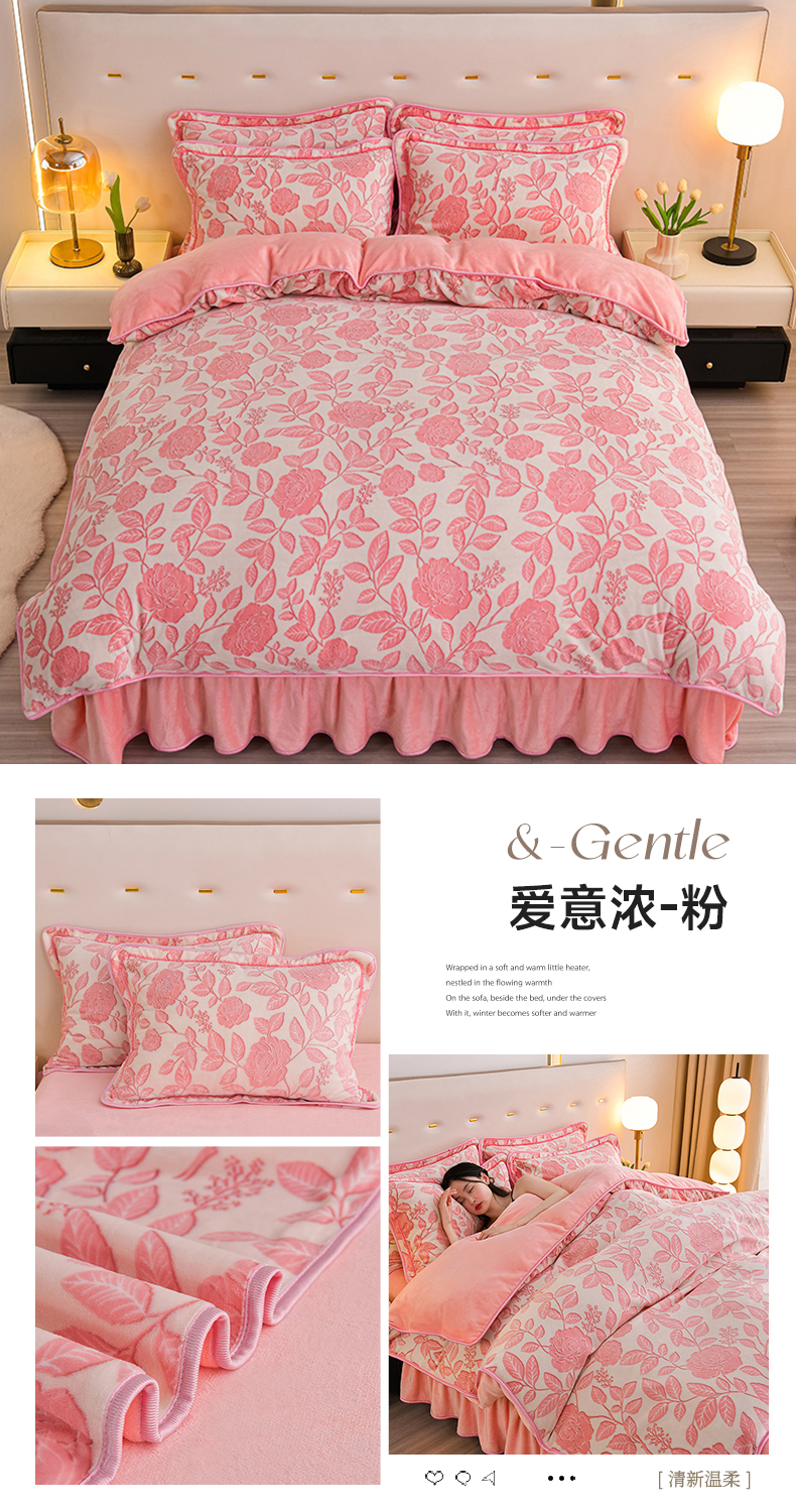 商品名称:赫本 2025新品8斤爆品牛奶绒四件套床裙款金雕绒法莱绒四套件 爱意浓-粉