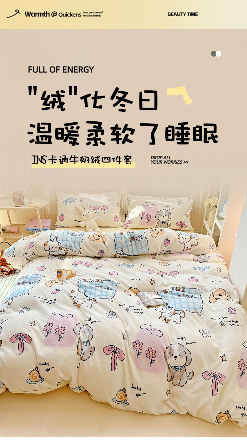 当前位置: 91家纺网 > 商品网购 > 床品套件 > 四件套 > 牛奶绒四件套 > 耀悦家纺 2025新款牛奶绒小清新高克重ins风卡通四件套 春日计划