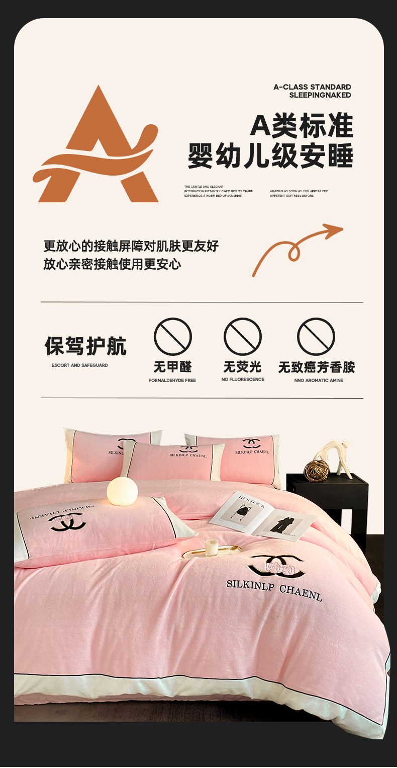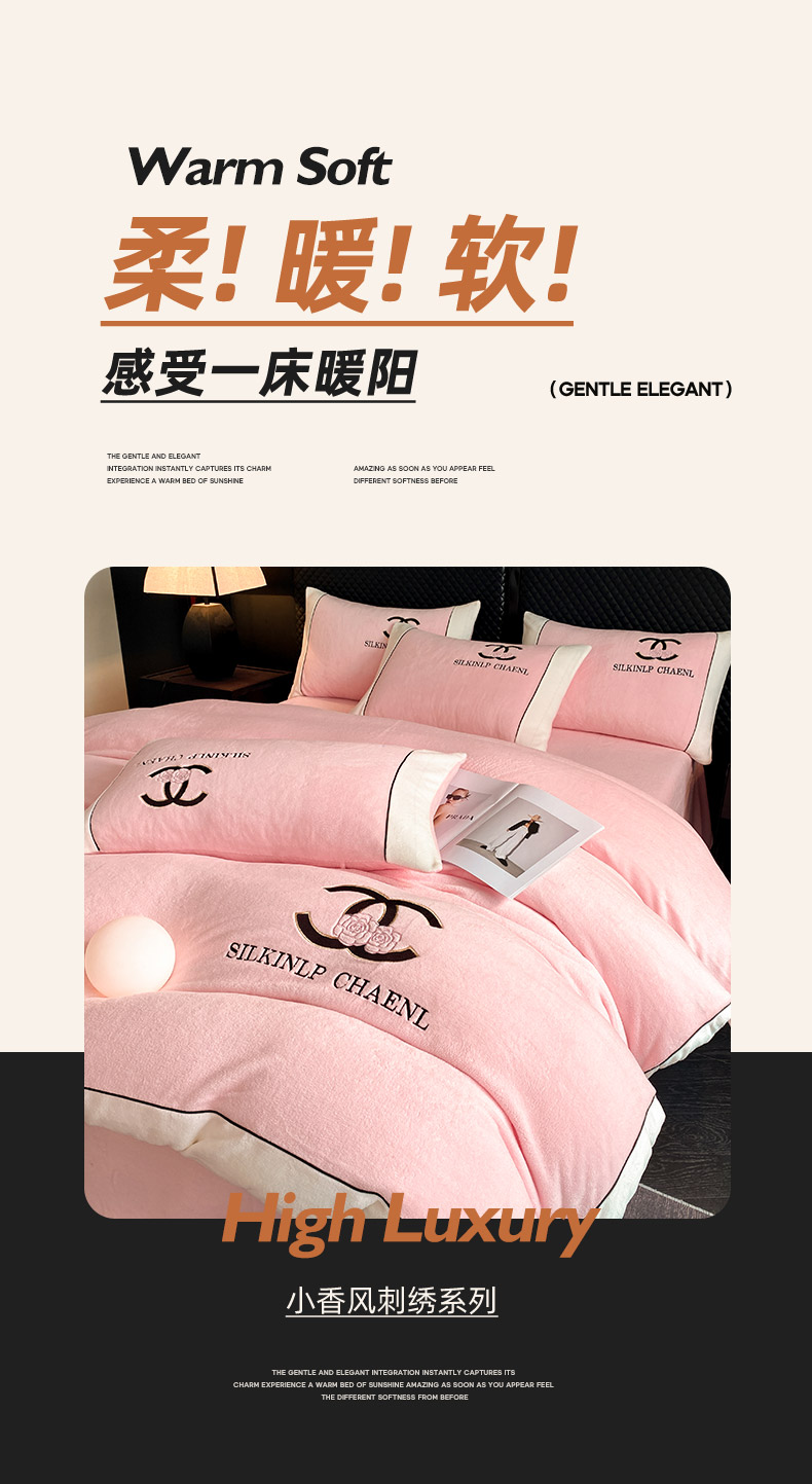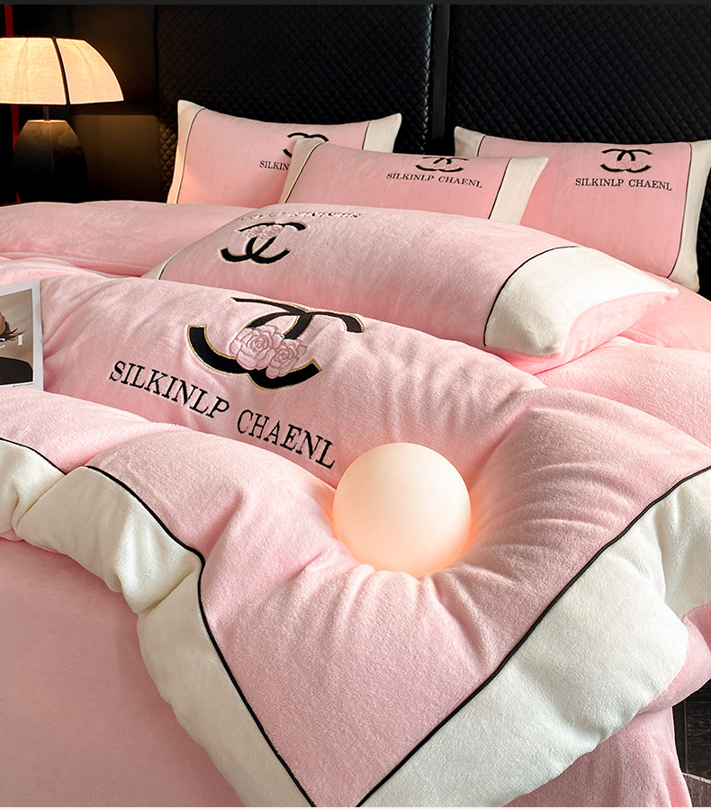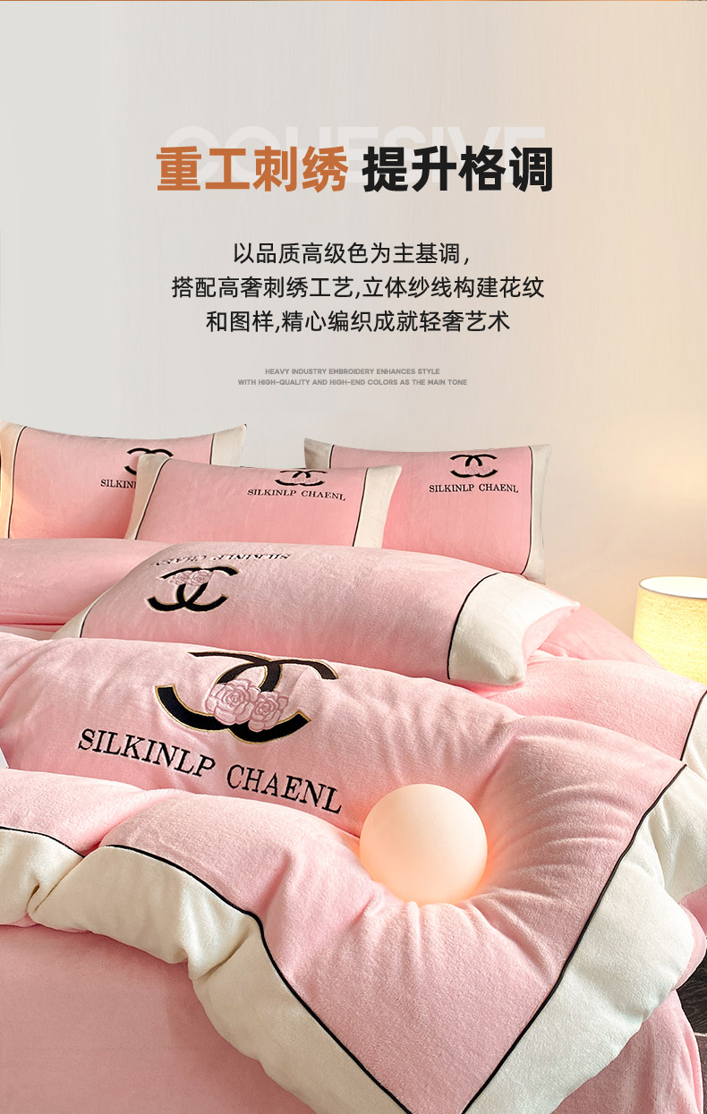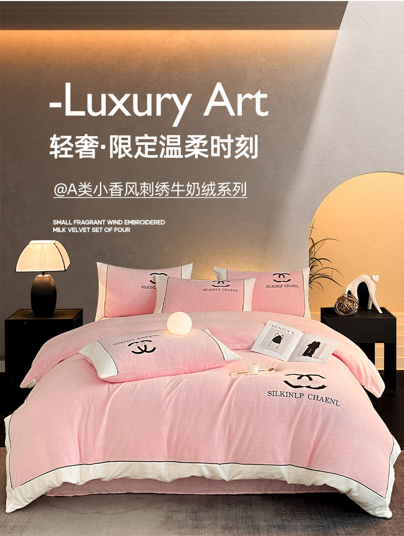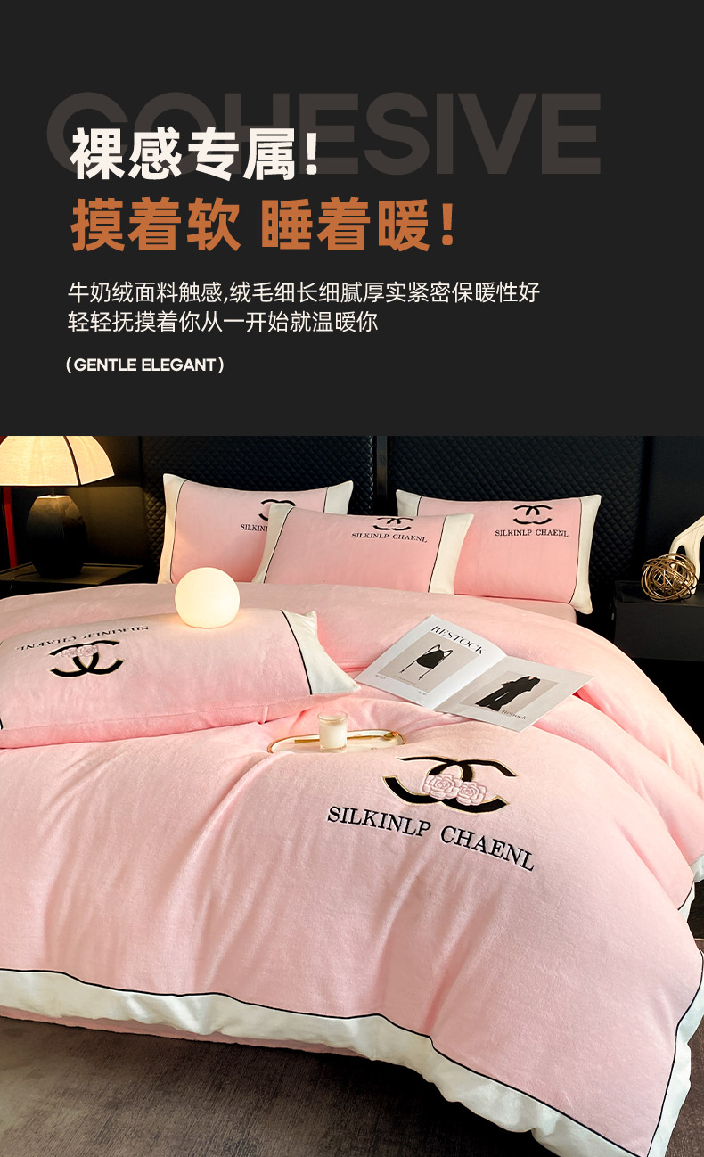 绒世界 2025秋冬小香风香奈系列牛奶绒四件套 樱花粉