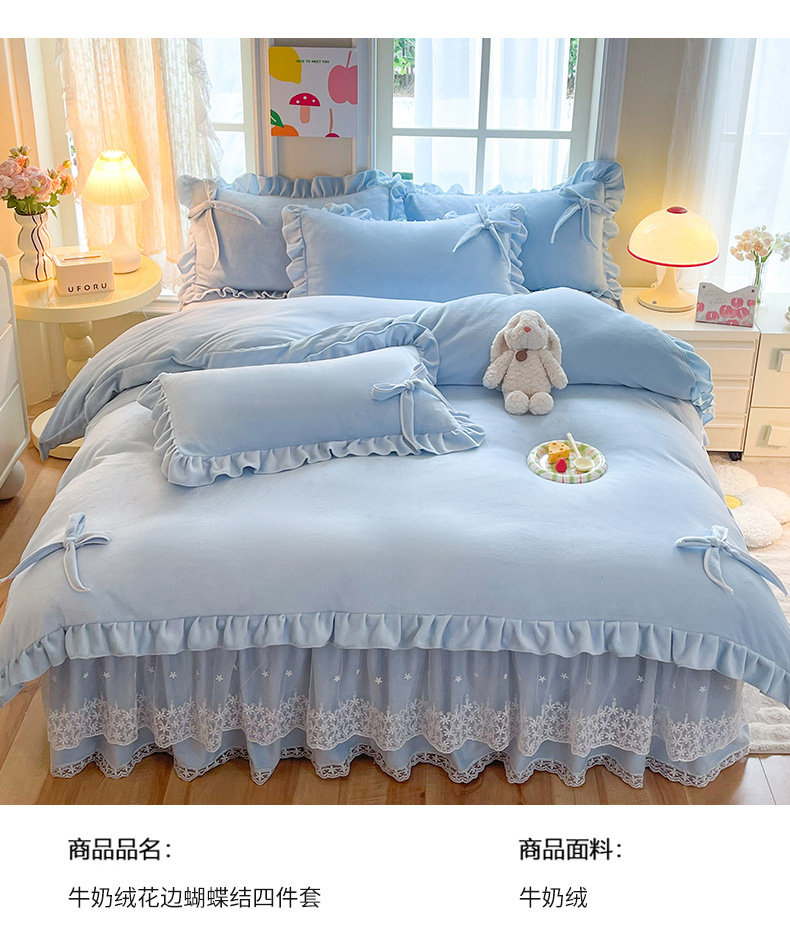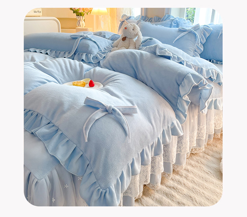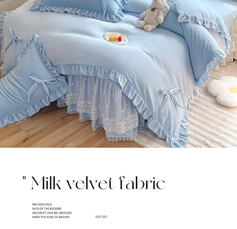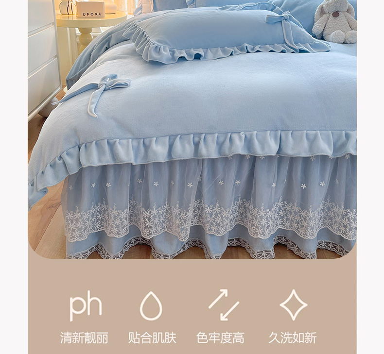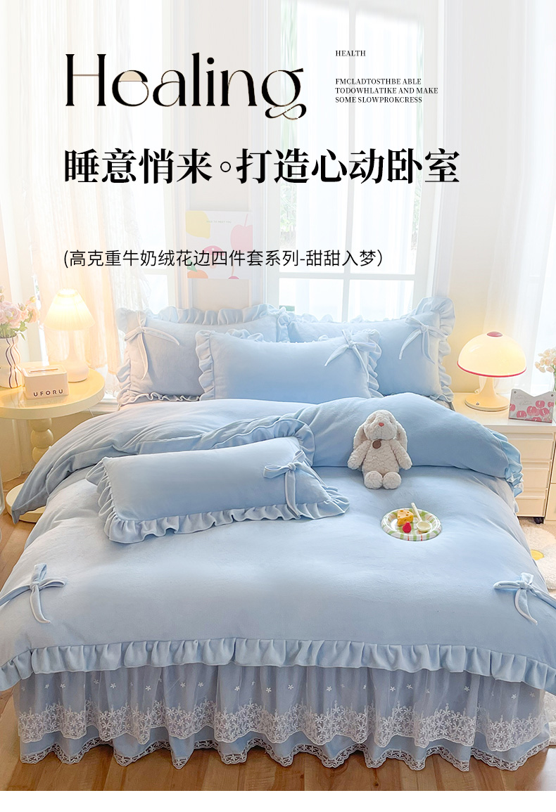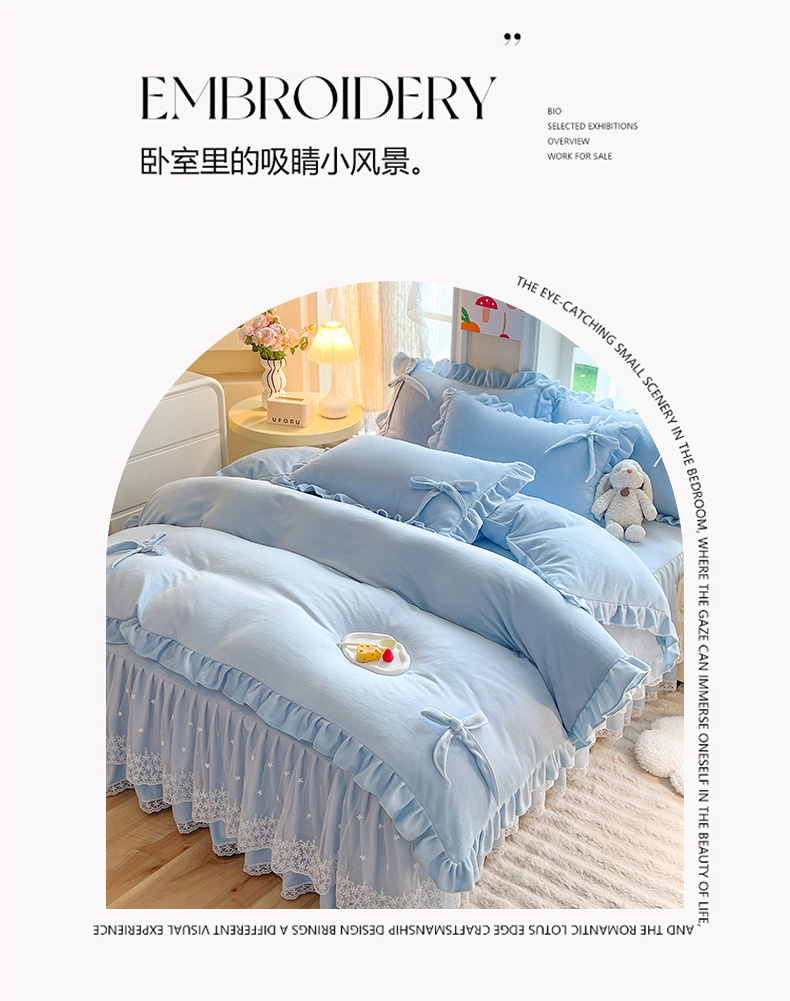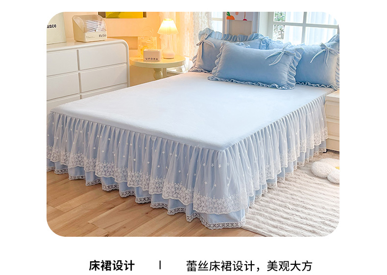 商品名称:后庭寝室 2025新款牛奶绒花边床裙四件套-浪漫花语系列 浪漫花语-天空蓝