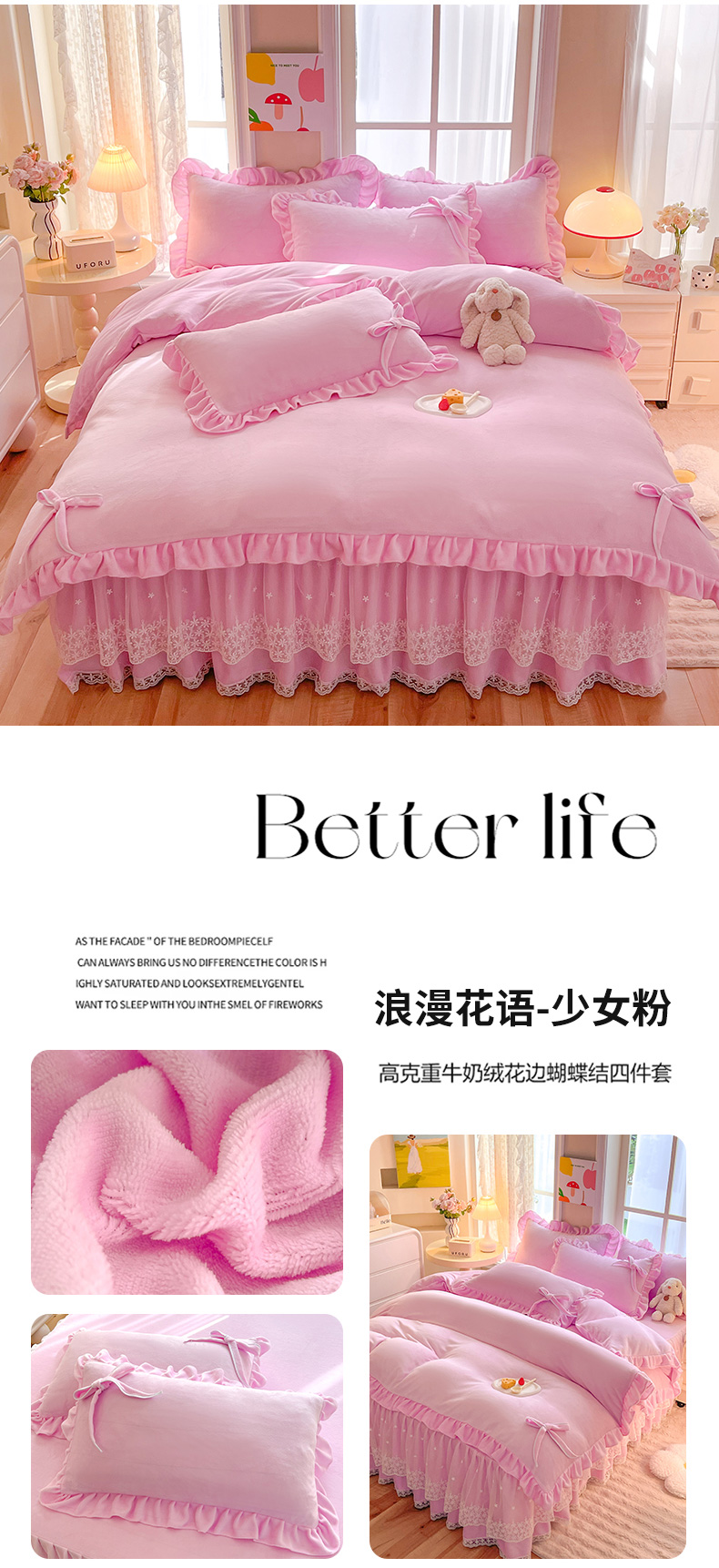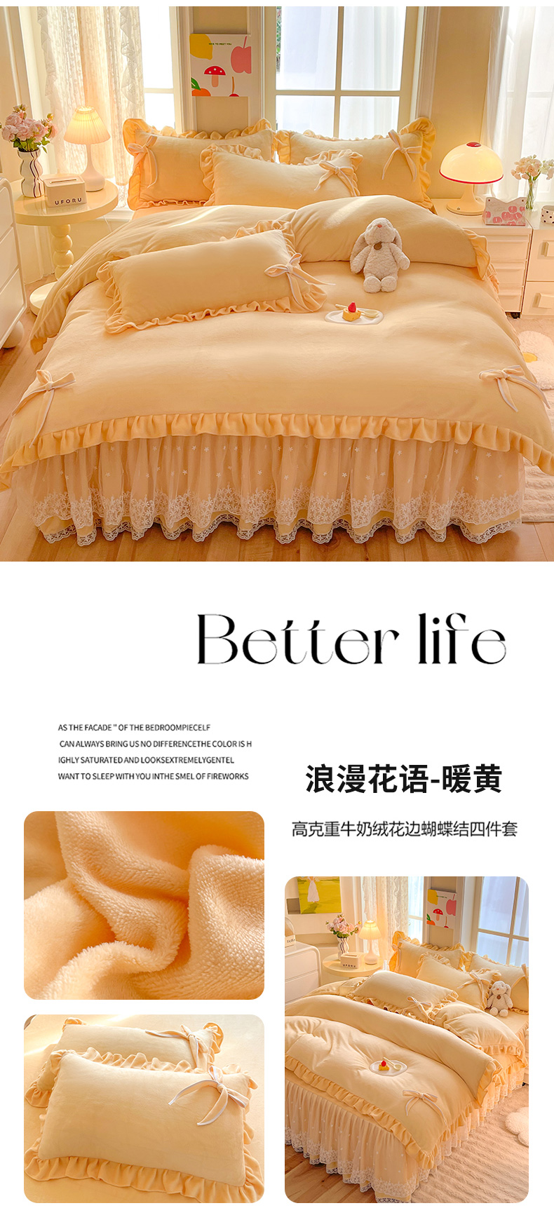 (总)后庭寝室 2025新款牛奶绒花边床裙四件套-浪漫花语系列,浪漫花语-暖黄,浪漫花语-公主玉,浪漫花语-梦幻紫,浪漫花语-暖粉玉,浪漫花语-少女粉,浪漫花语-天空蓝