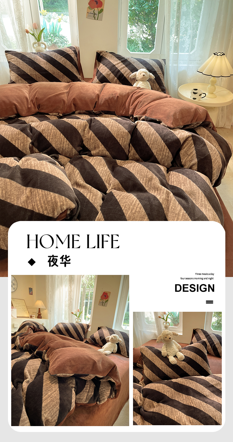花漾家居 2024新款无印格条纯色简约风牛奶绒三件套四件套被套床单床笠 格条-雅致条纹,格条-雅致条纹