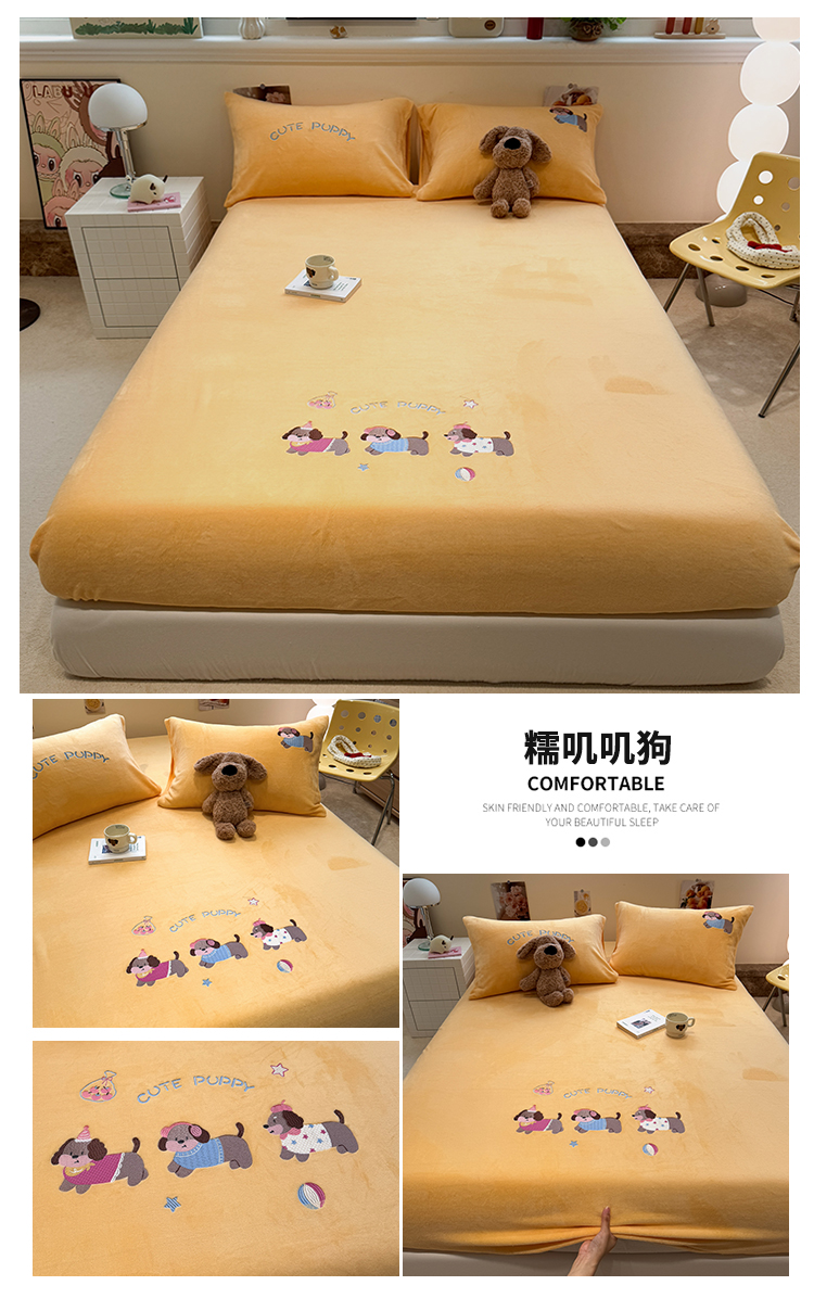 857家居 2025新款卡通牛奶绒刺绣床笠 糯叽叽狗