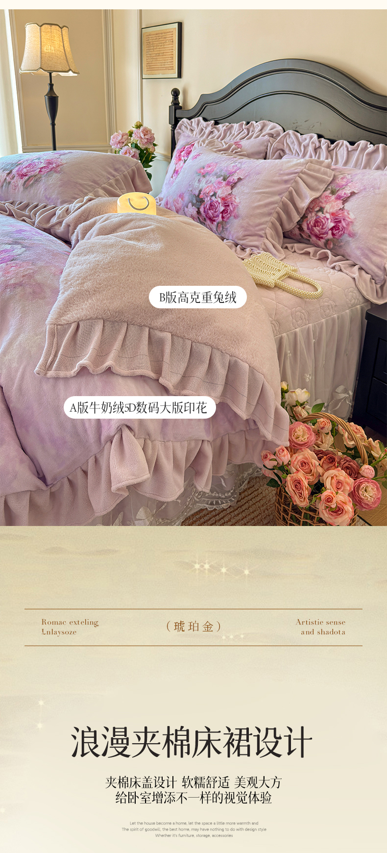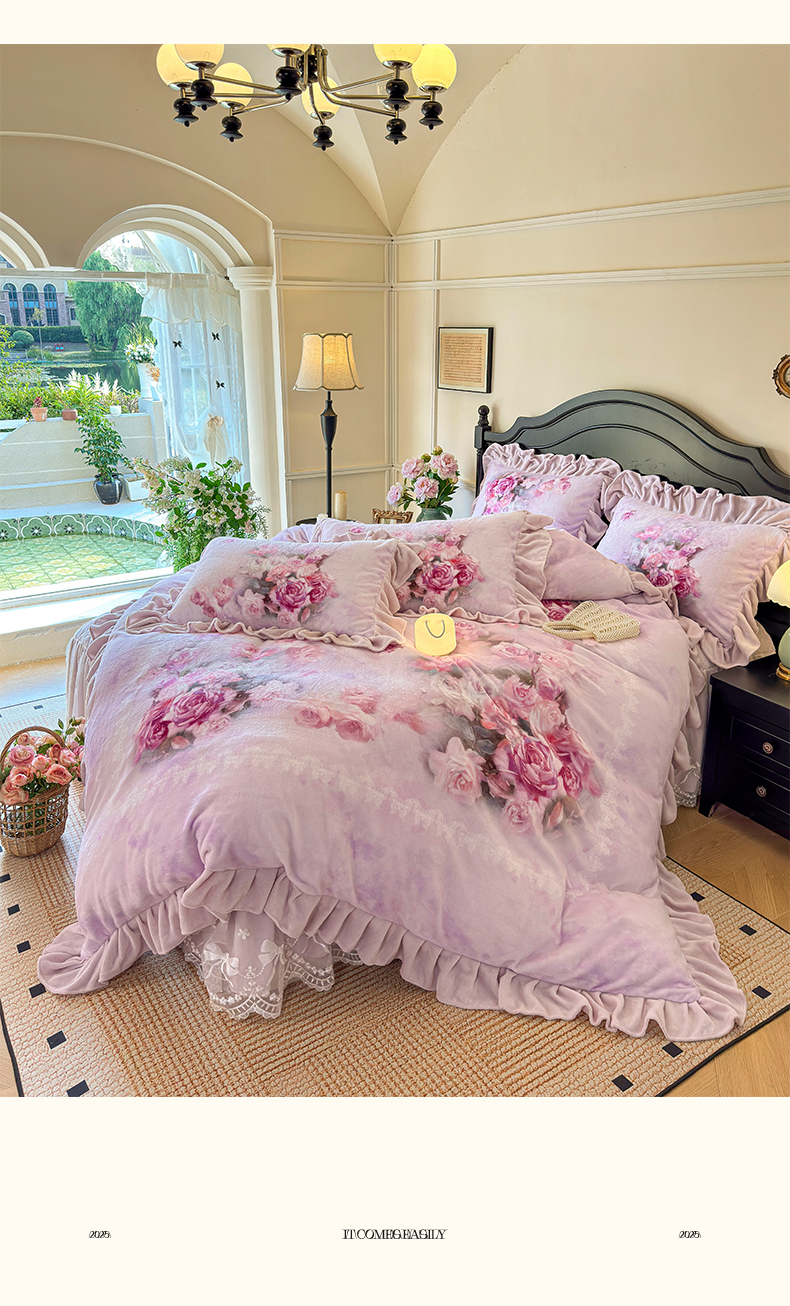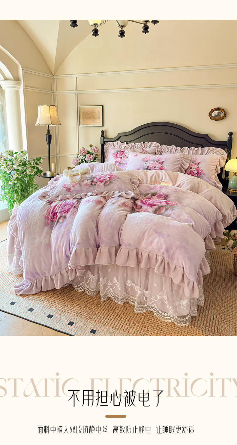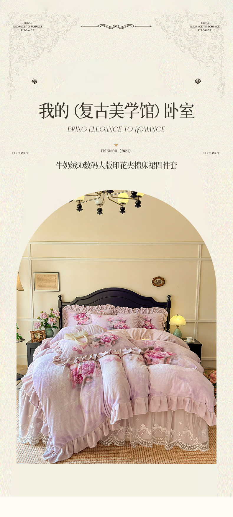 商品名称:宜凡家纺 2025新款牛奶绒5D数码大板印花床裙四件套 玫瑰庄园 紫