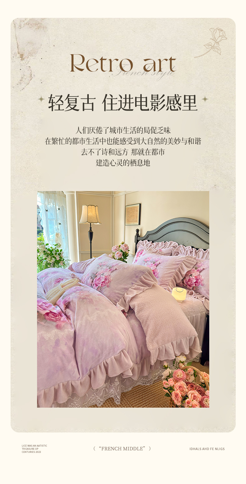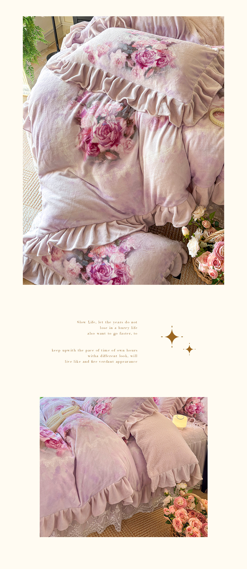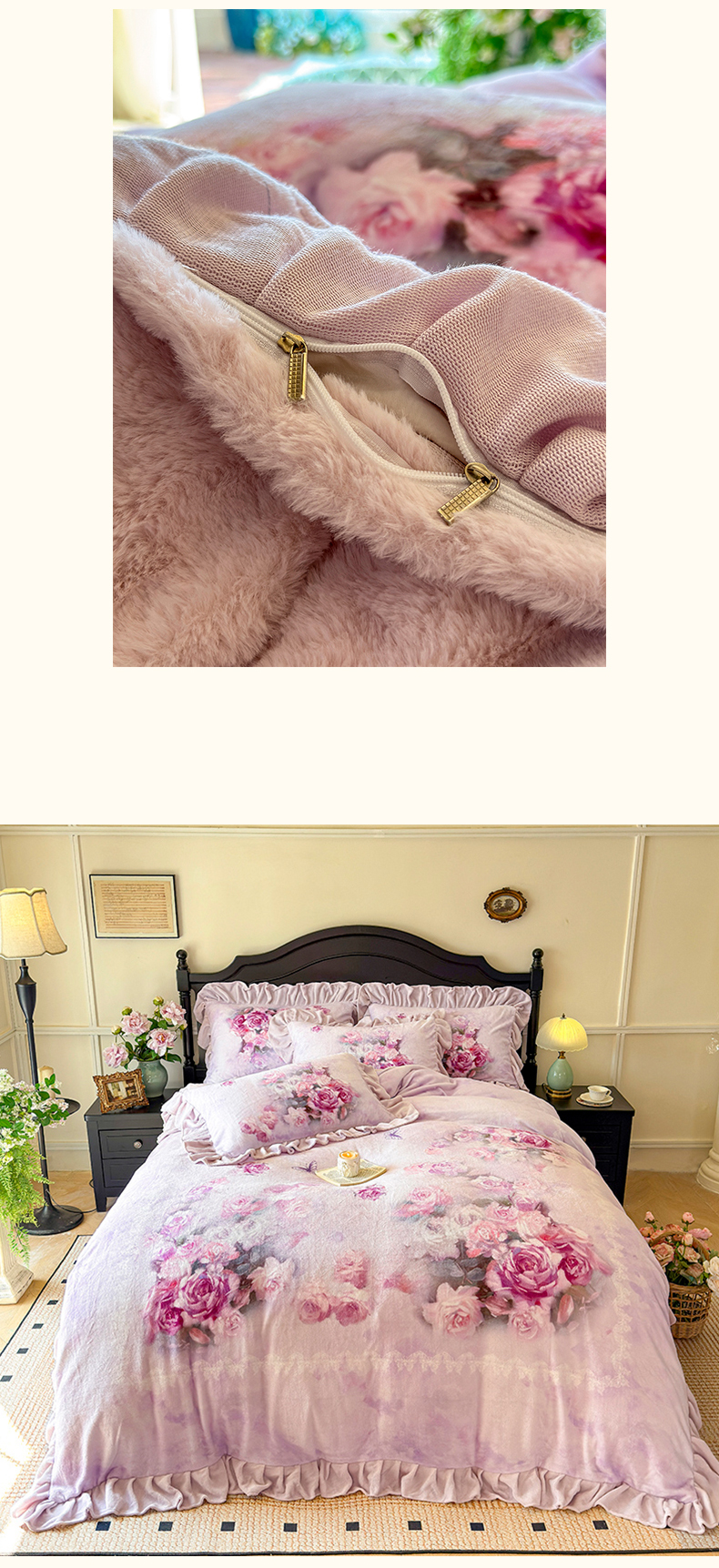 商品名称:宜凡家纺 2025新款牛奶绒5D数码大板印花床裙四件套 玫瑰庄园 紫