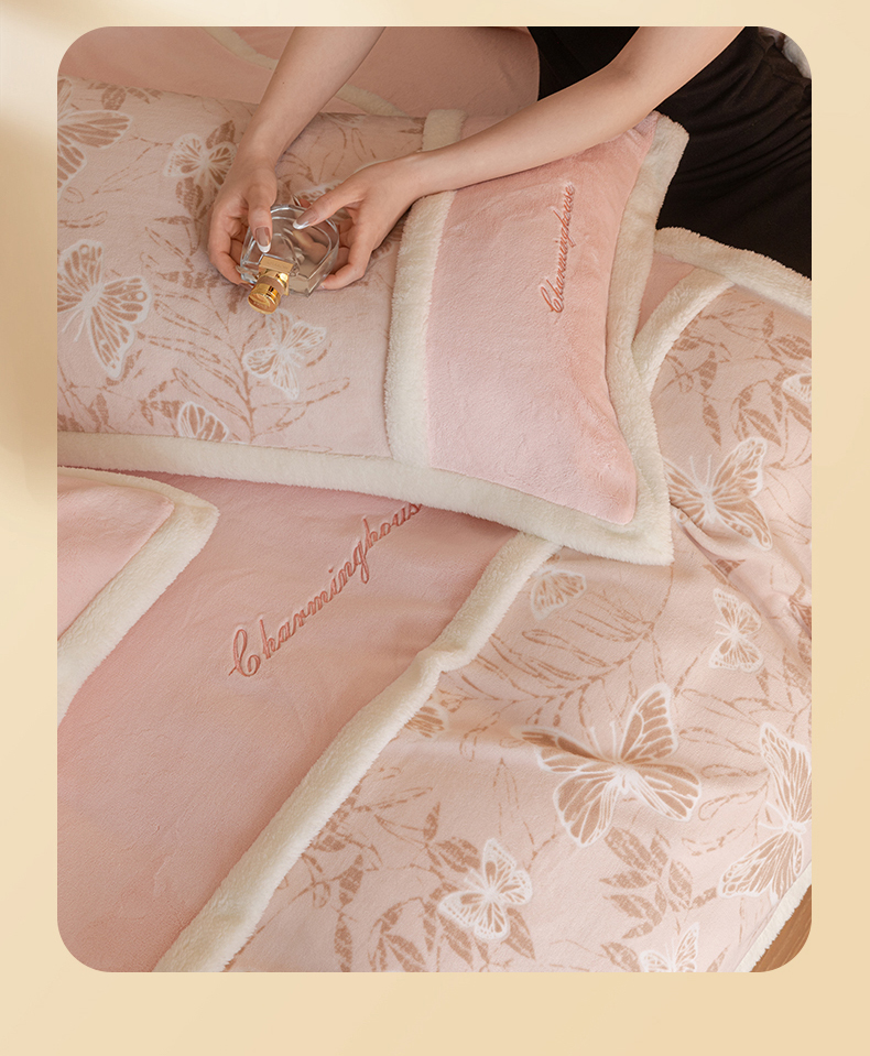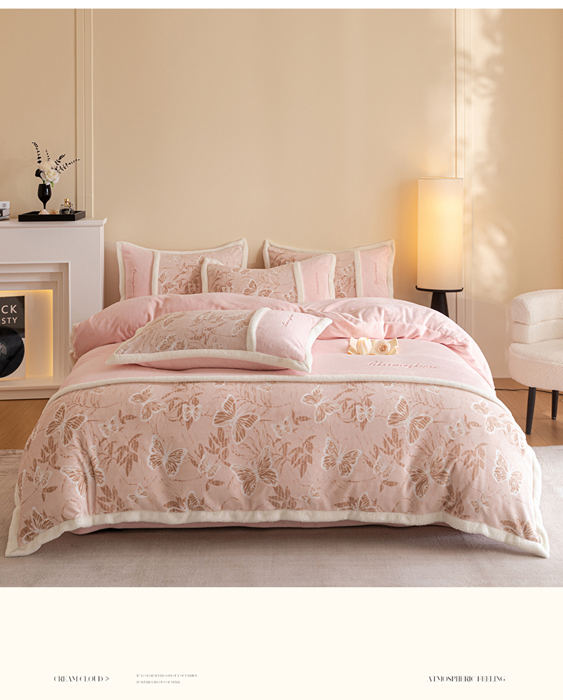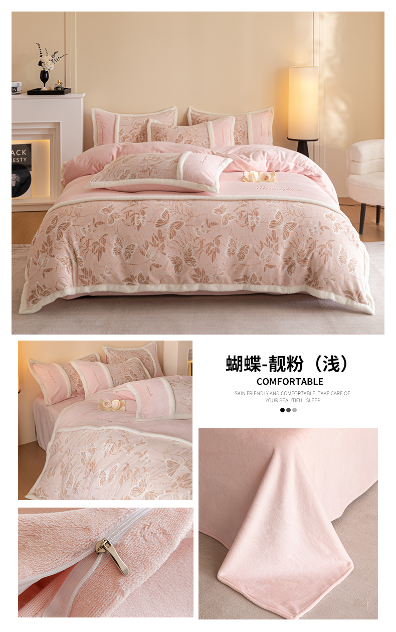 遇见家居生活馆 2025新款高克重雕花绒拼接刺绣四件套系列-艾菲妮 蝴蝶-靓粉(浅)