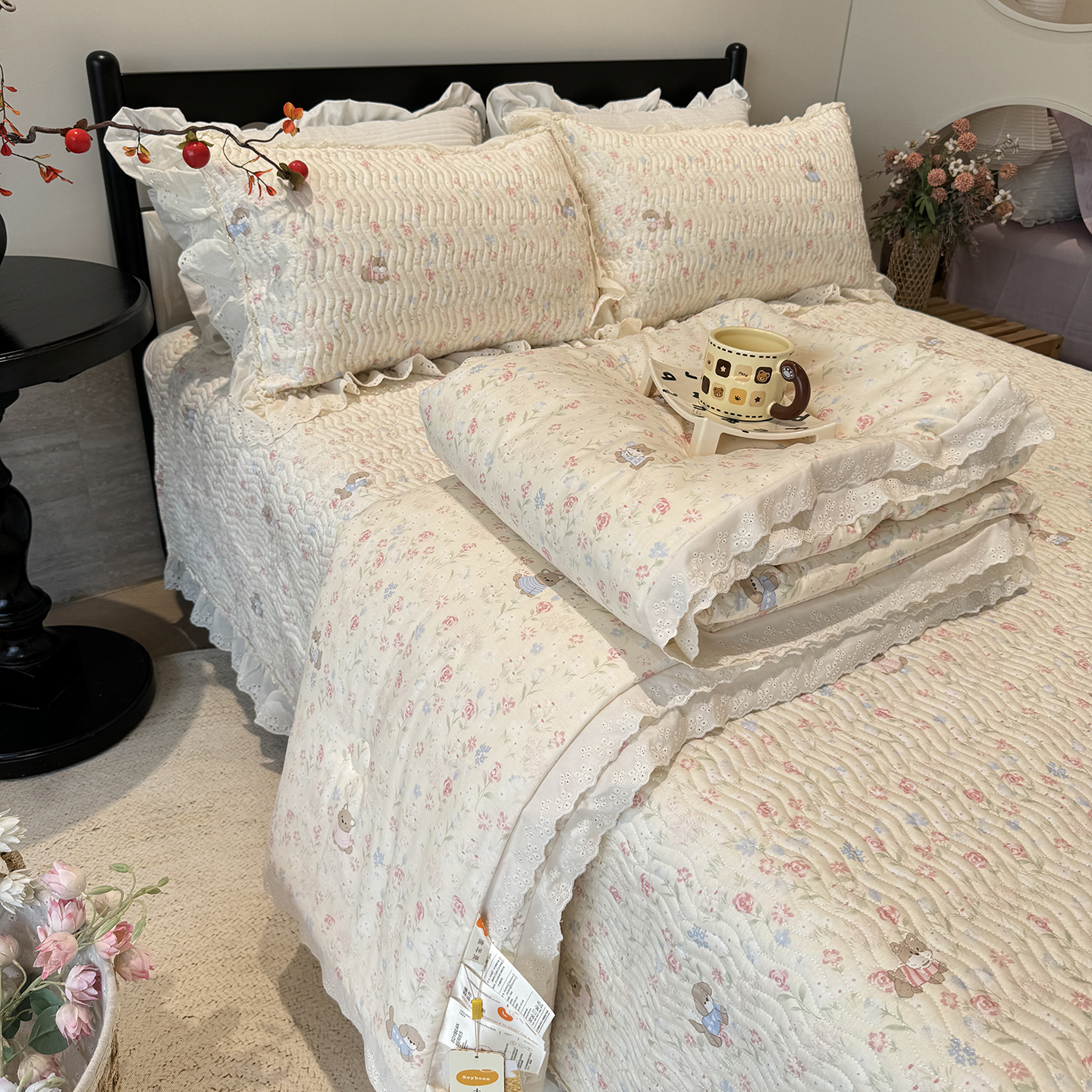 (总)奈萝家纺 2025新款全棉蕾丝花边床盖三件套四件套纯棉花边夏被,呆呆熊,花语绿,花语紫,柠檬,蔷薇,西瓜兔,夏蓝,夏梦,夏之语,小花熊,樱花