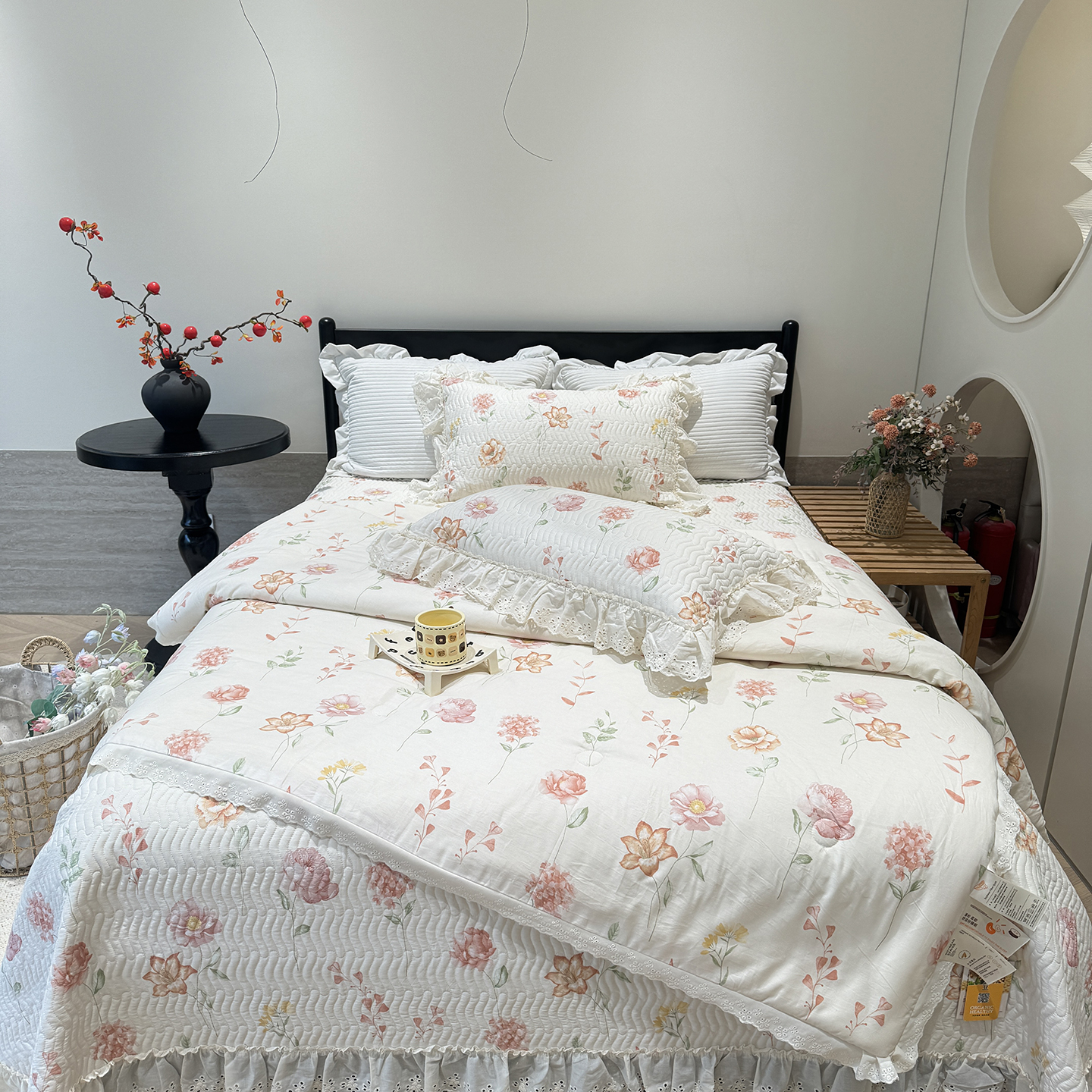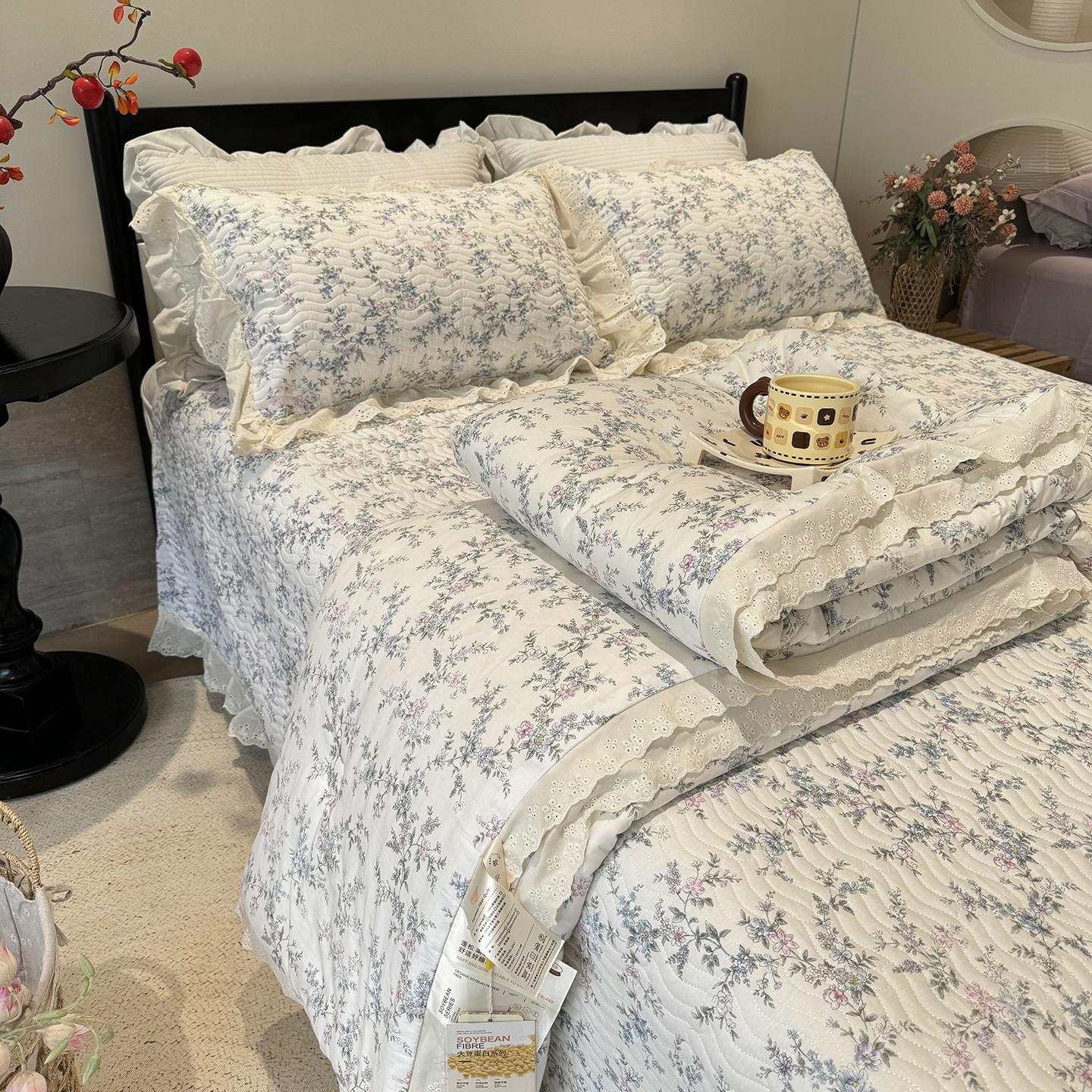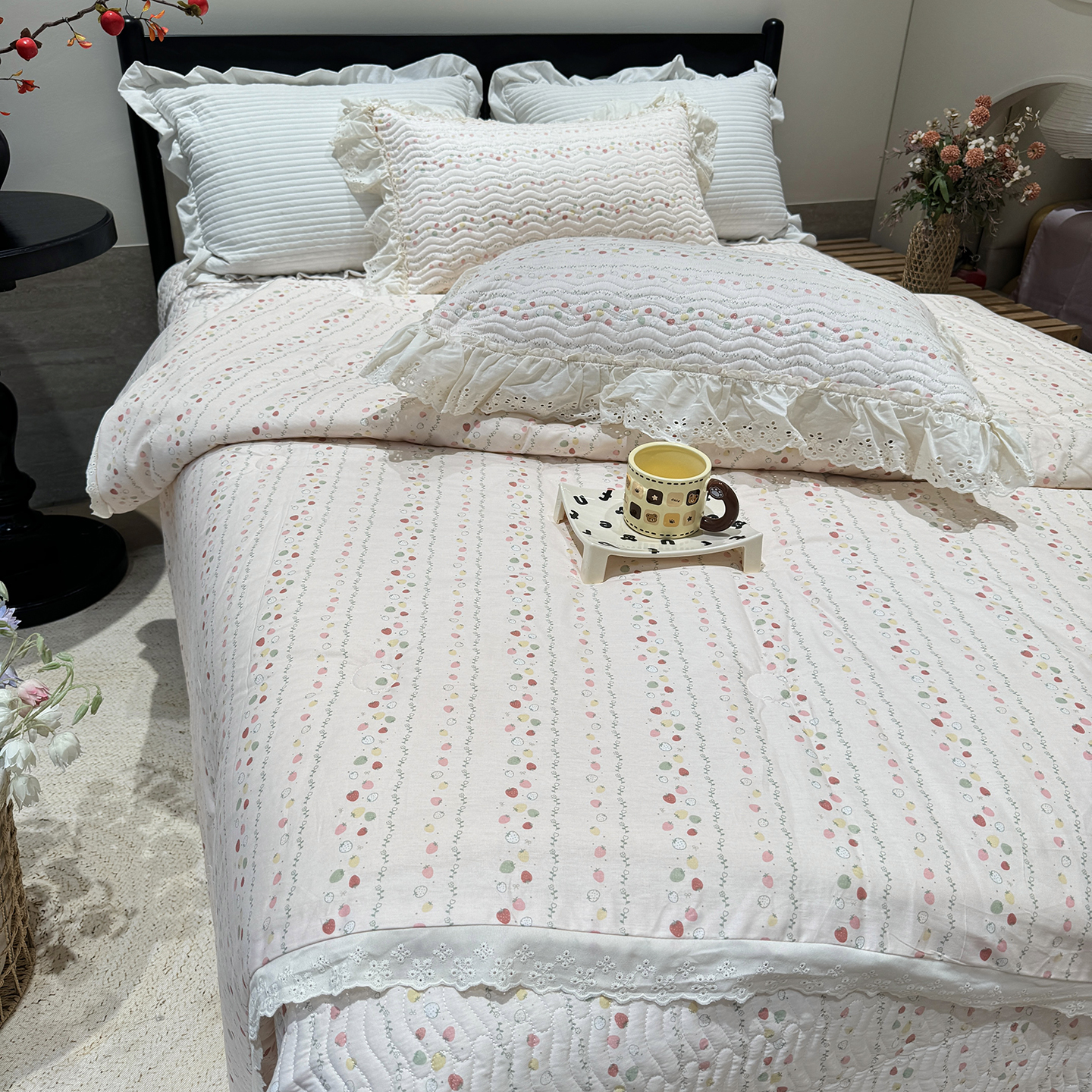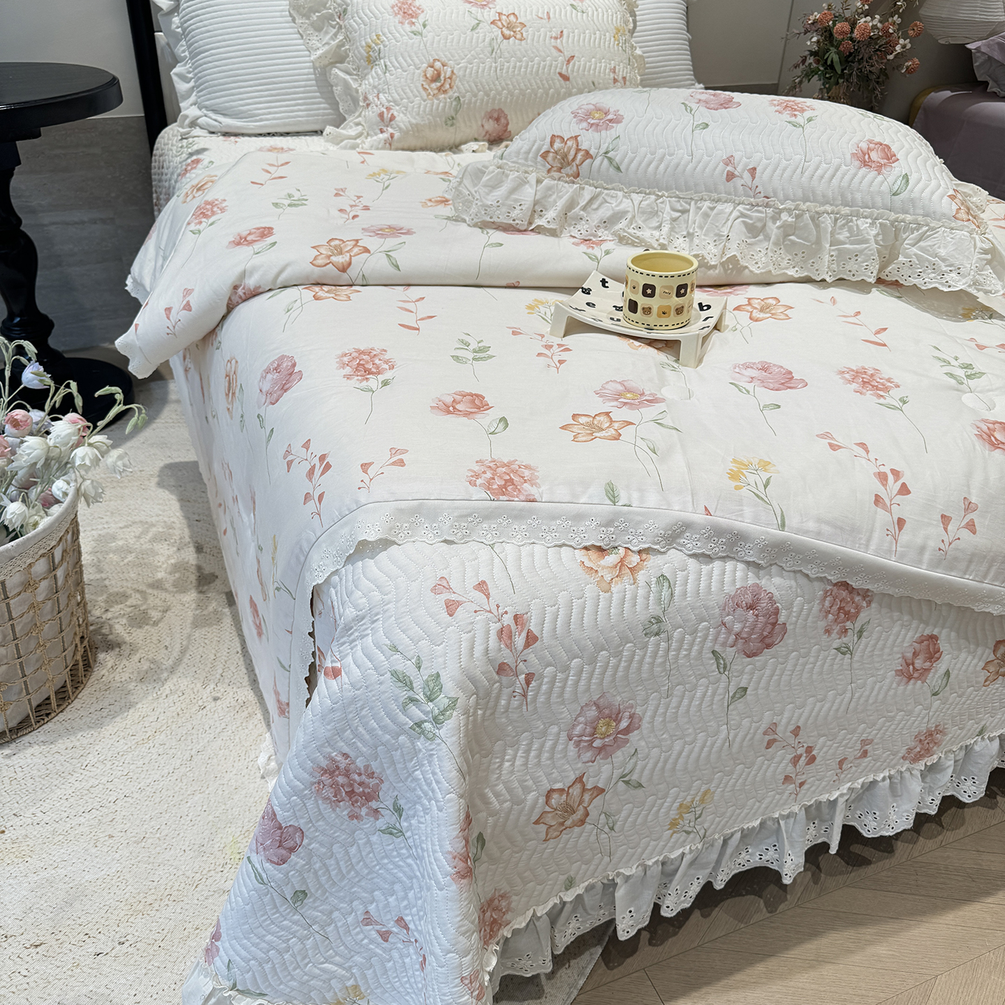 奈萝家纺 2025新款全棉蕾丝花边被套春秋被床盖四件套床盖三件套 樱桃可可
