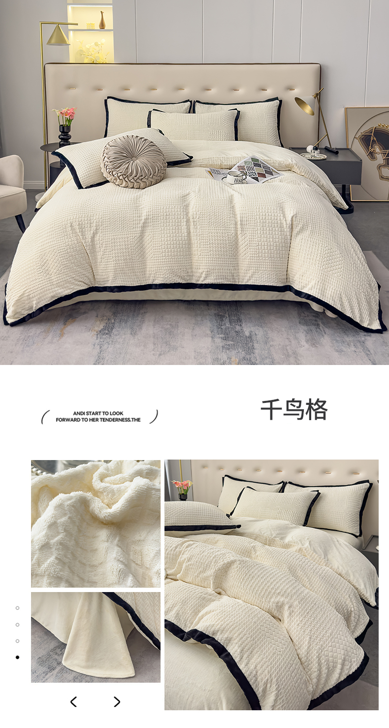 商品名称:好阁家纺 2025新款极简小香风雕花牛奶绒黑边四件套-风格一 千鸟格