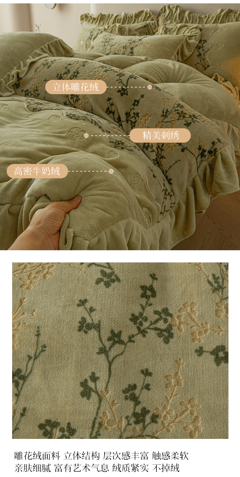 宜凡家纺 2025新款牛奶绒雕花刺绣夹棉床裙四件套 寒梅絮语 灰